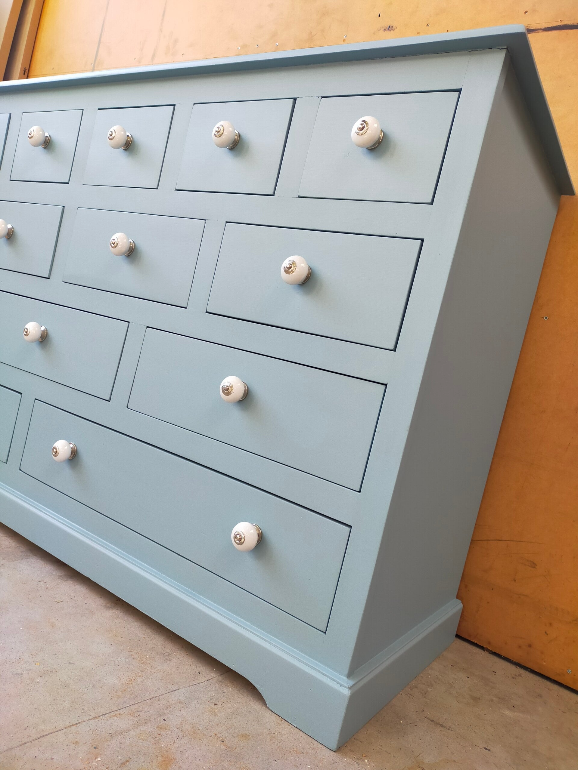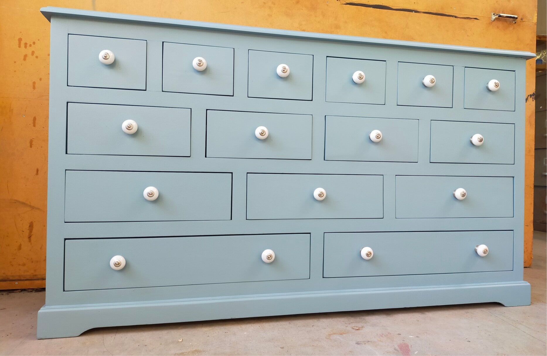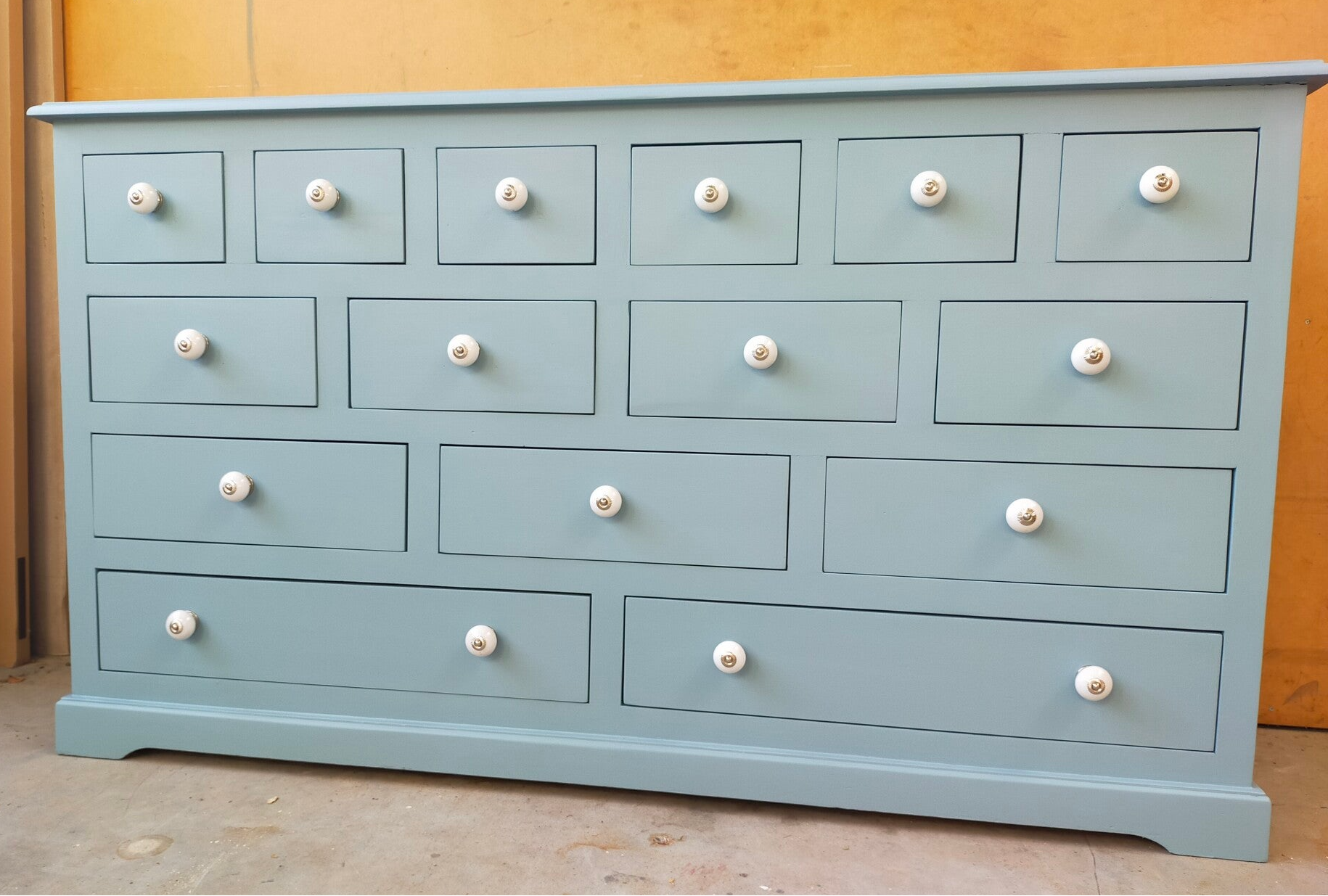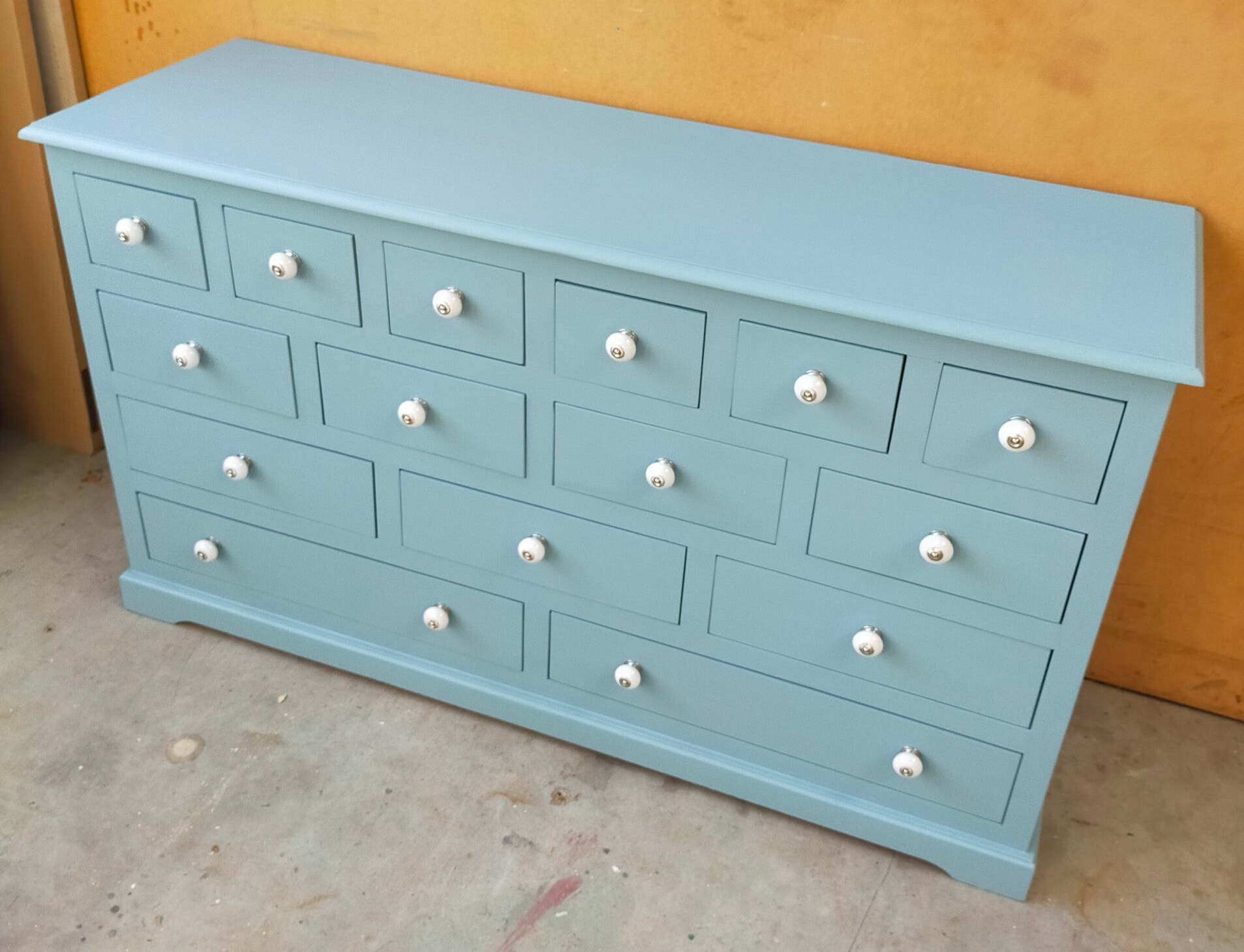 Zoek je een kanjer van een kast, met veel lades en opbergruimte? Nou....dat is deze mooierd. Deze apothekerskast kent maar liefst 15 lades welke zijn afgewerkt met mooie frisse en bijpassende porseleinen knoppen. De lades lopen allemaal lekker soepel en door de frisse en mooie kleur Champness, van Fusion Mineral Paint, is deze kanjer echt een lust voor het oog. Als dressoir in de woonkamer kan hij goed dienst doen, maar natuurlijk ook als commode op een babykamer.....of wat dacht je van een eyecather in de slaapkamer?? Maw, genoeg mogelijkheden!
