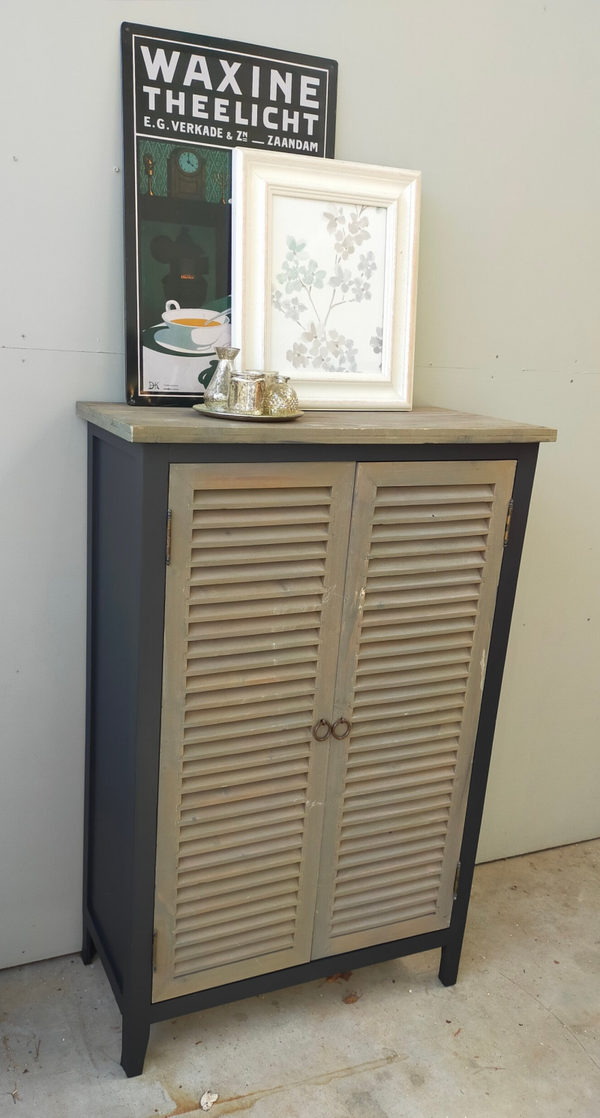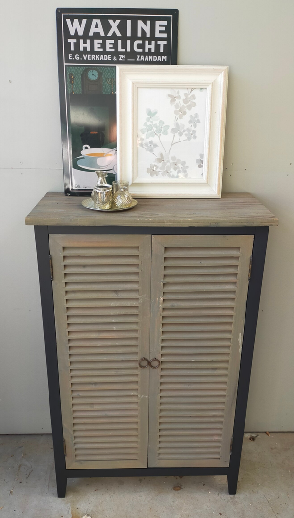 Dit kastje heeft aangename afmetingen en in combinatie met zijn kleur en het orginele hout komt dit samen tot een prettig geheel. De kleur is Ash, van Fusion Mineral Paint, hetgeen zich als een diep donker antraciet laat omschrijven. Achter de deurtjes heerlijk wat planken, dus genoeg opbergruimte. Uiteraard maken de louvre deurtjes het kastje helemaal een leukerd!