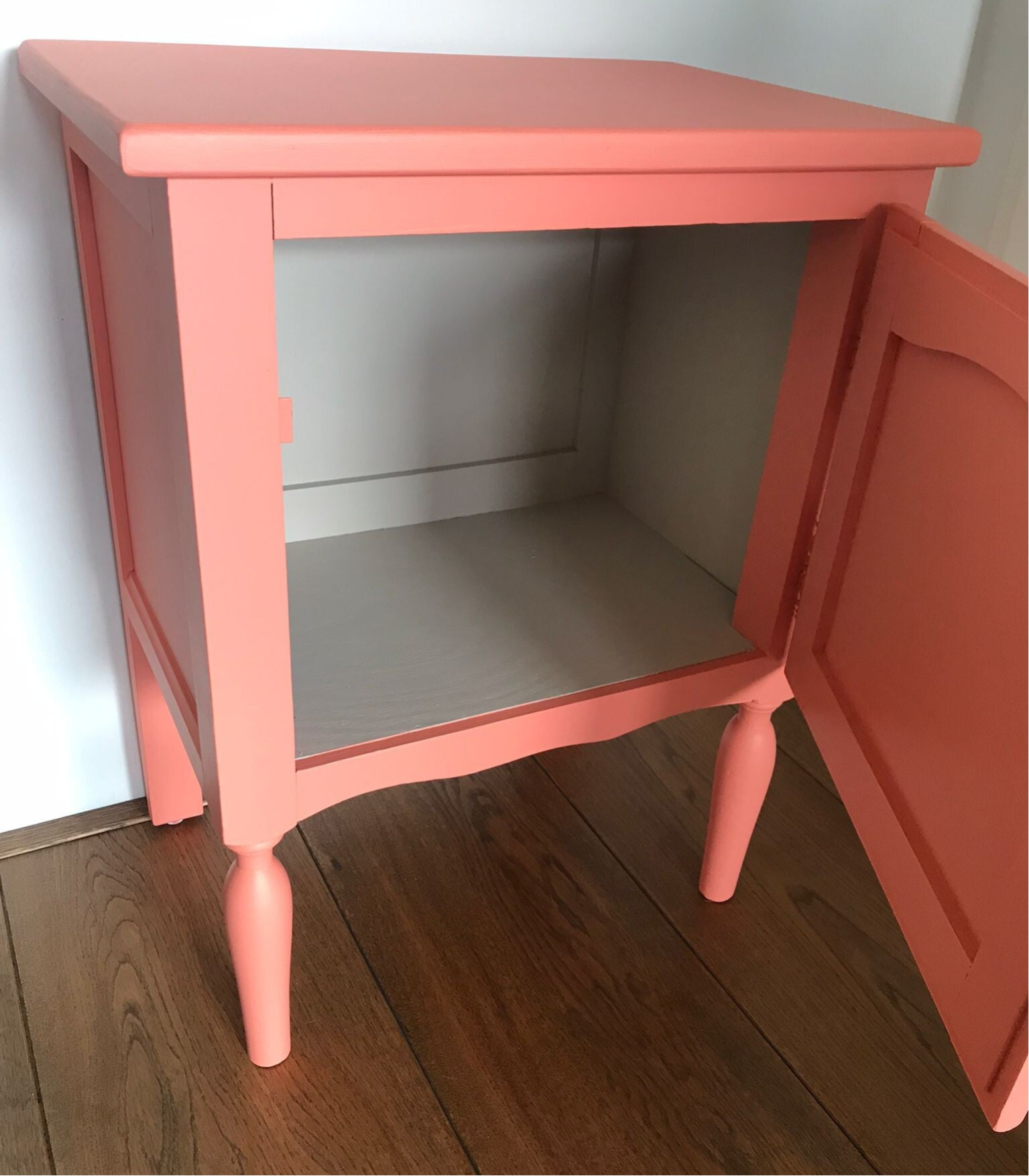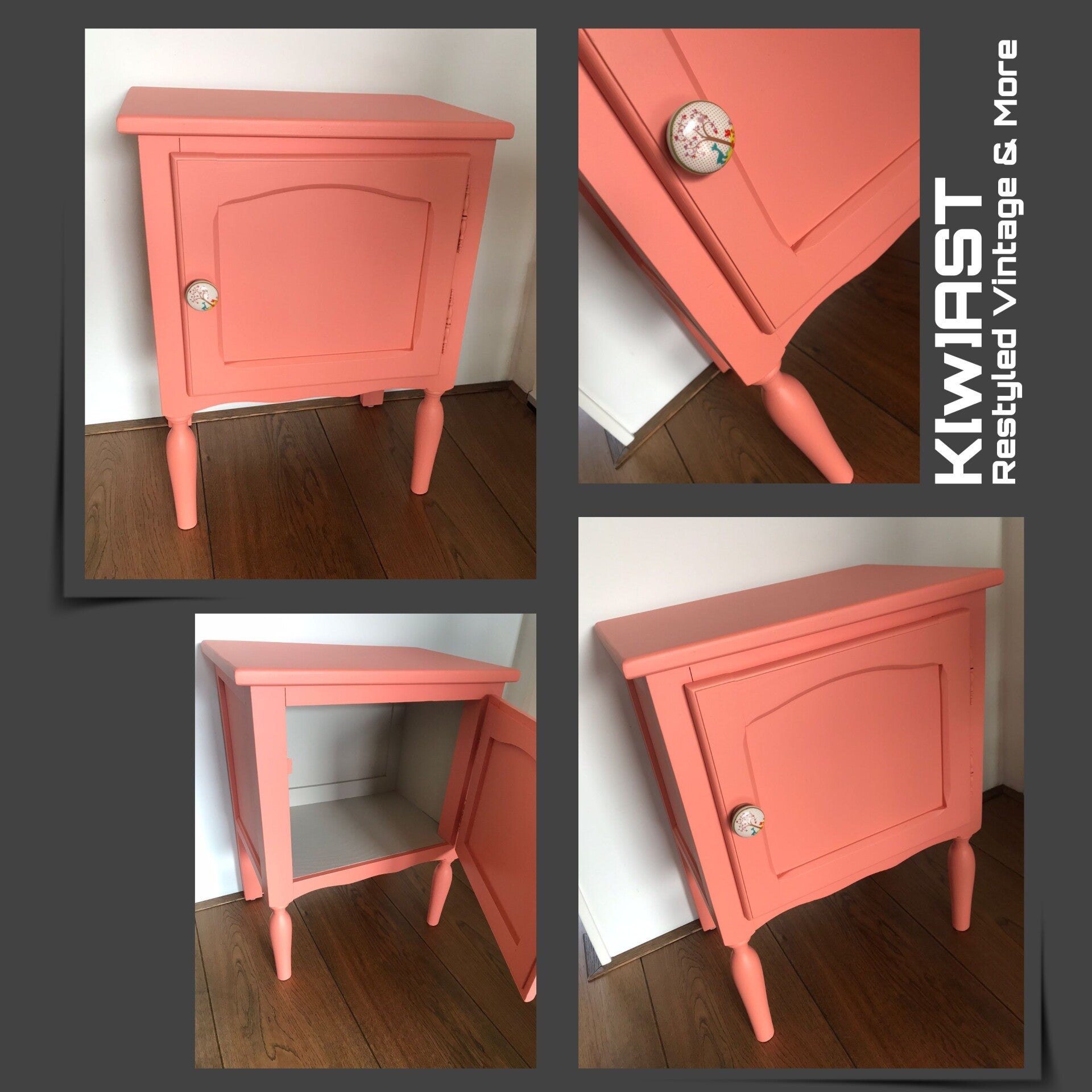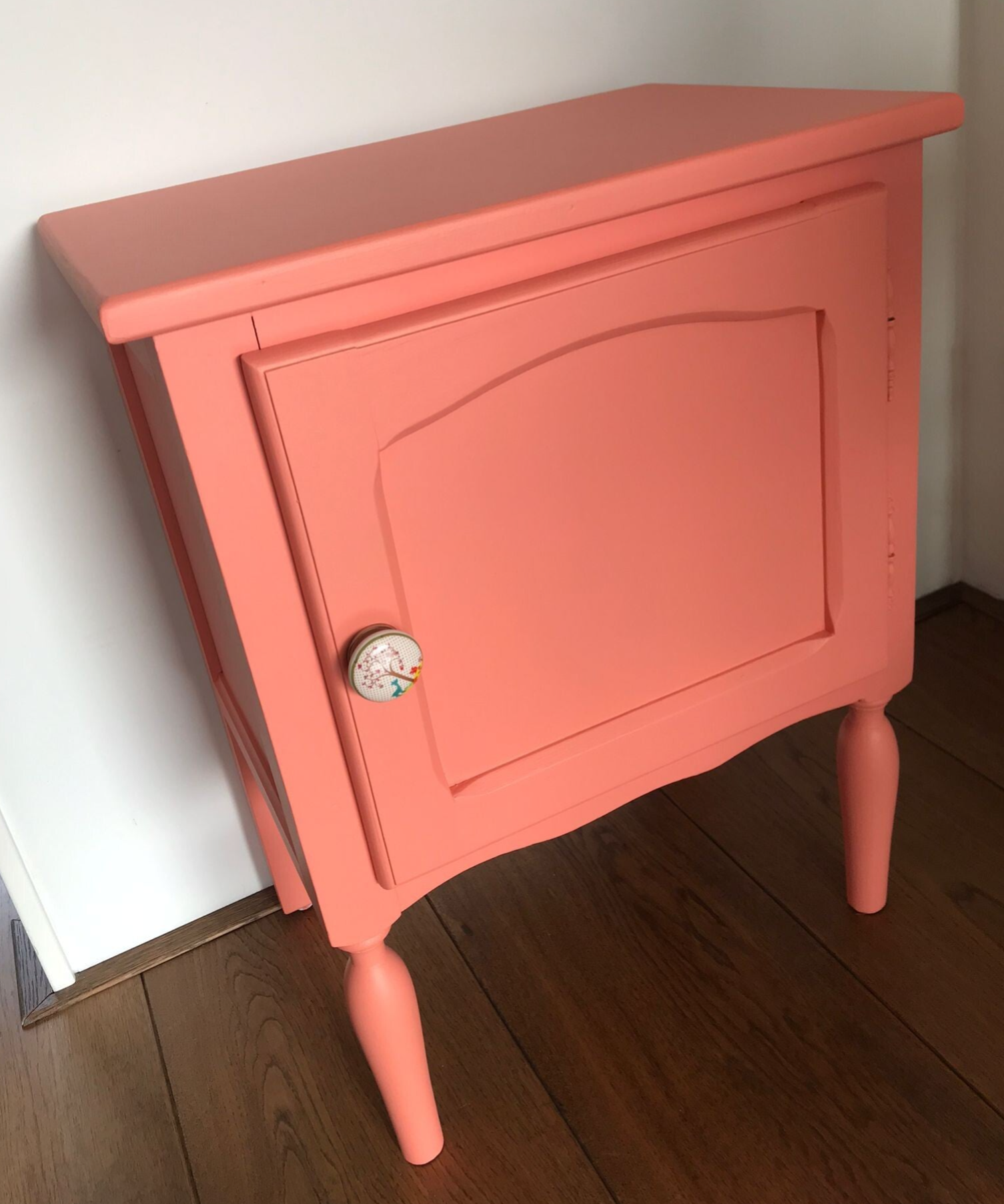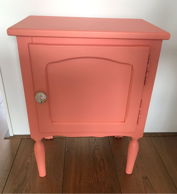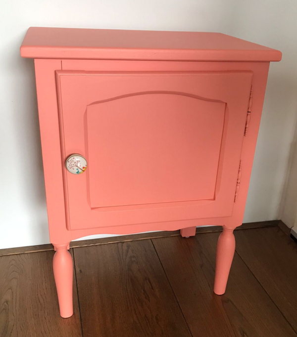 Deze vrolijke snuiter staat in de kleur Coral van Fusion Mineral Paint. Een bescheiden kastje, maar door zijn uitgesproken kleur toch echt een kastje die aanwezig is. De gezellige en vrolijke knop maken het plaatje compleet.