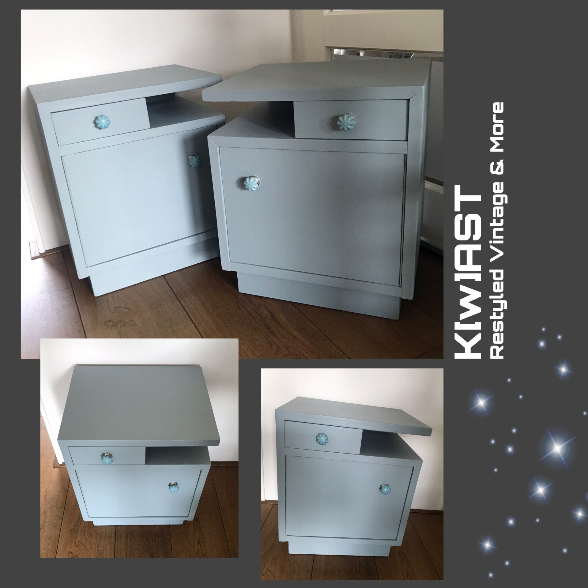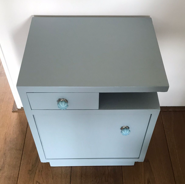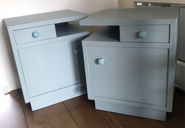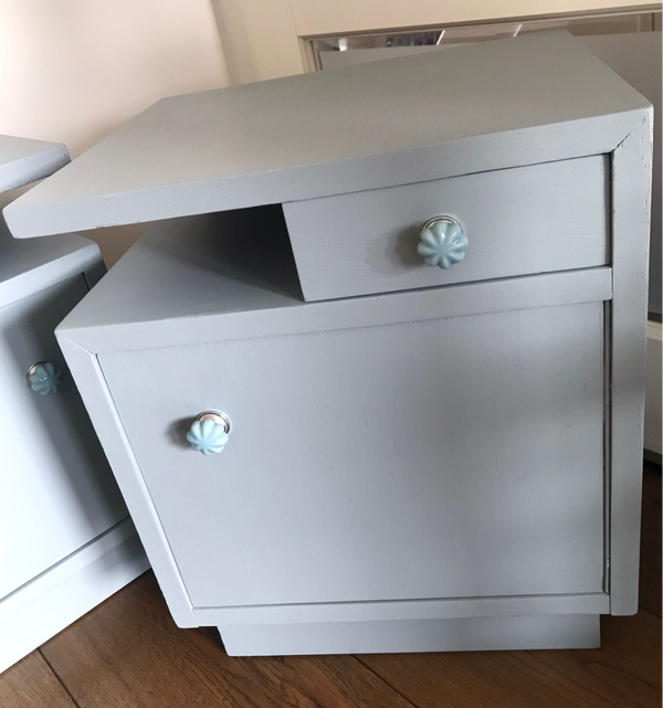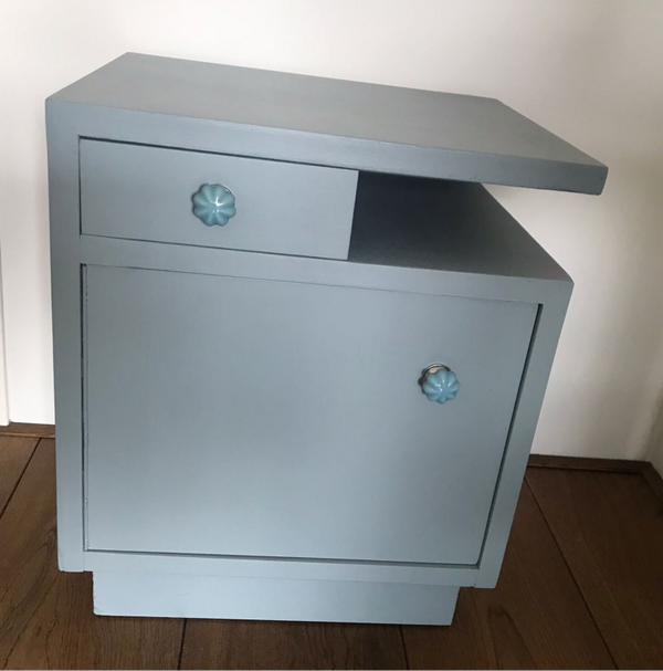 Een super leuk vormgegeven set nachtkastjes. Deze hebben de kleur Paisley van Fusion Mineral Paint gekregen. Deze kleur is het best te omschrijven als scandinavisch blauw. Het is een lichte kleur blauw met her en der een grijze ondertoon. Fris, chic en warm te gelijk. De bijpassende porseleinen knopjes maken het geheel af.