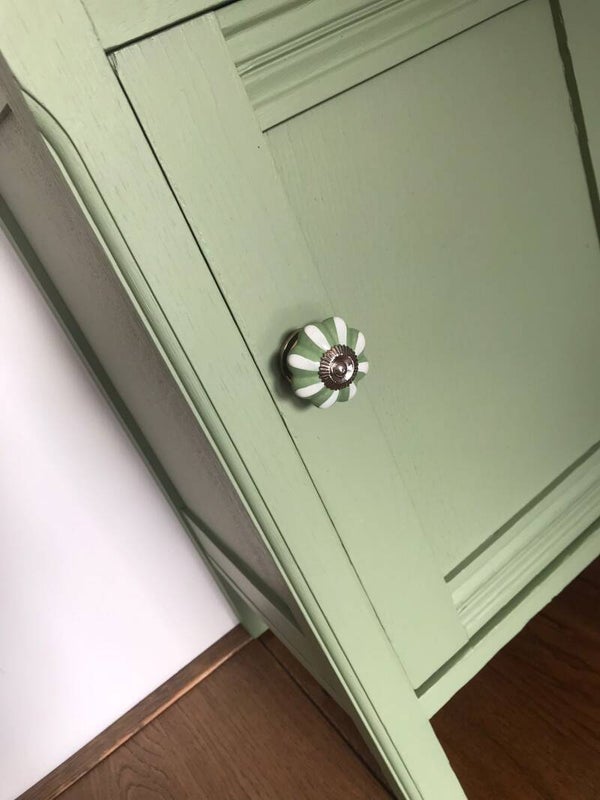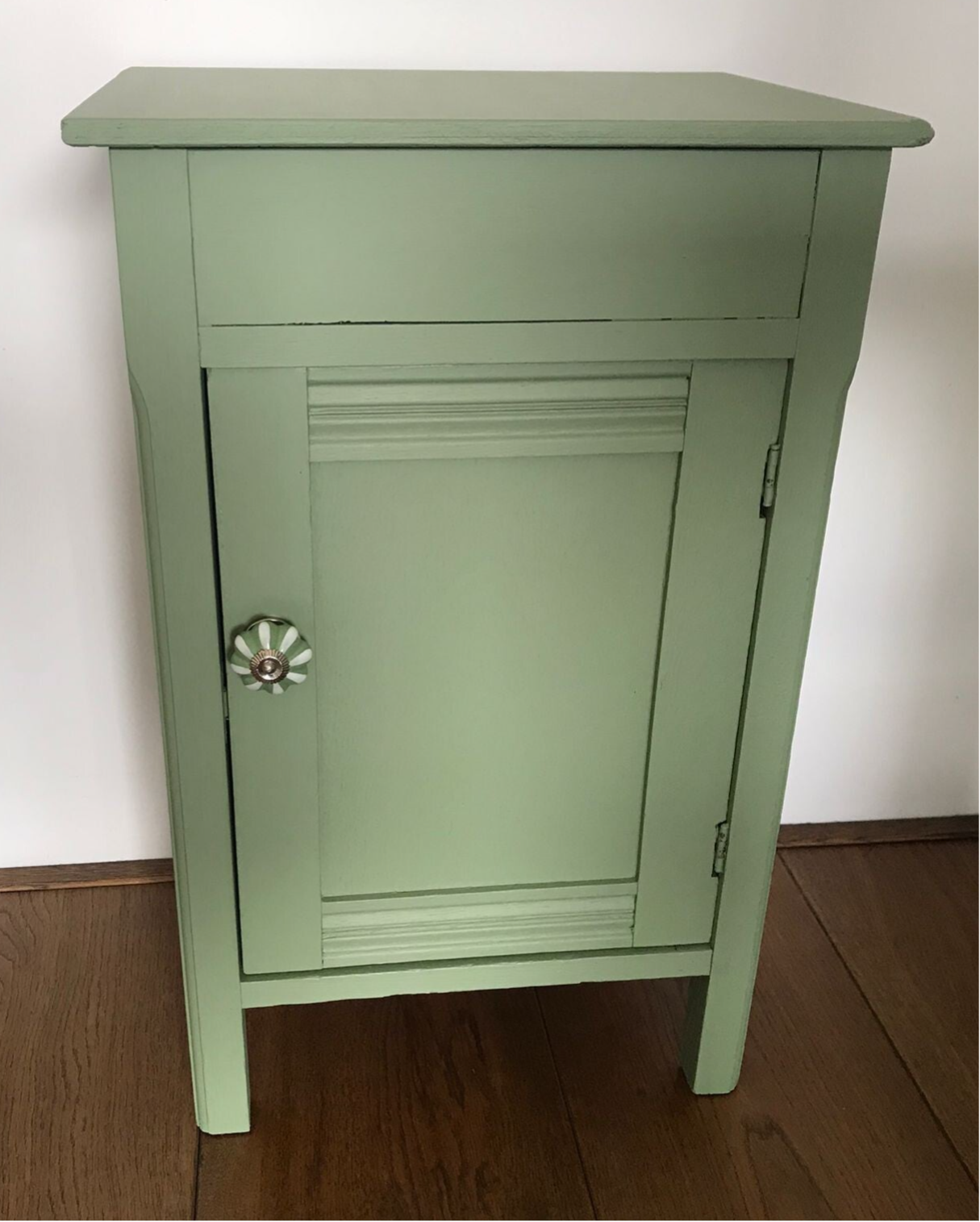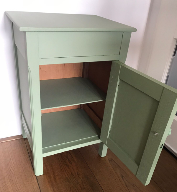 Eenvoud is hier het code woord! Door de kleur Upper Canada van Fusion Mineral Paint te gebruiken komt de eenvoud nog beter tot zijn recht, maar is het toch een gezellig kastje geworden. Door zijn appeltjes groene kleur zal dit kastje menig ruimte een heerlijke kleur boost geven. Uiteraard is hier gewerkt met een bijpassende porseleinen knop.