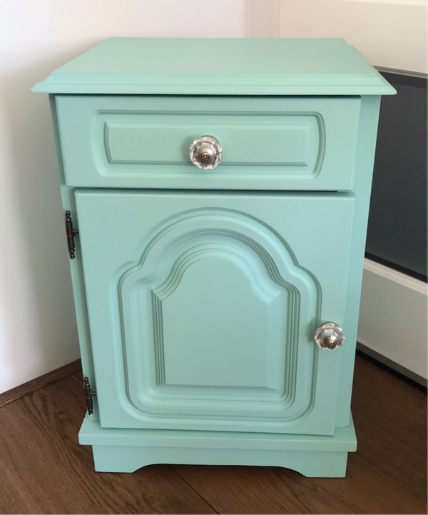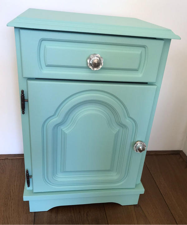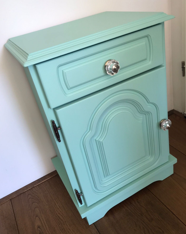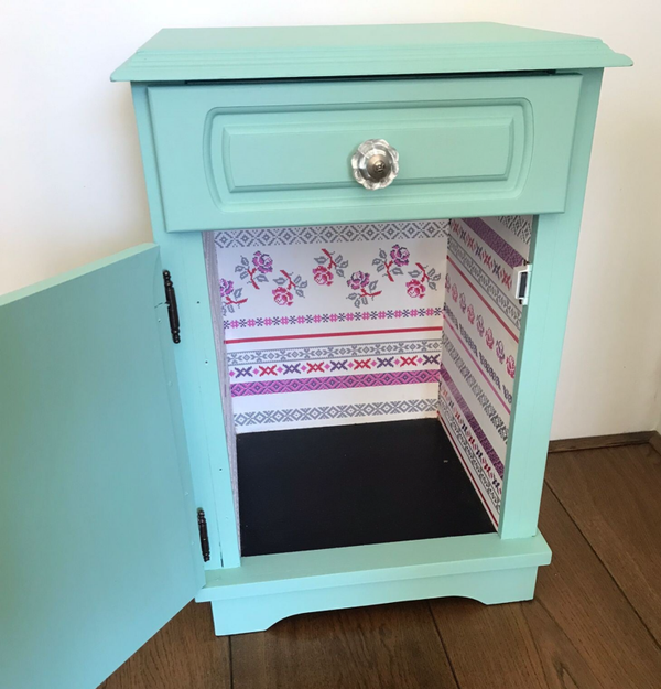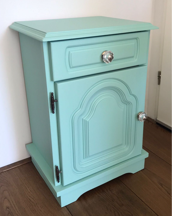 Fris en vrolijk, zo mag je deze leukerd wel noemen. De kleur Brook van Fusion Mineral Paint doet al een behoorlijke duit in het zakje, maar ook de gezellige binnenkant helpt daar enorm aan bij. En als kers op de taart, ook nog een super leuke knop op het deurtje en lade.