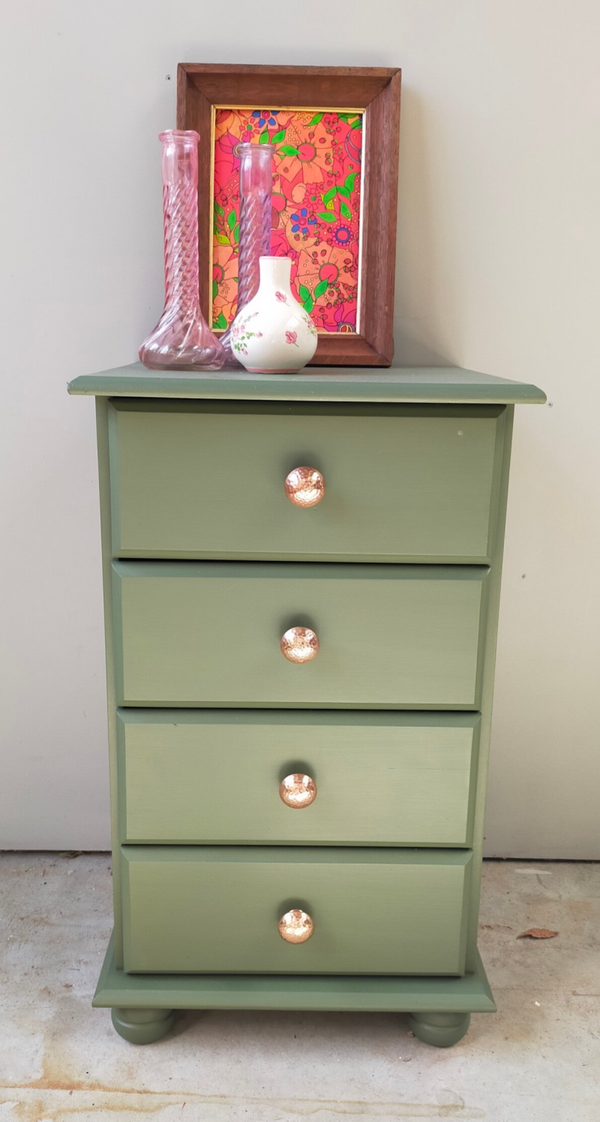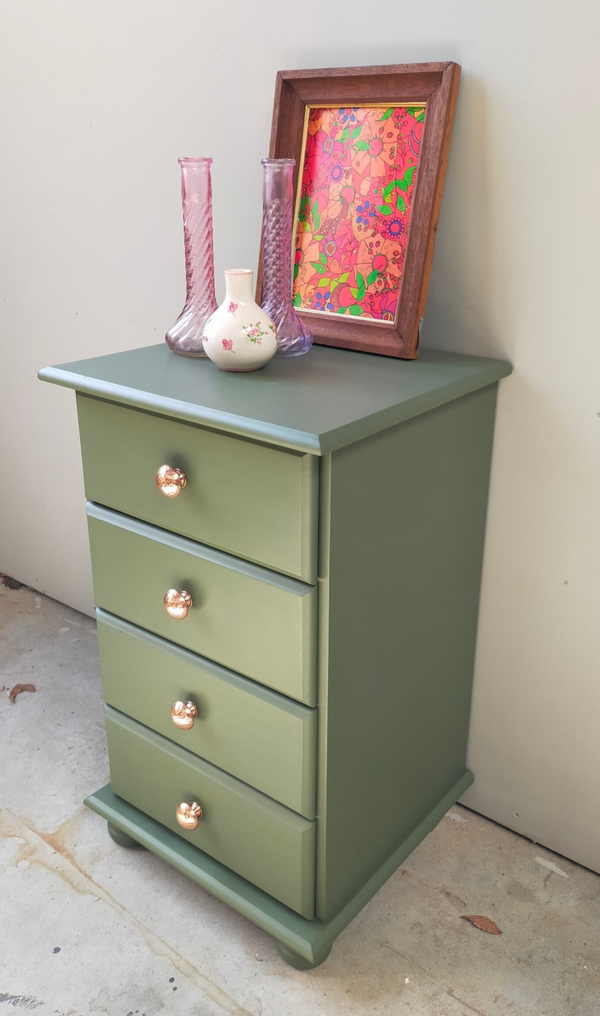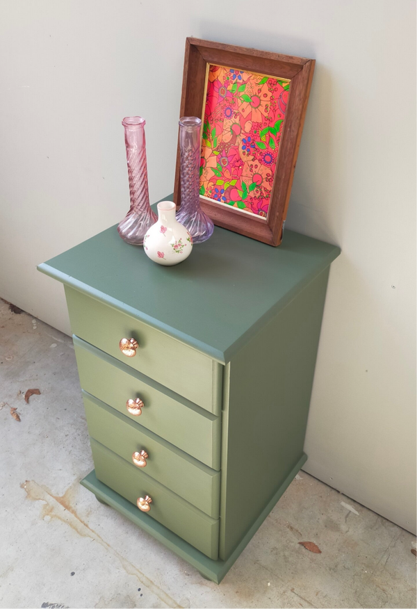 Dit oude kastje is een prachtig voorbeeld van mooi en praktisch. Het heeft een unieke charme mede zijn kleur, Bayberry van Fusion Mineral Paint. Het kastje is geschilderd met een verfijnde laag van olijf groene verf, wat de textuur en vorm van het hout benadrukt. Het geeft een warme, gastvrije uitstraling en past perfect in elk interieur.