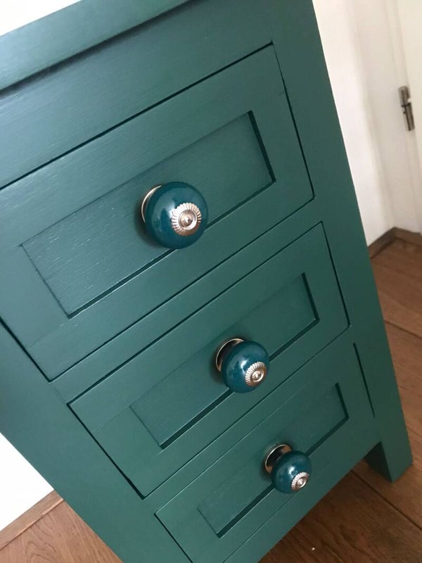 Een intens groene kleur en met super leuke porseleinen knoppen maken dit kastje tot een mooi geheel! De kleur heet Pressed Ferne van Fusion Mineral Paint. De 3 laadjes lopen goed en het subtiele belijning in het hout maken het toch enigszins speels.