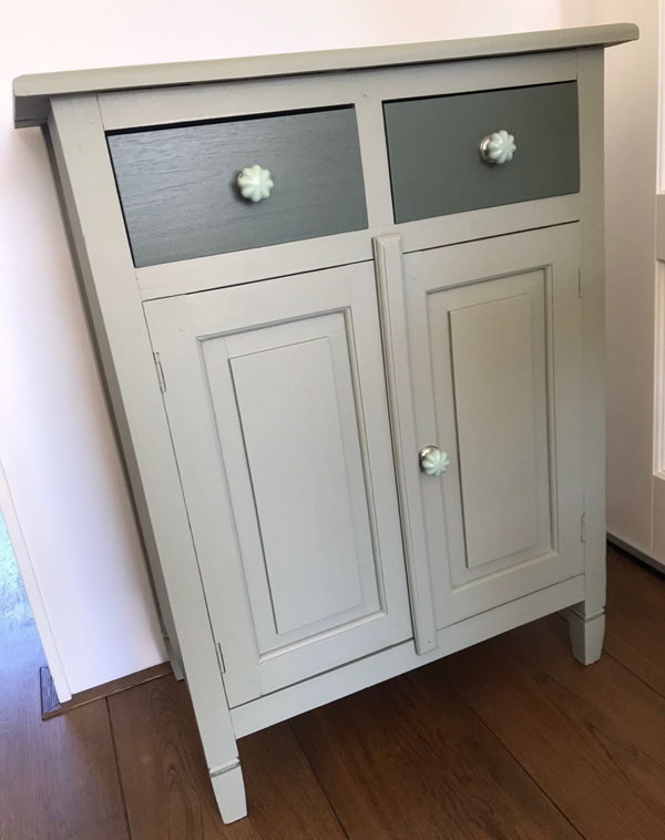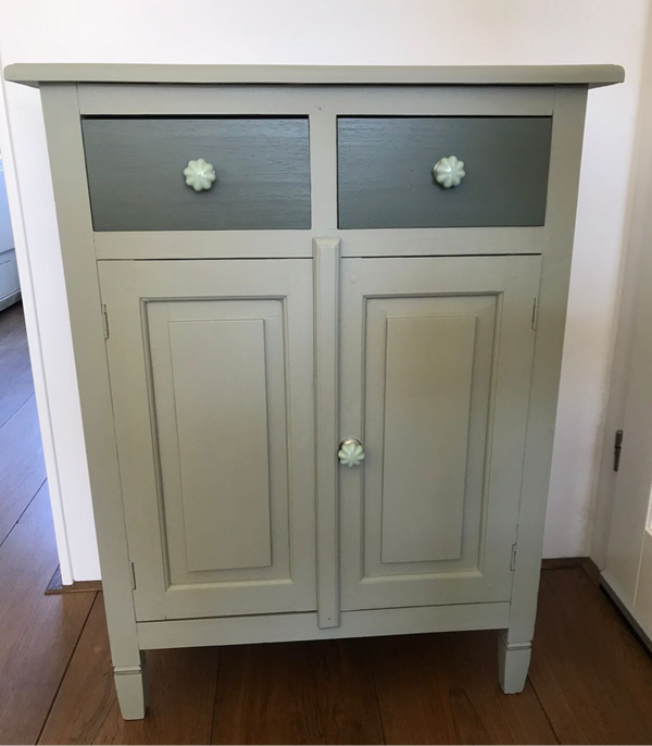 Een prettig model kastje. Door zijn afmetingen is deze knapperd uitermate geschikt voor in de hal, maar een toilet, badkamer of slaapkamer kan natuurlijk ook. De kleur Lichen, wat als een licht groene tint wordt aangemerkt, gaat goed samen met de kleur Bayberry op de lades. Allebei de kleuren komen uit de lijn van Fusion Mineral Paint. Door deze kleuren te combineren krijg je een warm en tegelijkertijd speel effect. De lades en deurtjes zijn afgewerkt met bijpassend beslag.