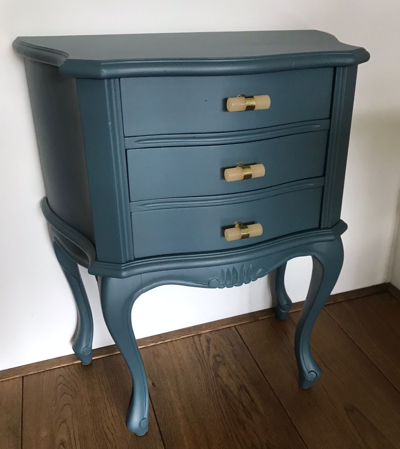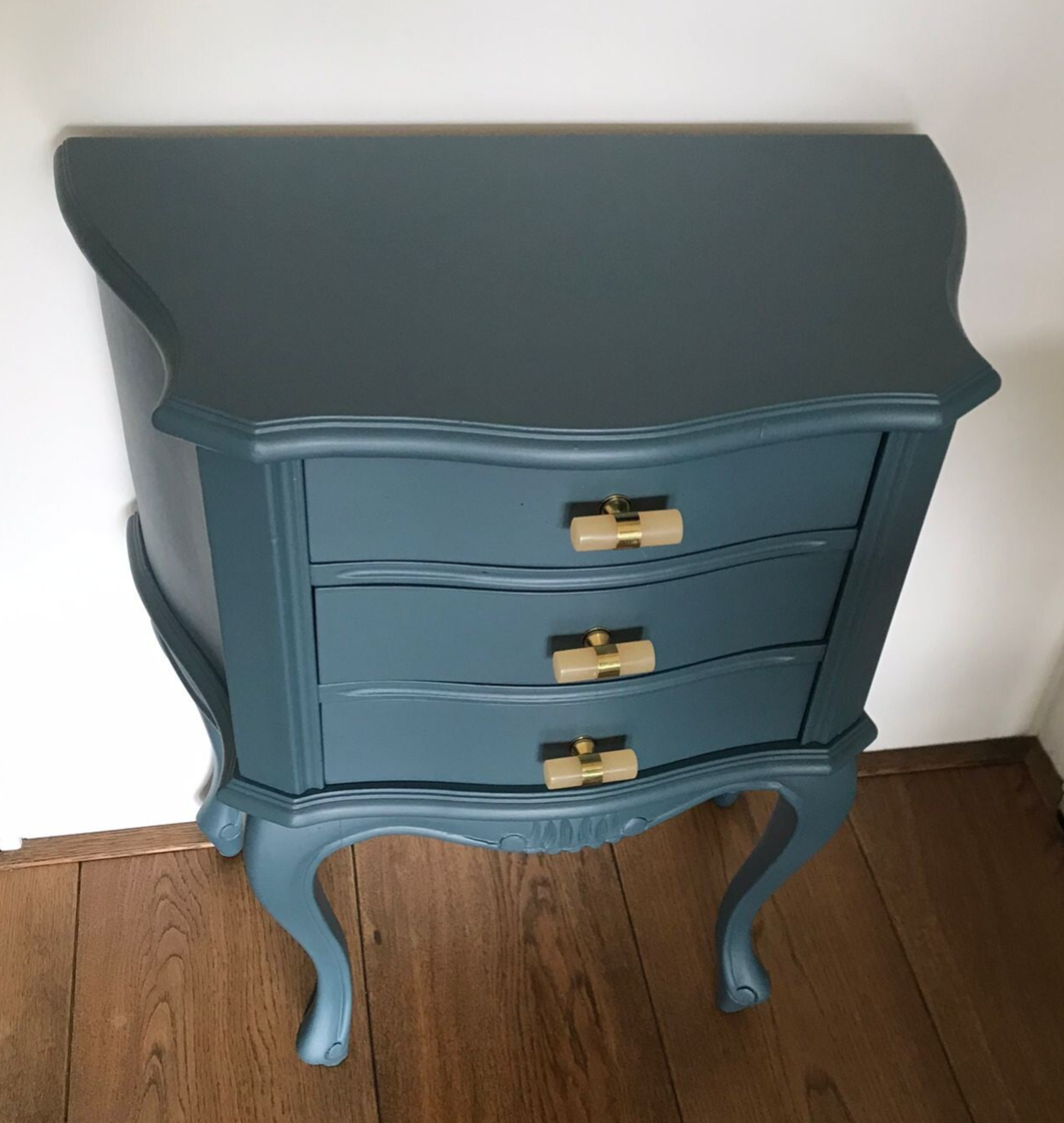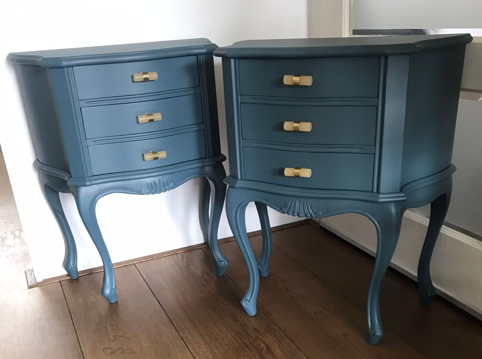 Een mooie set nachtkastjes in de kleur Homestead Blue van Fusion Mineral Paint. De mooie vormgeving en details maken deze kastjes uniek en uiteraard mogen de leuke bijpassende ladengreepjes niet ontbreken.
