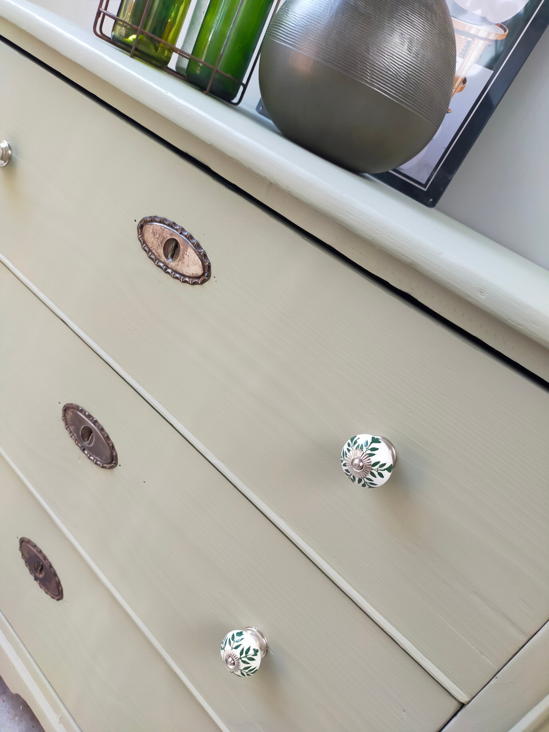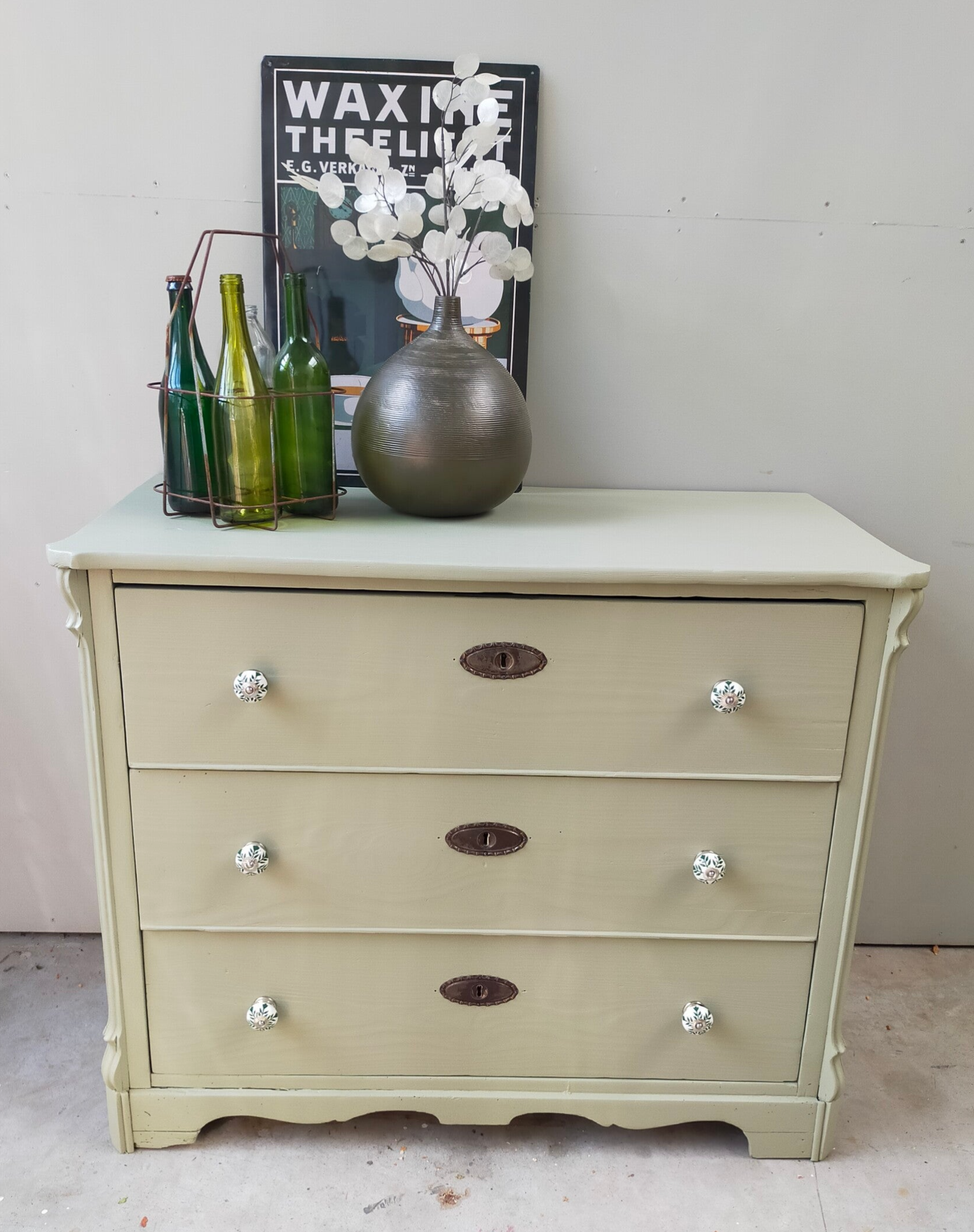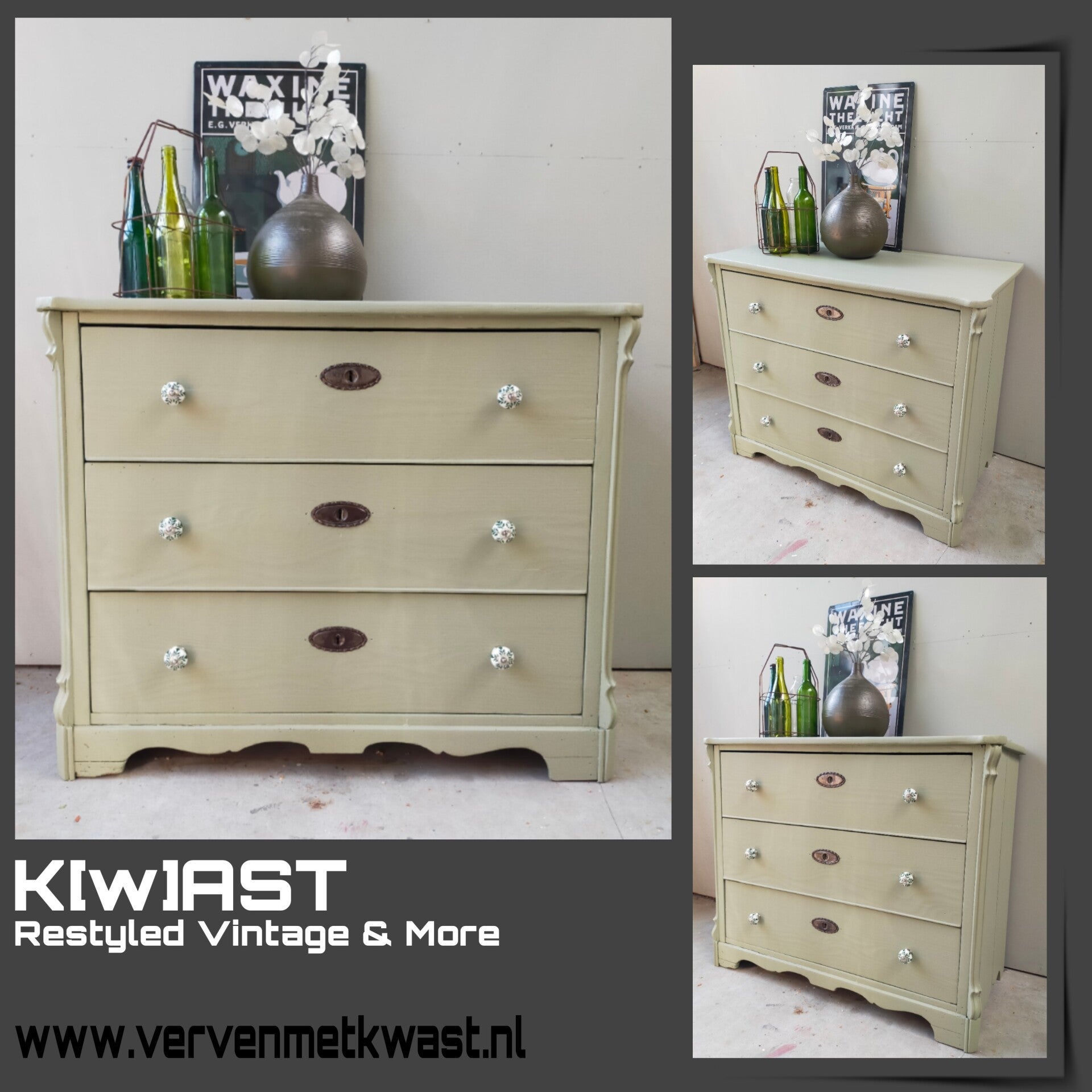Multifunctioneel deze practhige ladenkast! Kan als dressoir, of als badkamer meubel, maar ook super leuk als commode. Nou....genoeg mogelijkheden ! De mooie kleur Lichen van Fusion Mineral Paint laat zich het best omschrijven als een licht groene kleur met een enigszins grijze ondertoon. Een kleur die al snel overal bij past. De lades zijn afgewerkt met een combinatie van oud en nieuw beslag, wat het net ff anders maakt dan anders. Overbodig om te vermelden, maar de lades lopen soepel.