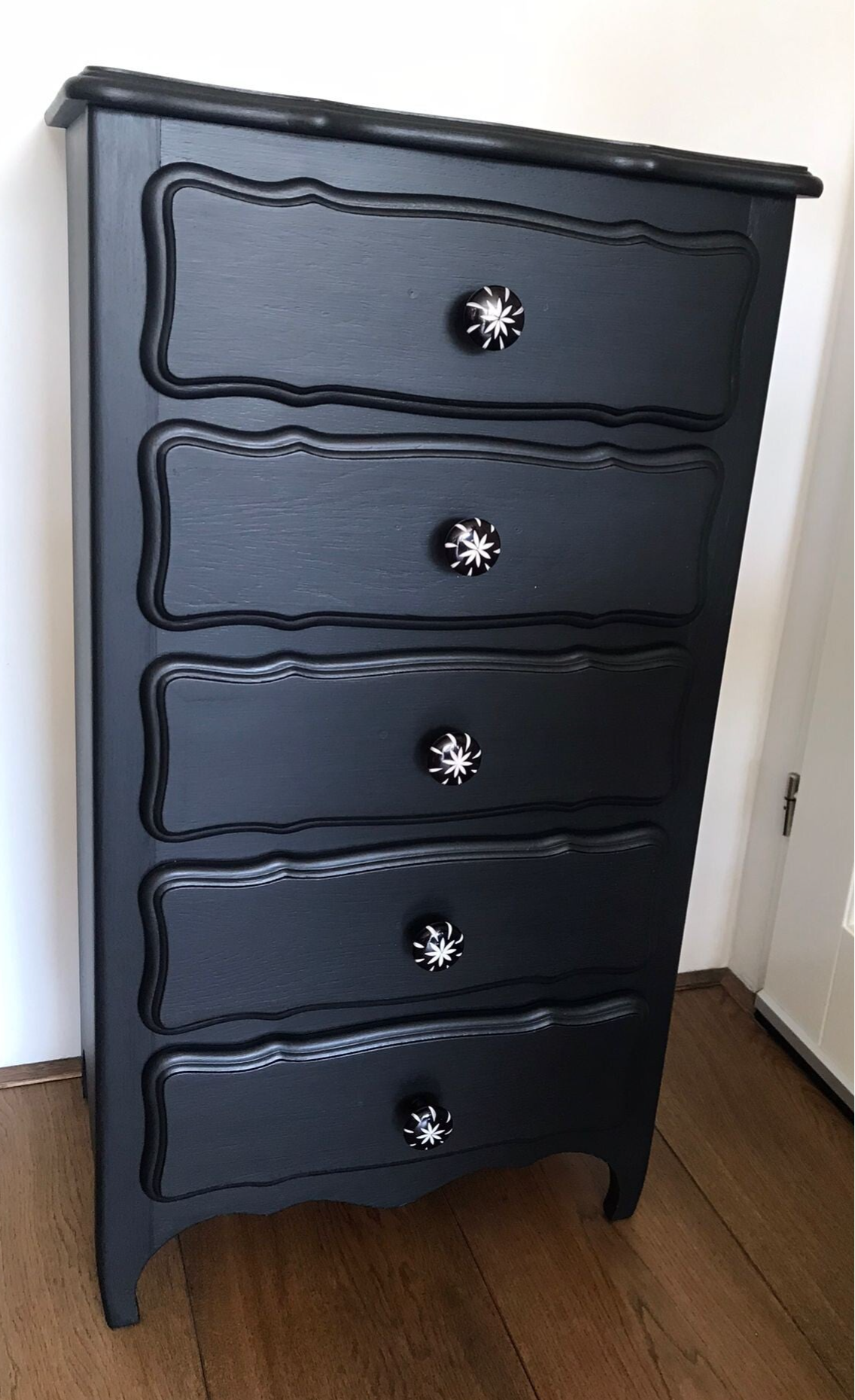 Een leuk en mooi vormgegeven ladenkast. De kleur Coal Black van Fusion Mineral Paint maakt deze kast een lust voor het oog. Intens zwart in combinatie met de bijpassende knoppen, op de goed lopende lades, maken het geheel helemaal af.