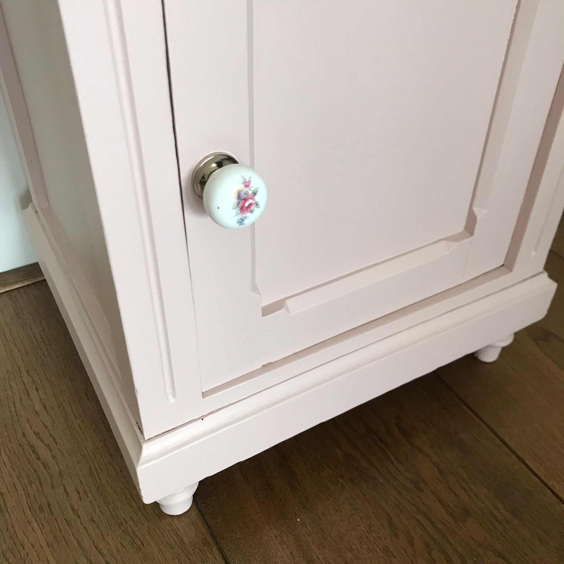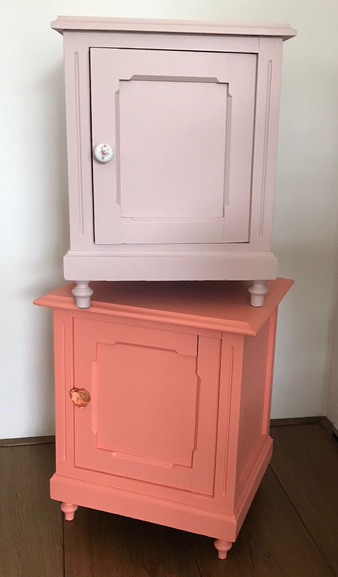 Deze kastjes zien wij zelf goed terug komen als bijvoorbeeld een nachtkastje op een kinderkamer. Uiteraard kunnen ze ook een ander doel dienen. De kleuren die gebruikt zijn, zijn Coral en Rosewater van Fusion Mineral Paint. Allebei de kastjes zijn afgewerkt met een "eigen" passende knop, waardoor het een leuk en vrolijk geheel is.