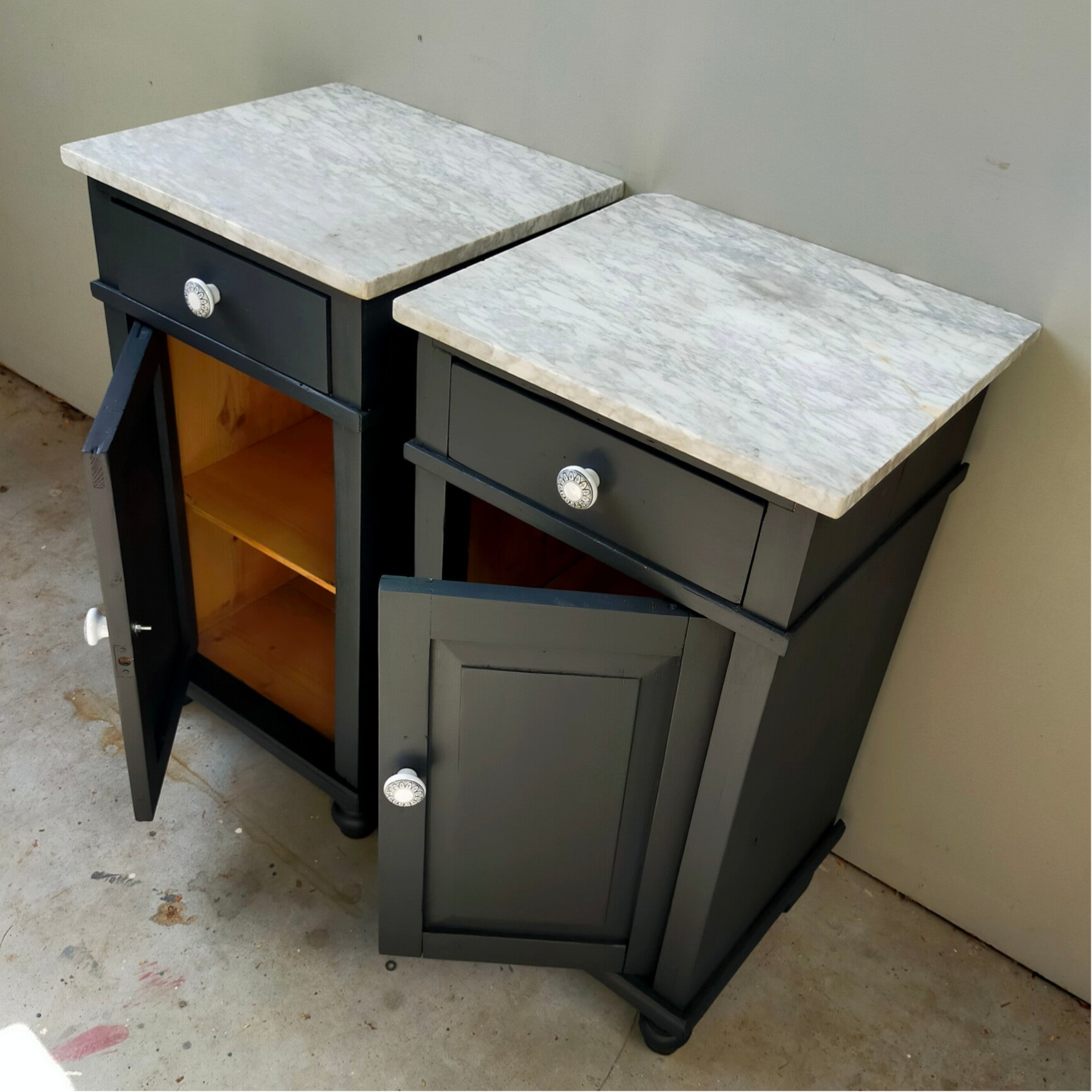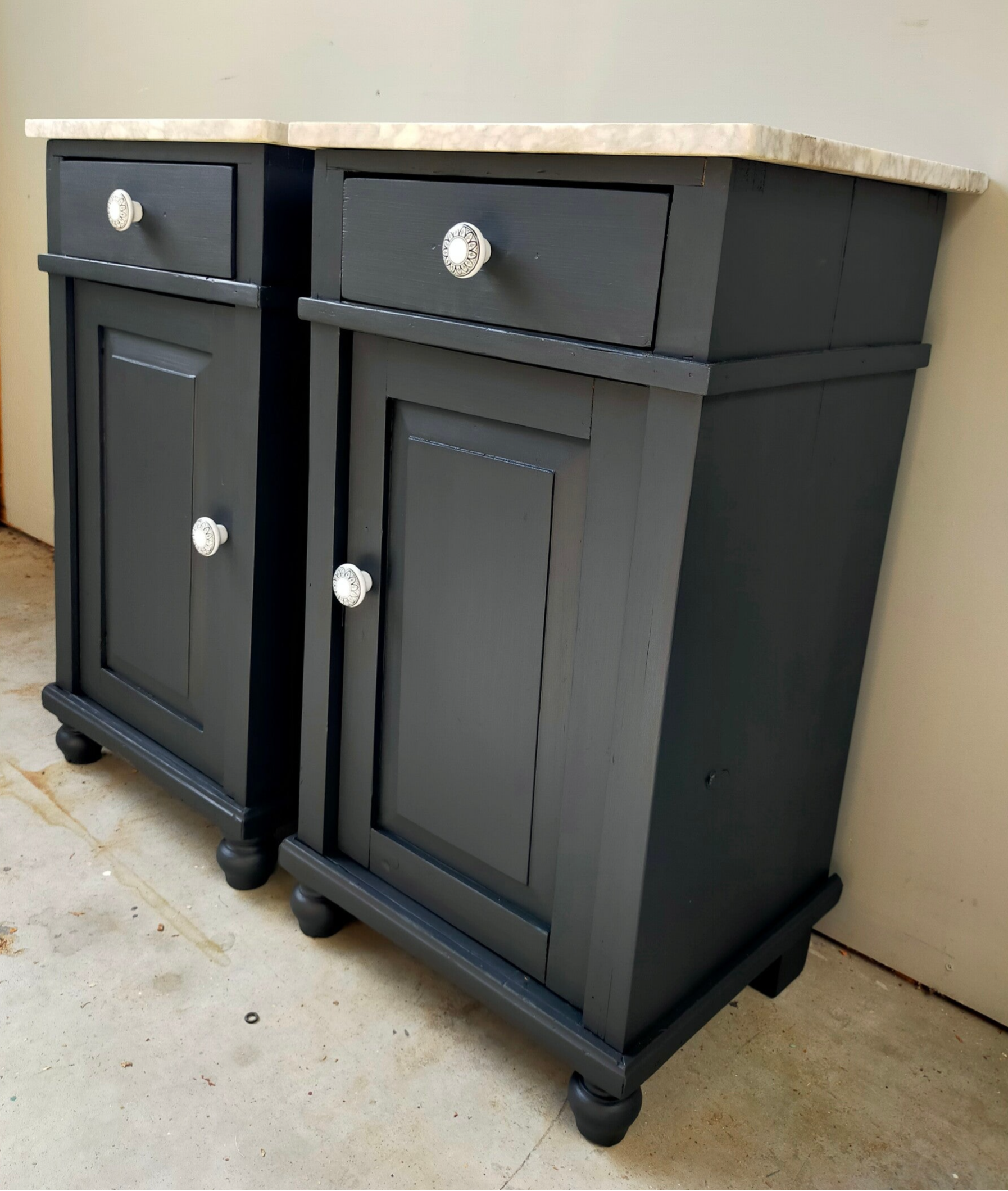 Een set die je niet veel tegenkomt ! Nachtkastjes met een marmerblad. Deze set heeft de kleur Ash van Fusion Mineral Paint gekregen, wat zich het best laat omschrijven als een diep antraciet tint. Met de bijpassende knoppen en in combinatie met het marmer, maakt dit de set kastjes tot een mooi en chic geheel.