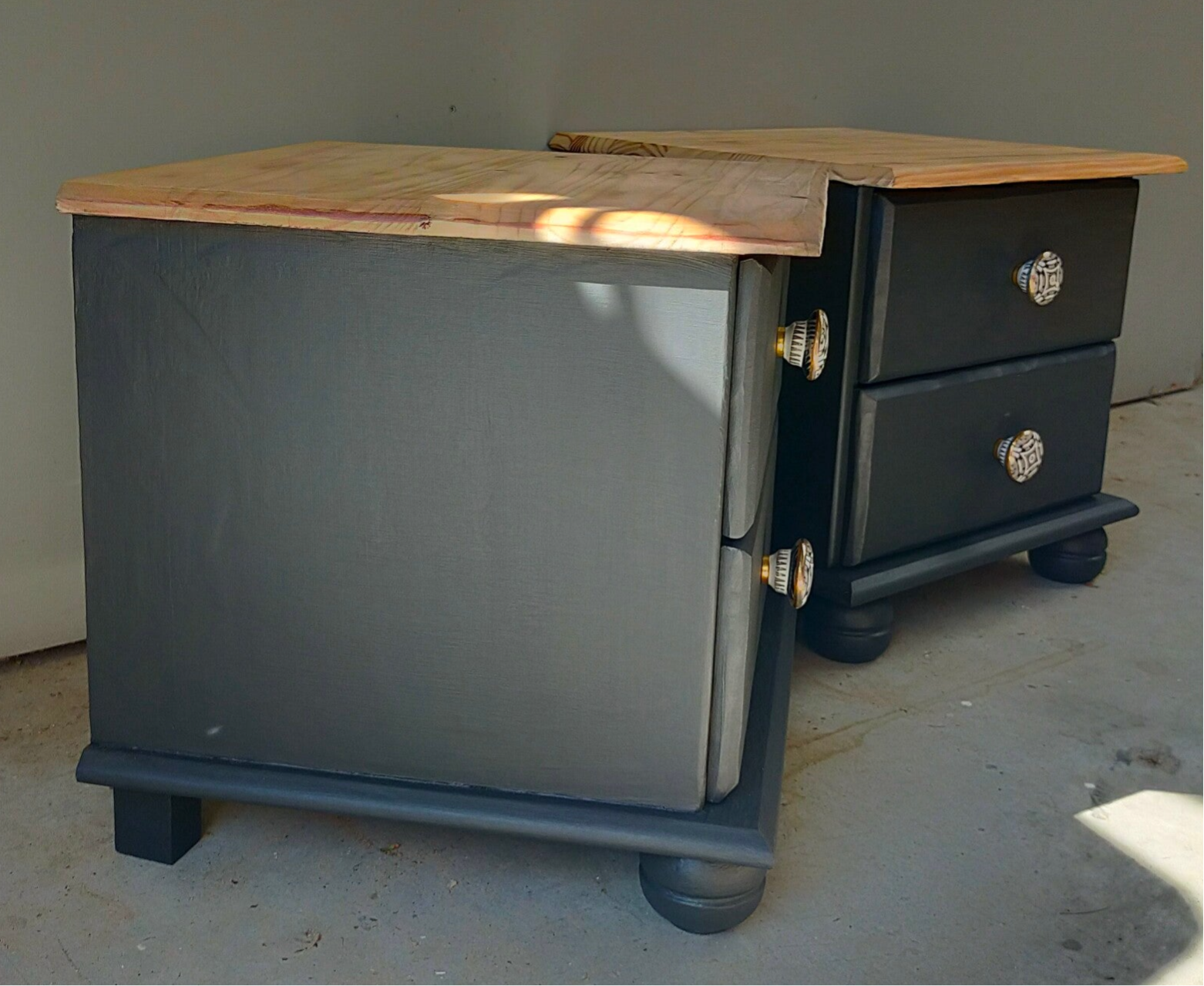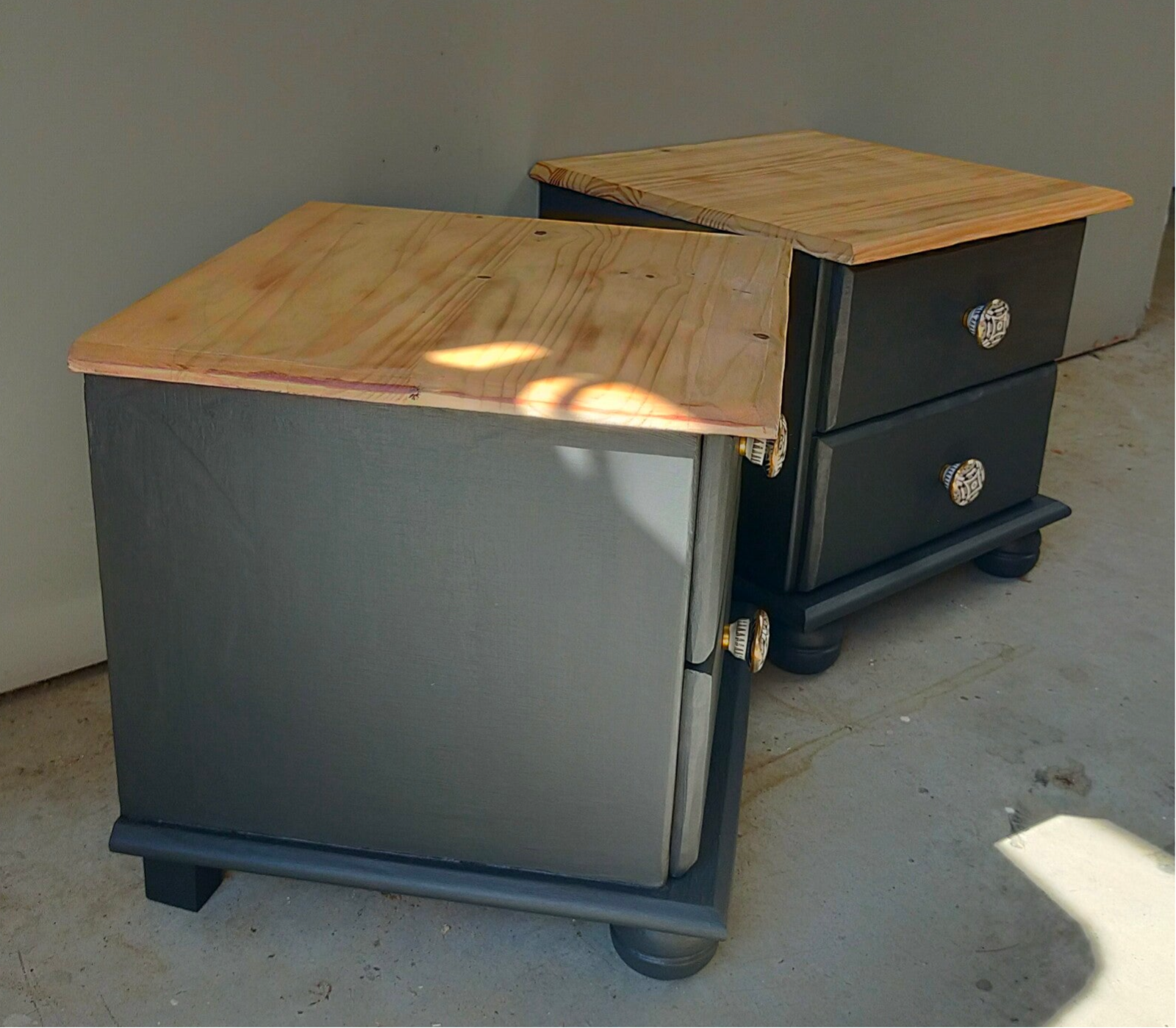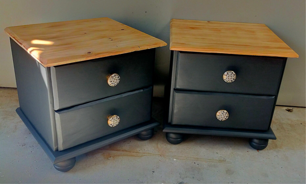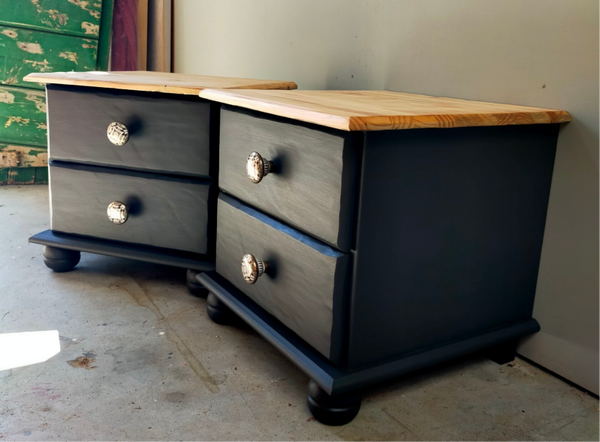 Het blijft een prettige combinatie van het warme natuurlijke hout met een warm zwarte kleur. Dit is Cast Iron van Fusion Mineral Paint. Deze set nachtkastjes kent een bescheiden maatvoering en hebben beiden goed lopende lades. En wat dacht je van die super gave porseleinen knoppen, die maken het helemaal af!