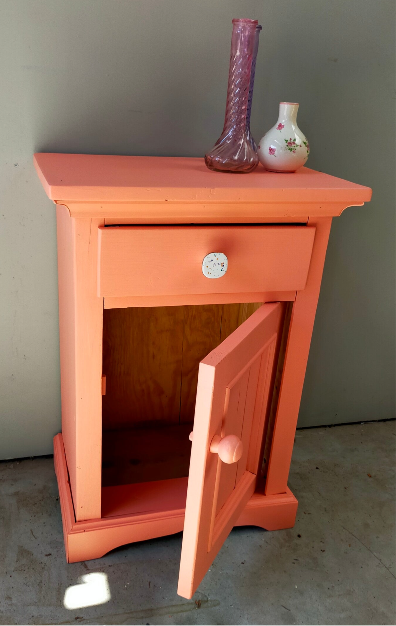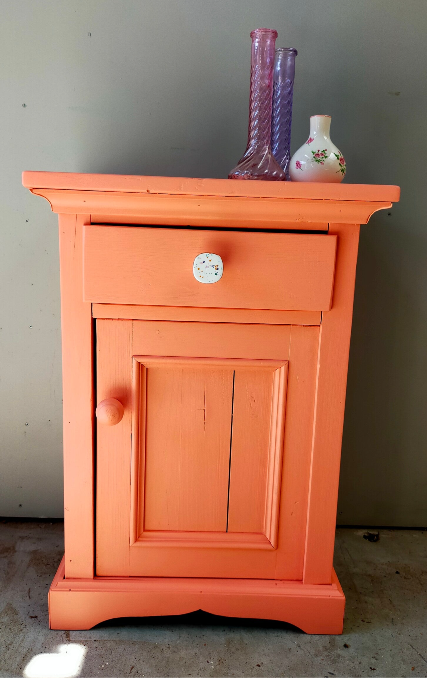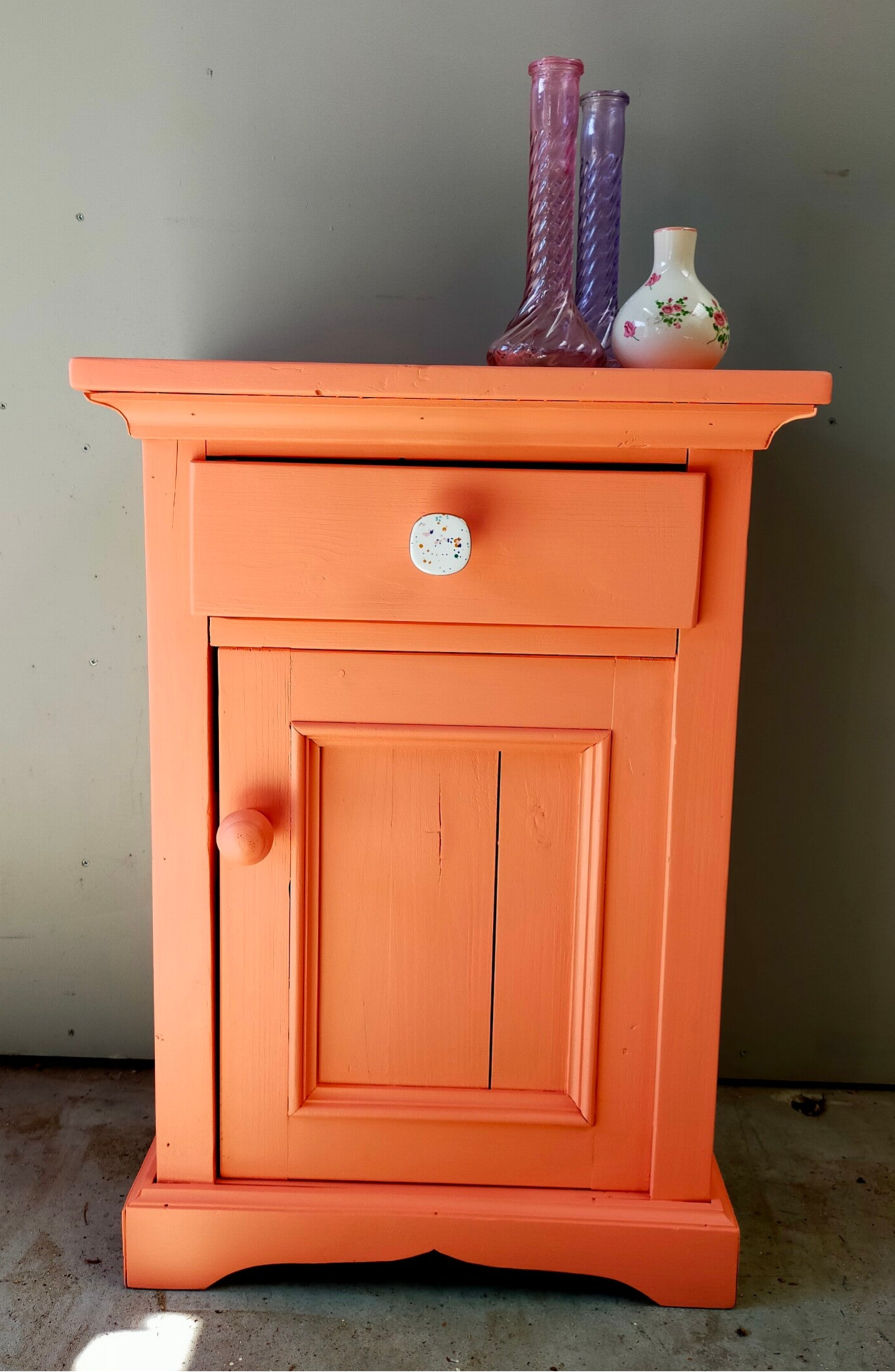 Deze vrolijke snuiter zien wij bijvoorbeeld als nachtkastje in een kinderkamer, maar kan natuurlijk ook super goed als eyecather in een andere ruimte geplaatst worden. Hoe dan ook, het is een ideaal maatje in de vrolijke kleur Coral van Fusion Mineral Paint en heb je die gezellige knop gezien? Helemaal leuk toch!