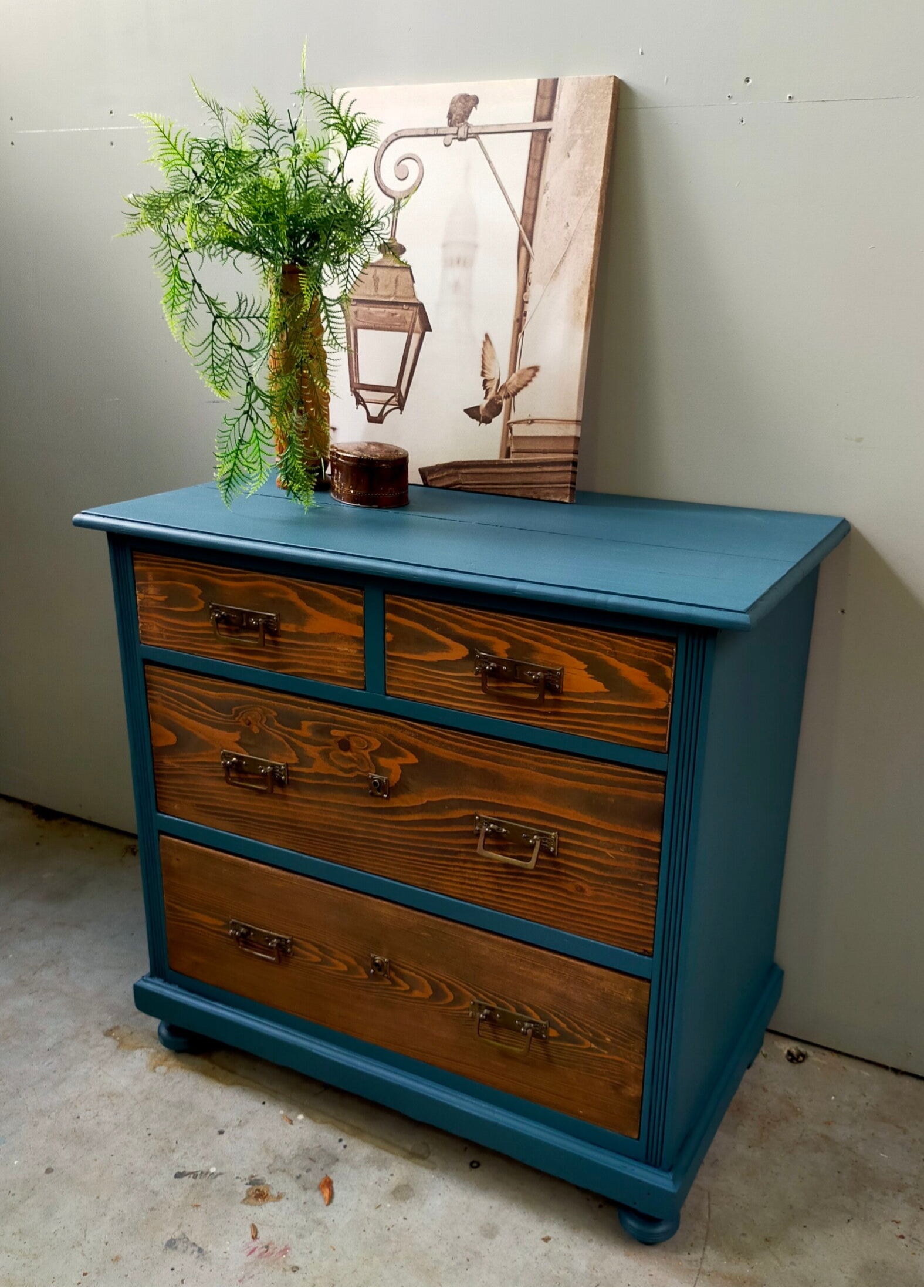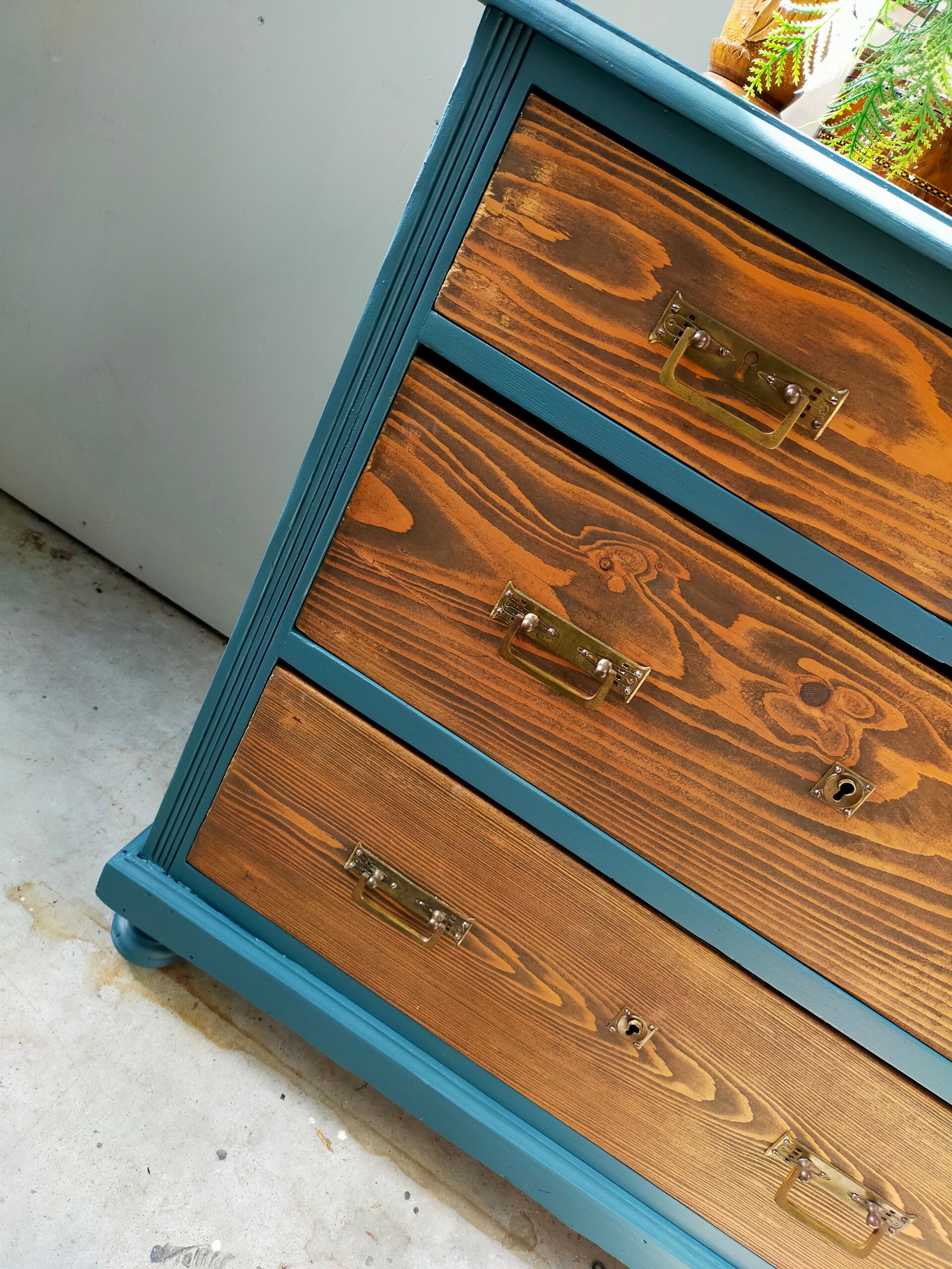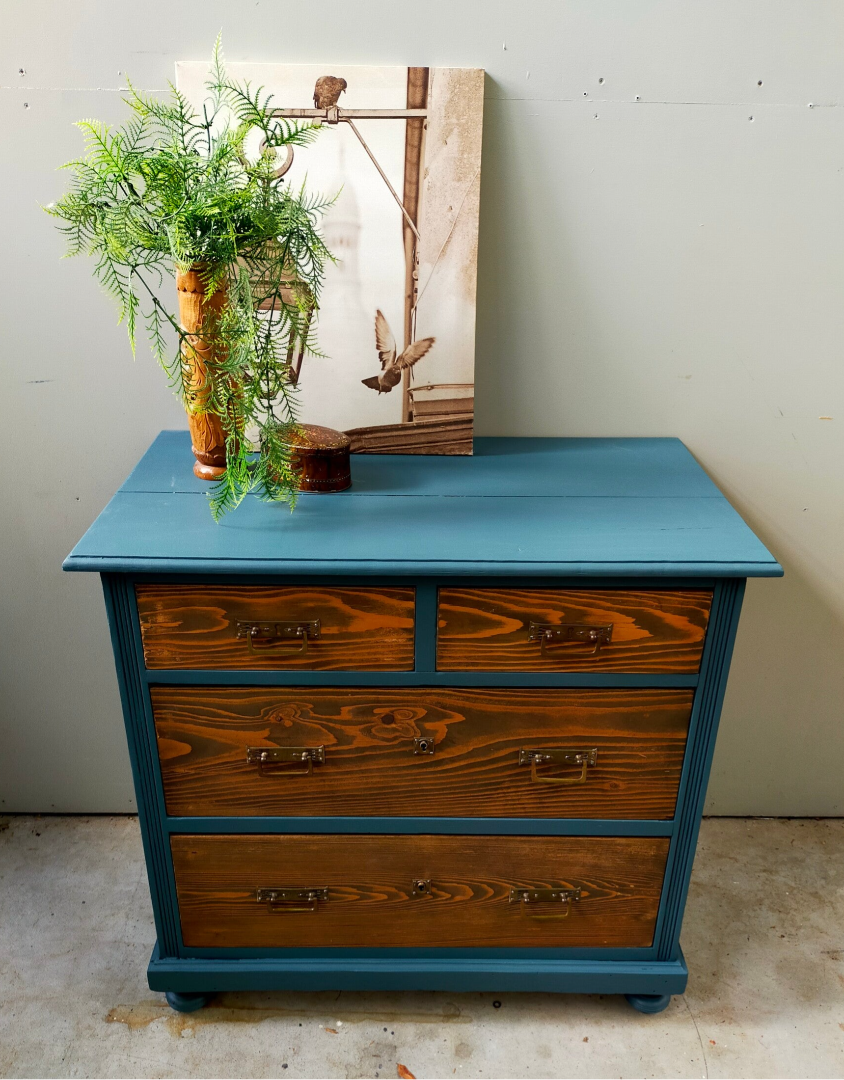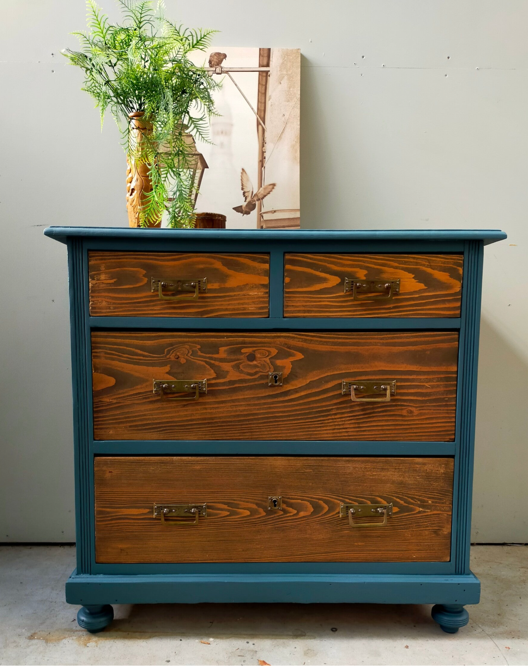 Deze kast staat in de mooie petrol blauwe kleur Homestead Blue van Fusion Mineral Paint. De lades zijn allereerst blank geschuurd, waarna ze behandeld zijn met een matte cappuccino finish wat het tot een warm geheel maakt. Het orginele beslag is hier behouden, daar dit een prima combinatie maakt met de kleur en het warme hout.