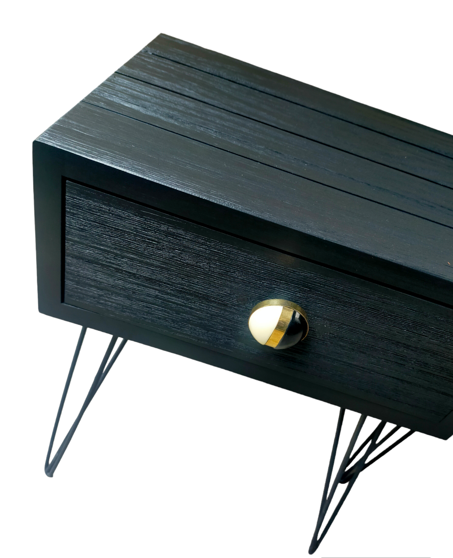 Lekker apart is dit setje nachtkastjes. Mooi op z'n stale vintage vormgegeven pootjes en in de prachtige zwarte kleur Coal Black van Fusion Mineral Paint. De waanzinnige gave knop maakt het helemaal af. De laadjes lopen overigens goed en geven net even wat dat extra opbergruimte.