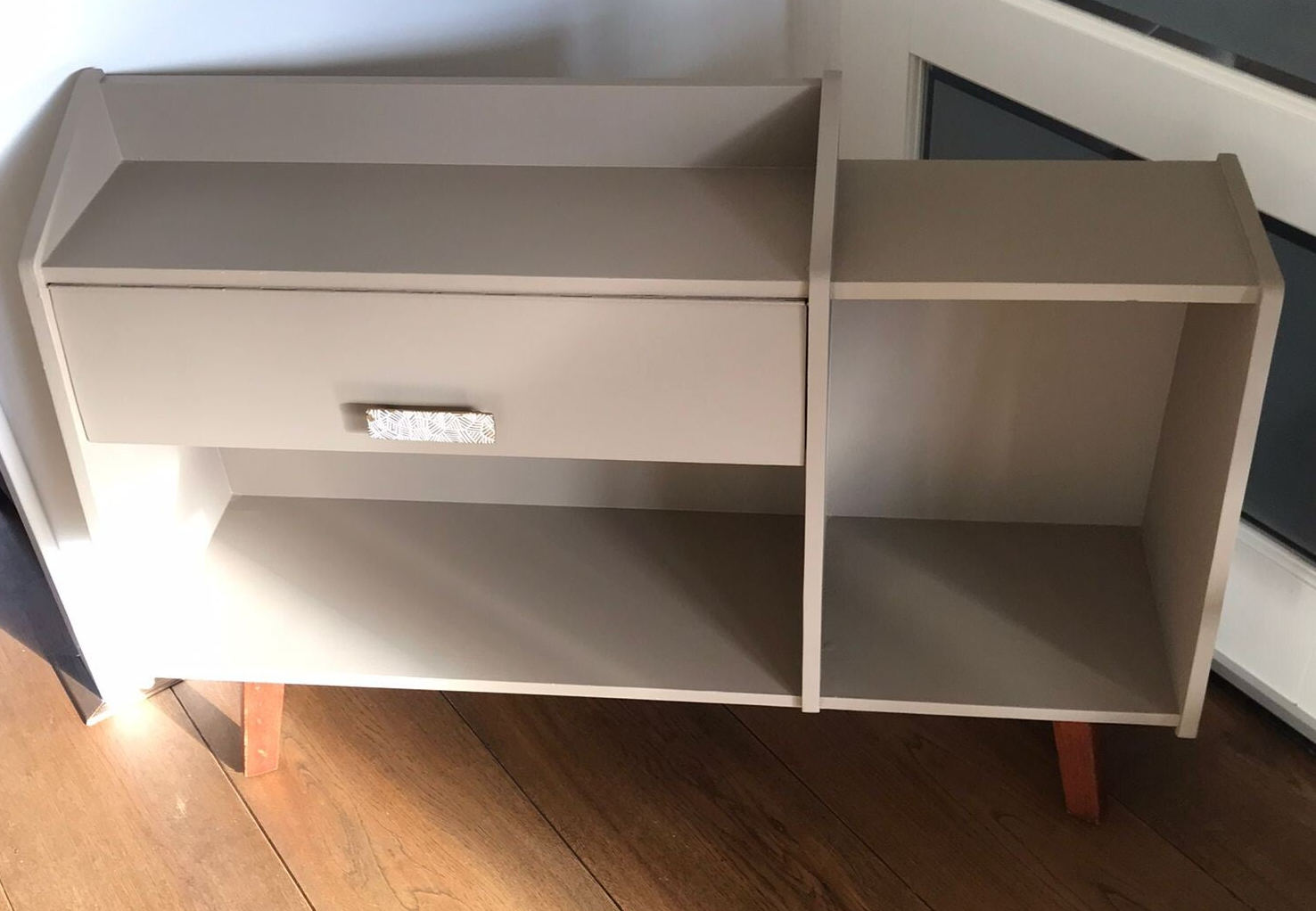 Een te leuk vintage wand en/of boekenkastje. In de warme kleur Algonquin van Fusion Mineral Paint. Deze kleur laat zich goed omschrijven als een intense taupe tint, met een enigszins caramel ondertoon. Dit combineert goed met de orginele pootjes en het greepje op het klepdeurtje. Dit kastje heeft afmetingen waardoor er als snel een plekje voor hem gevonden kan worden.