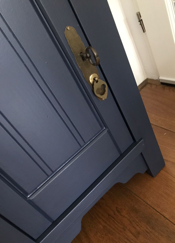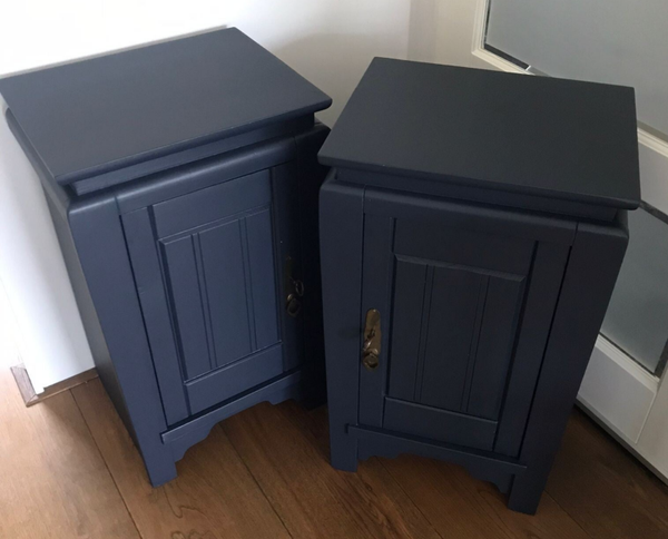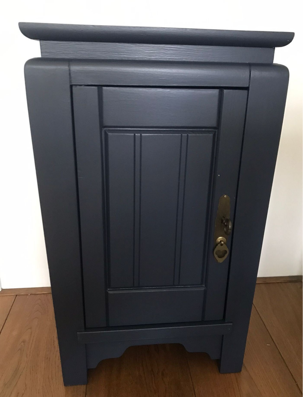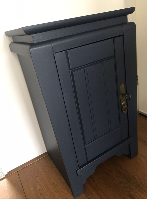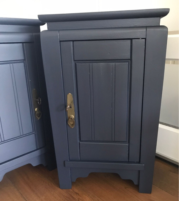 Een prachtige set deze nachtkastjes in de diep blauwe kleur, Midnight Blue van Fusion Mineral Paint. De kastjes hebben een leuke en aparte vormgeving waardoor wat ze uniek maakt. Qua afmetingen ook uitermate geschikt voor naast een boxspring bed. Het deurtje is voorzien van zijn orginele beslag met sleutel, hetgeen allemaal naar behoren functioneert. Achter het deurtje een plankje wat dan weer heel praktisch is.