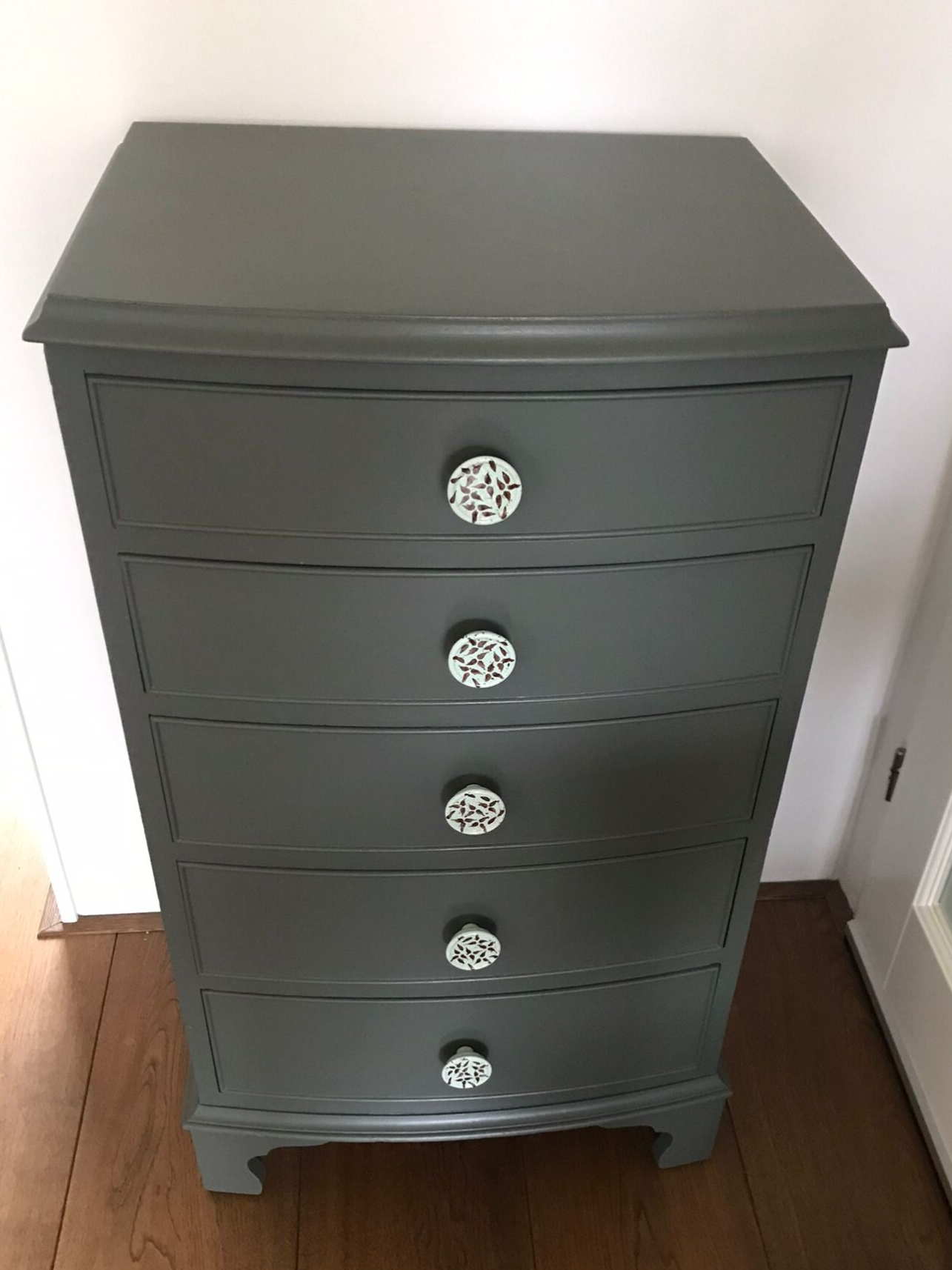 Een oudje is deze dame. Ze kent ondanks haar leeftijd toch nog strakke lijnen en doet niet onder qua elagantie. De kast staat in de mooie kleur Everett van Fusion Mineral Paint, wat zich het beste laat omschrijven als een donker (bosachtig) groen, maar bij bepaald lichtval kent het ook wel een grijze ondertoon. In combinatie met de knoppen maakt het een prettig geheel.