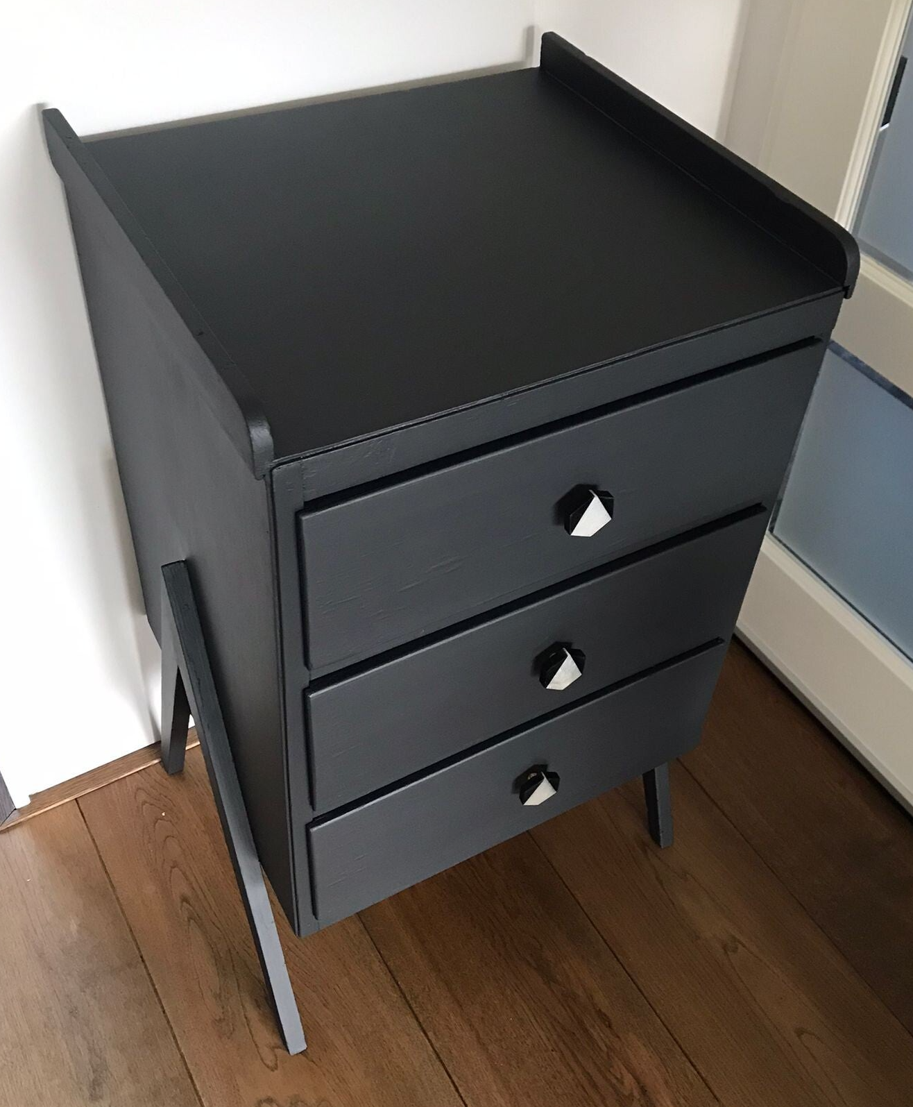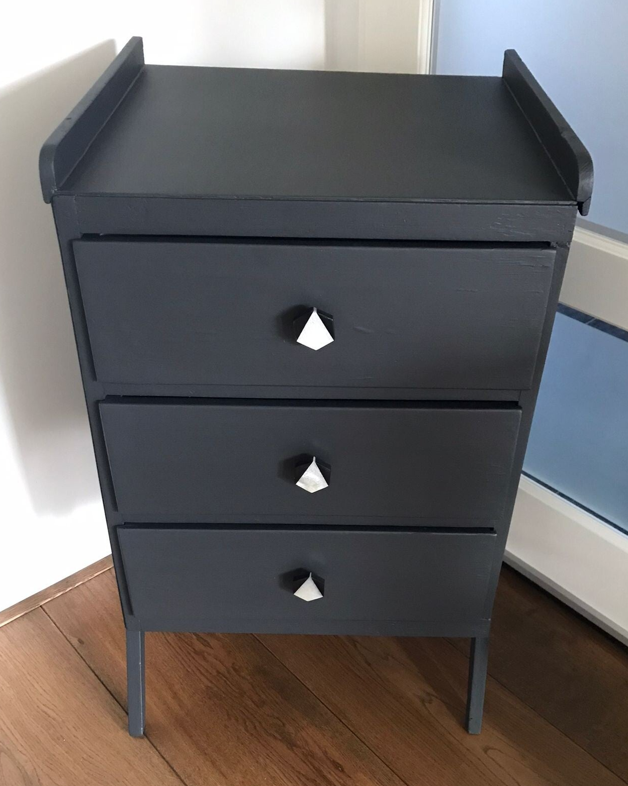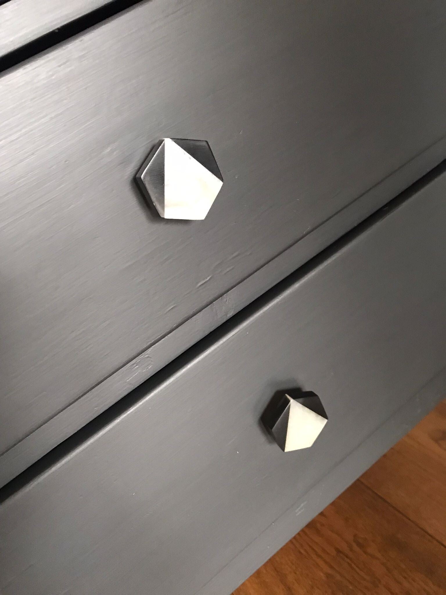 Werkelijk een oude dame, met haar gebruikssporen, wat niet wegneemt dat ze zeker haar charme heeft behouden. In de kleur Ash van Fusion Mineral Paint, staat ze heerlijk de show te stelen op haar X pootjes. De kleur laat zich omschrijven als een donker antractiet. De knopjes die we hebben geplaats op de goed lopende lades zijn hier volledig op afgestemd, wat ons betreft een super goed huwelijk !