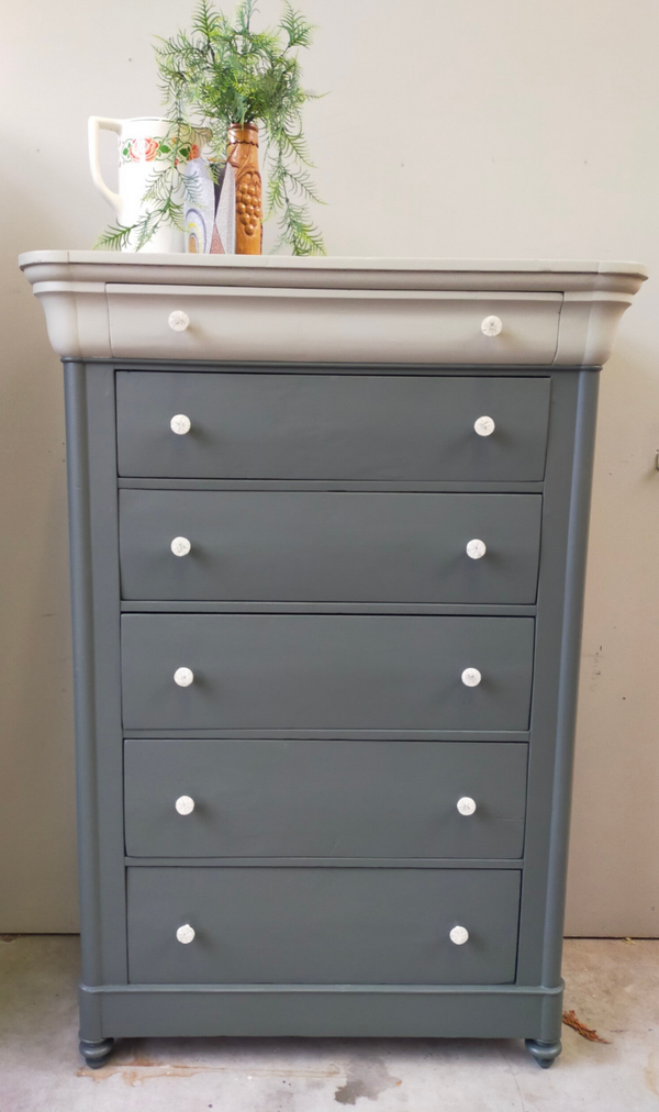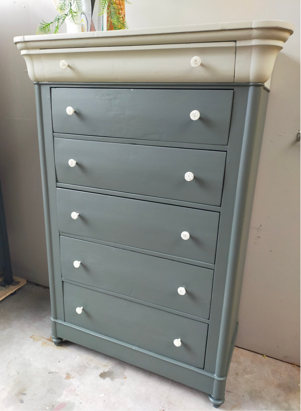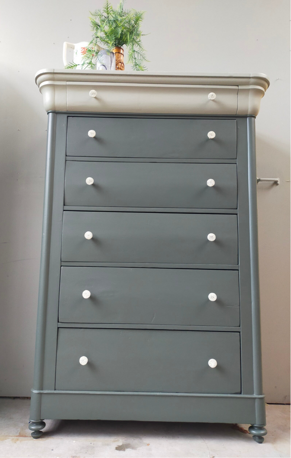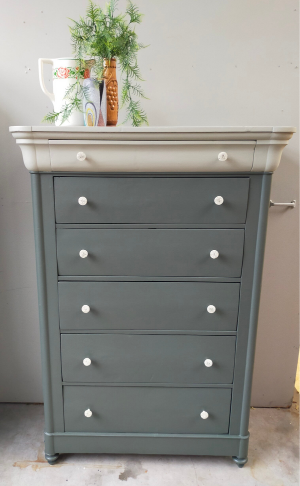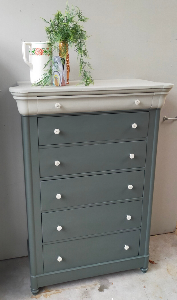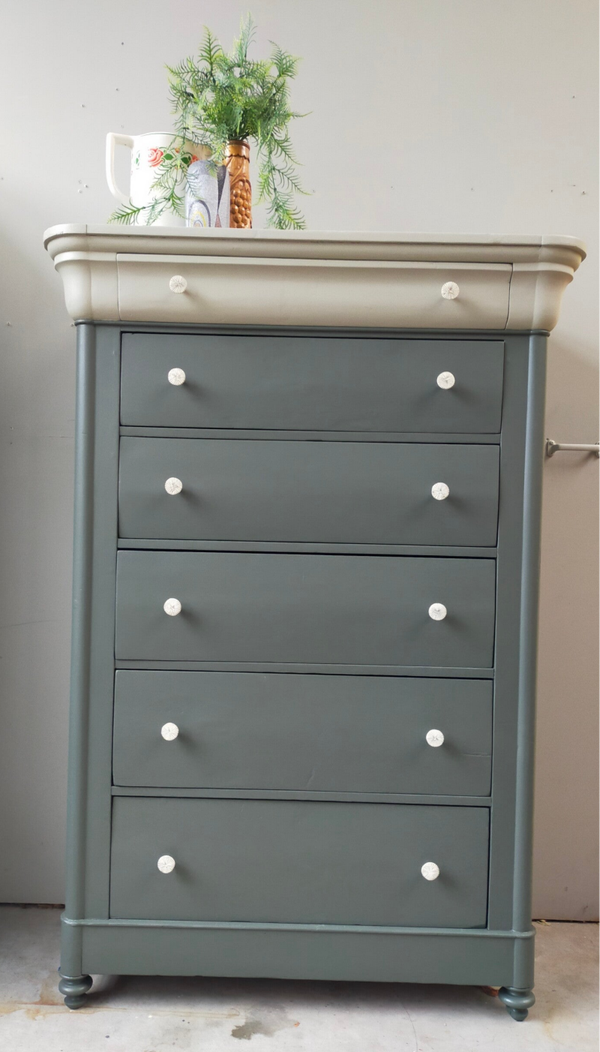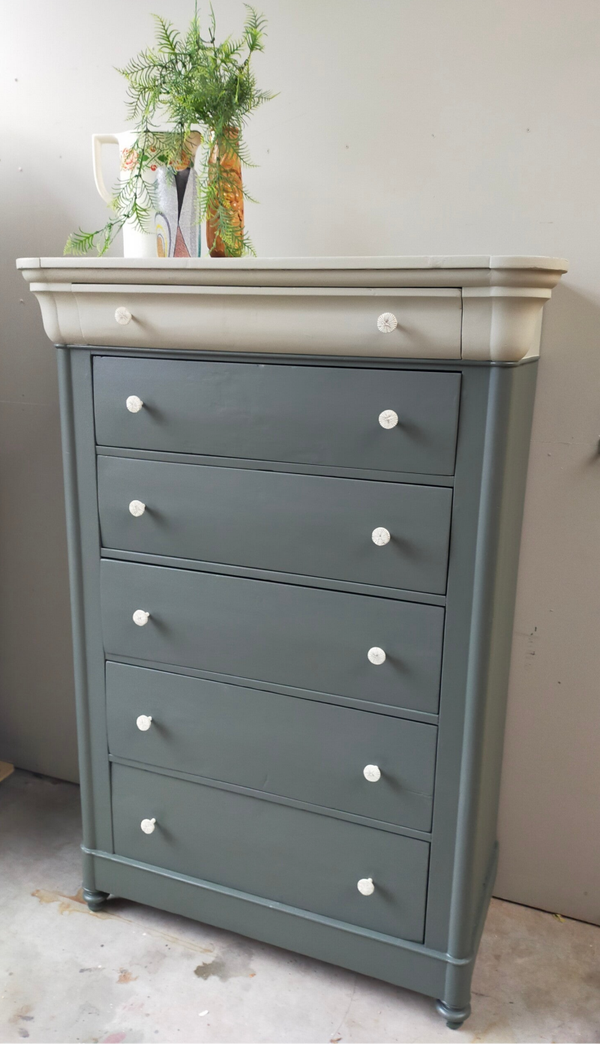 Een oude vrouw deze dame, zo mag je haar best noemen. Hoewel de tijd her en der haar sporen heeft achter gelaten, kunnen we niet anders zeggen dat ze gezien haar leeftijd echt nog in een zeer goede conditie is. De lades lopen prima en zijn voorzien van leuke knoppen. De kleuren die hier zijn gebruikt zijn Everett en Eucalytus van Fusion Mineral Paint. Deze 2 halen het beste in elkaar naar boven. Zowel hun groen tinten als hun grijze ondertonen gaan uitstekend samen en maken het geheel tot iets zeer prettigs. En....niet geheel onbelangrijk.... ze is uniek in haar soort! Een mooi formaat opberger en nog mooi ook !