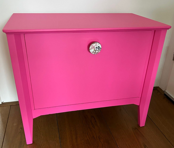 Super vrolijk dit knal roze klep kastje. Te gek voor een meidenkamer of een kleurrijk interieur. Waanzinnig leuke en toffe knop er op, helemaal af zo toch?