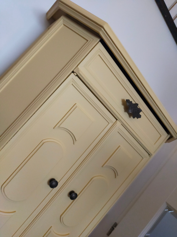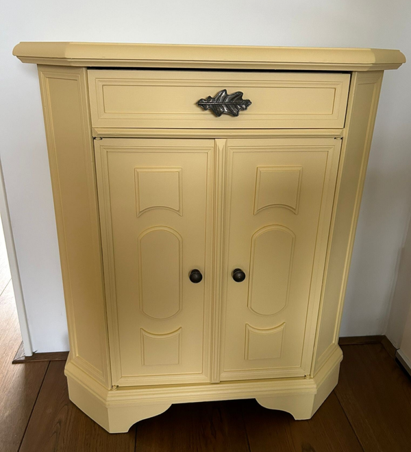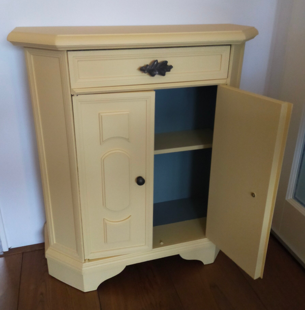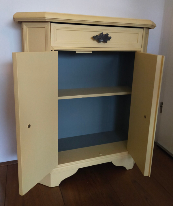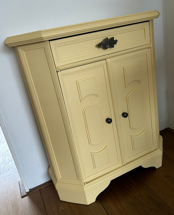 Het ideale model voor in de hal, maar ook voor in een wat kleinere slaapkamer of woonkamer of.....nou genoeg plekjes waar dit leuke "zogenaamde" halkastje kan shinen. De kleur is een pastel geel, te weten Buttermilk Cream van Fusion Mineral Paint. Wat een heerlijk fris geheel geeft aan dit kastje. Ook de binnenzijde hebben we mee geschilderd en wat dacht je van de waanzinnige knop op de lade, die past er wat ons betreft helemaal bij. Ook de deurtjes zijn voorzien van mooie bijpassende knopjes. Al met al een te gek kastje met veel potentie / mogelijkheden. Overigens sluit en loopt alles naar behoren.