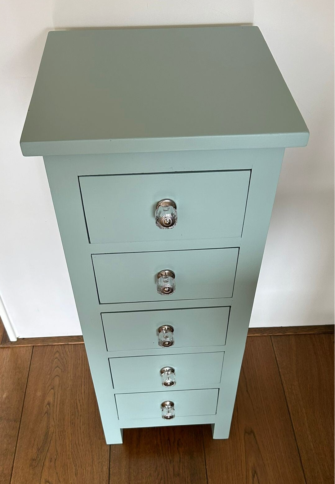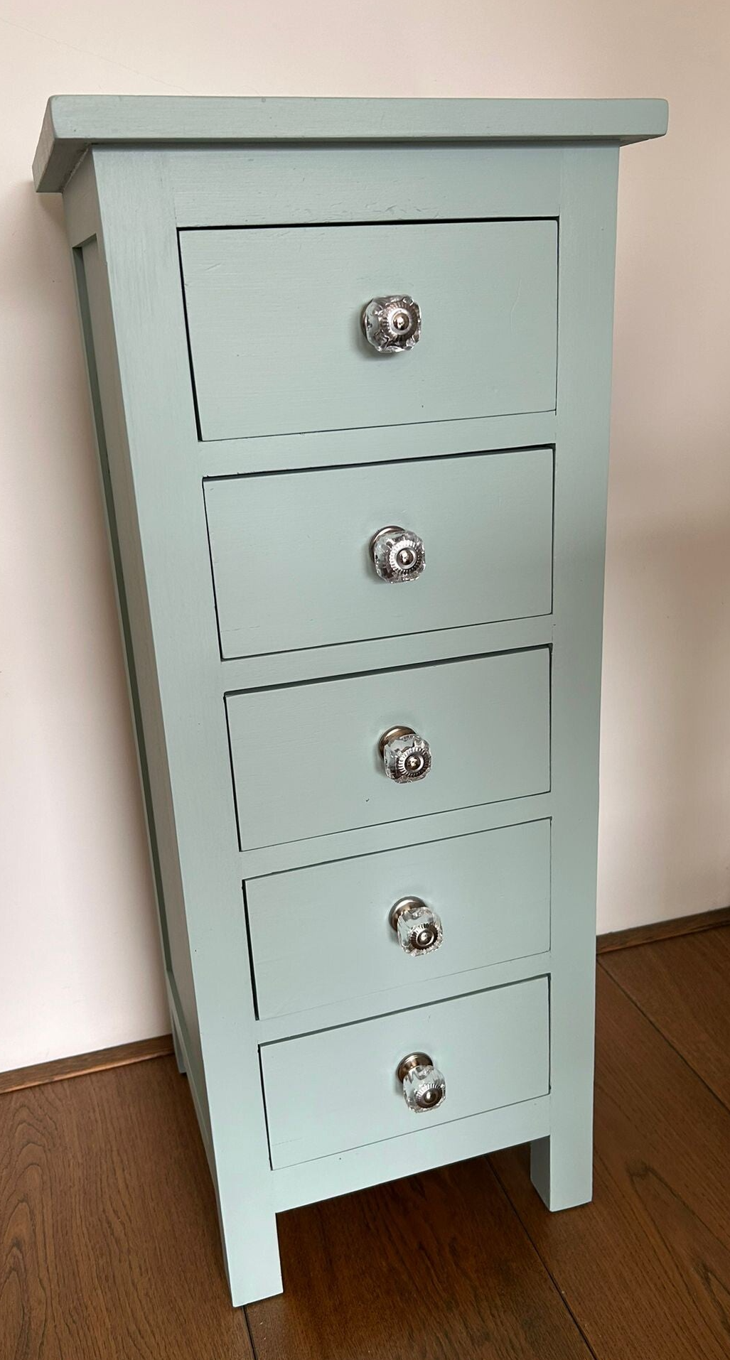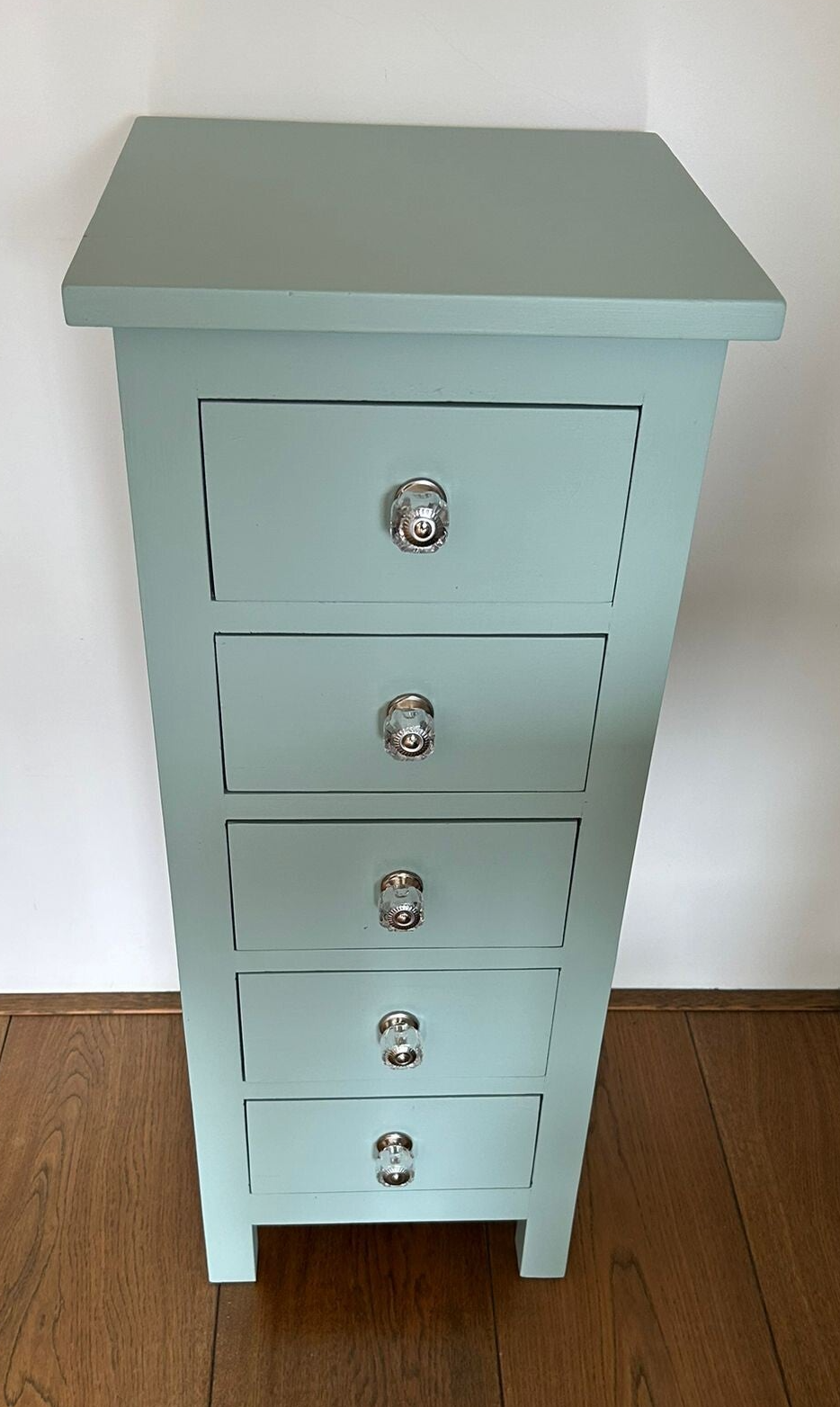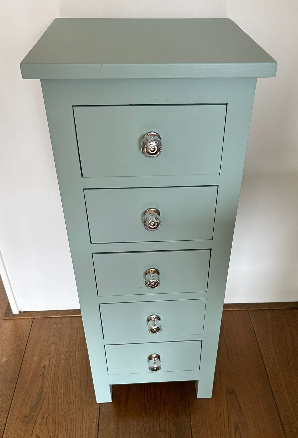 Een licht gewicht deze slanke dame of heer, maar dat maakt hem of haar niet minder leuk en mooi. Een echte blikvanger zo in de mooie zacht blauwe kleur, French Eggshell, van Fusion Mineral Paint. Op de lades hebben we subtiele, maar bijpassende, knoppen gezet, wat het helemaal van nu maakt.