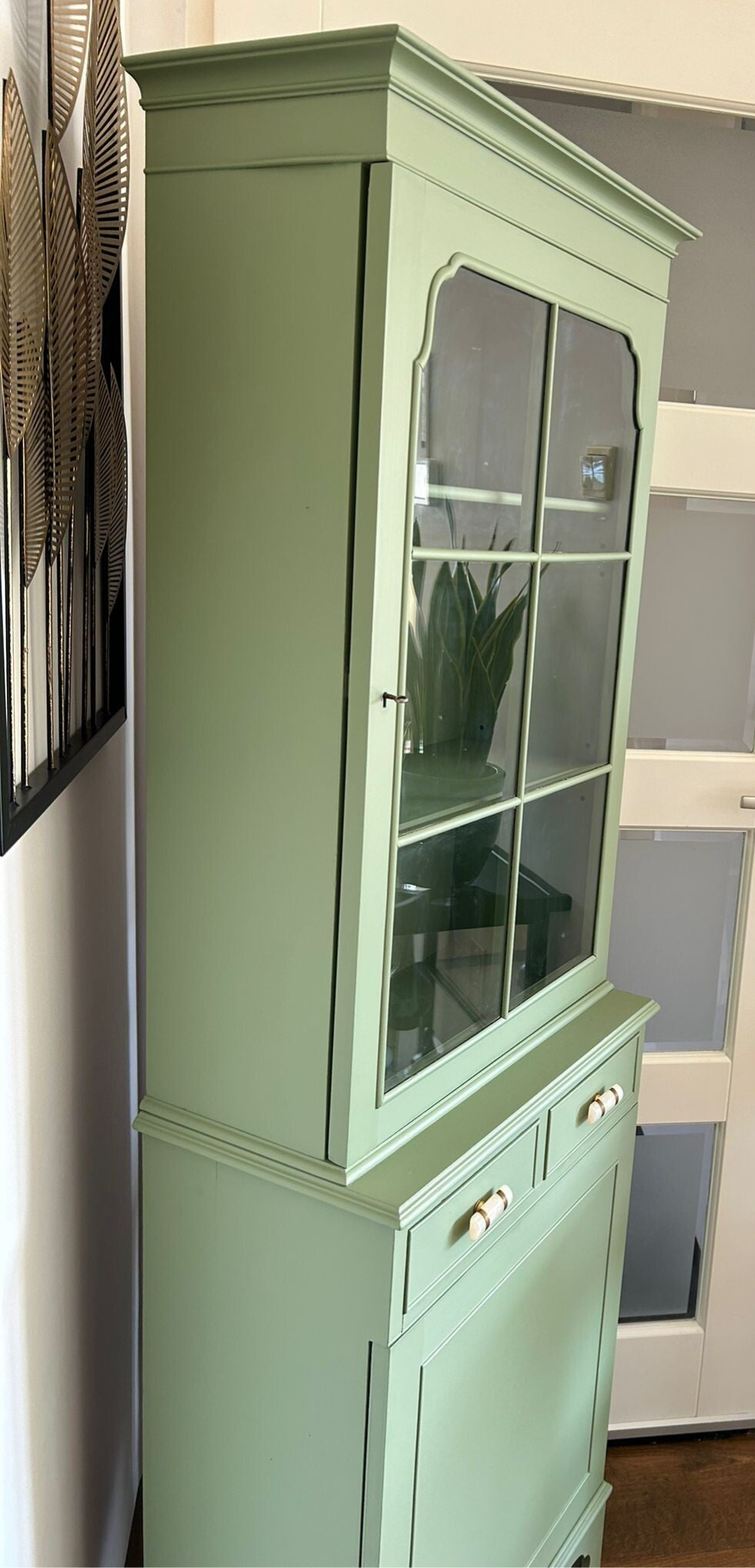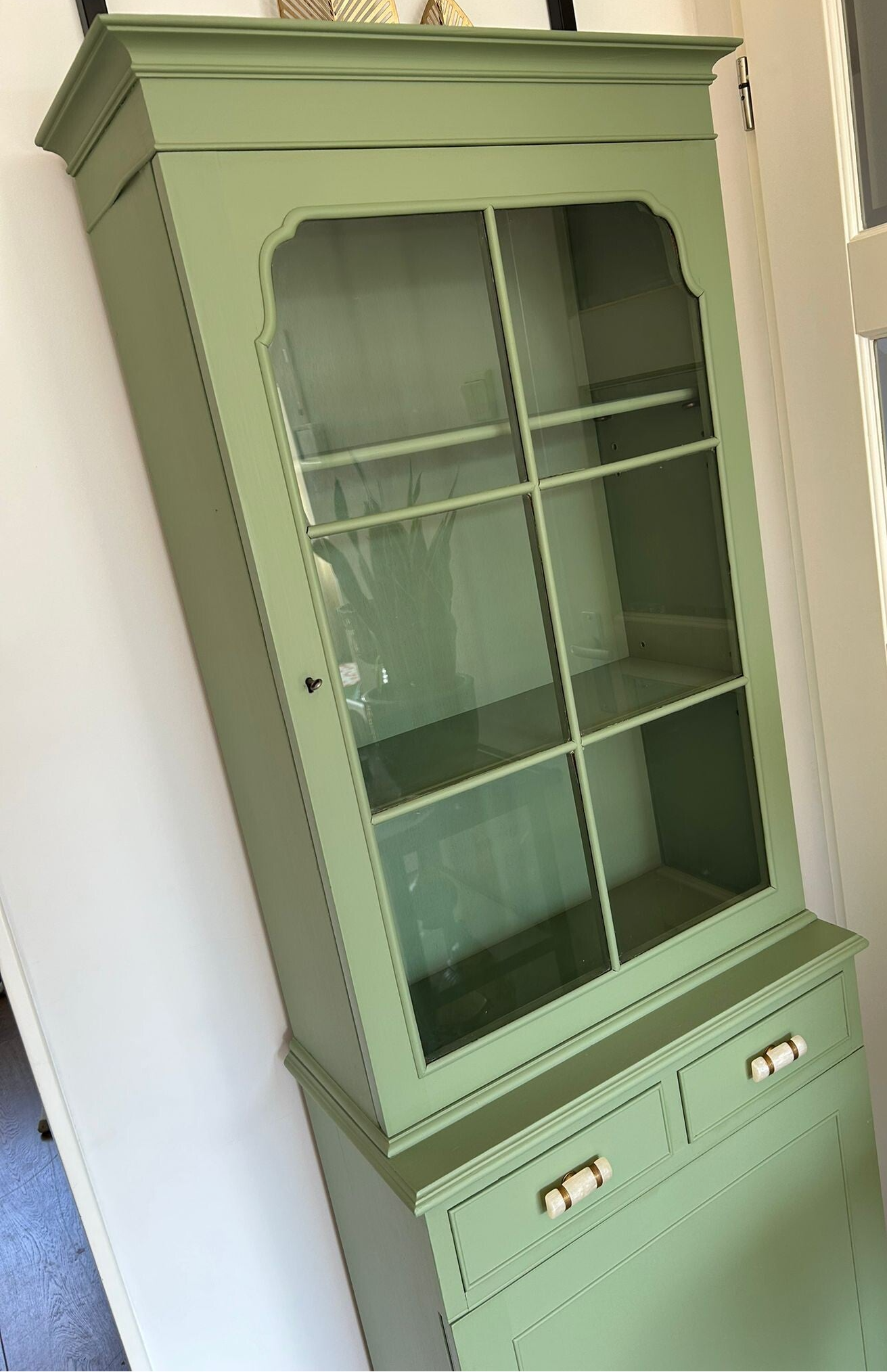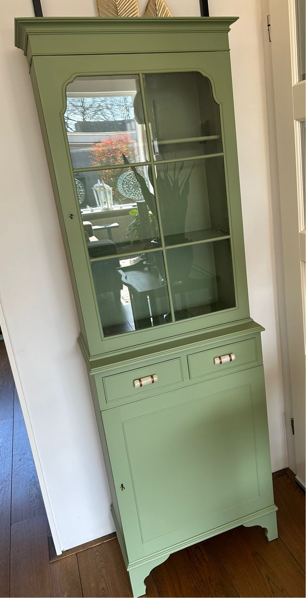 Een werkelijk bescheiden model vitrine kast. Super handig voor in een gang, maar ook in een badkamer of keuken zou ze zeker niet misstaan. De kleur Conservatory van Fusion Mineral Paint is hier gebruikt, wat het geheel een frisse en warme uitstraling geeft. Op laatjes, die overigens goed sluiten, hebben we bijpassende greepjes gezet. De deurtjes sluiten middels het orginele slot met sleuteltje. Wat ons betreft een super leuk eindresultaat waar al snel een plekje voor is, toch?!