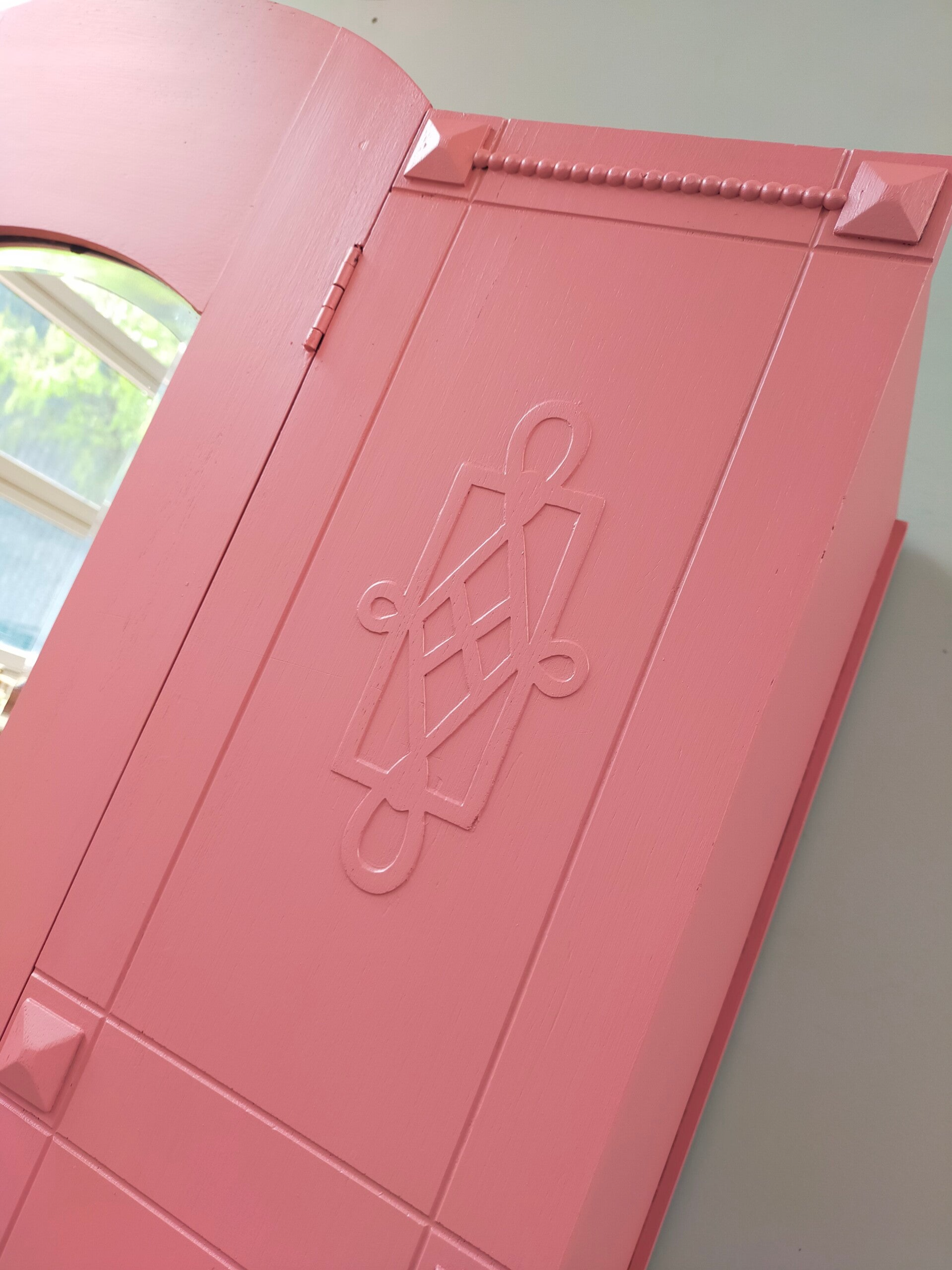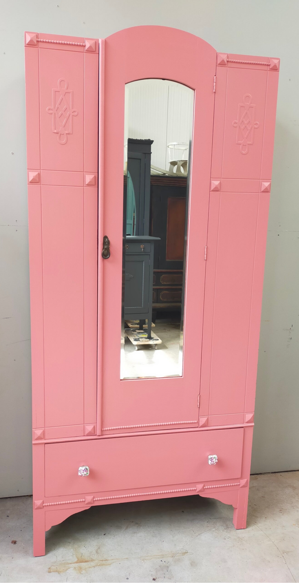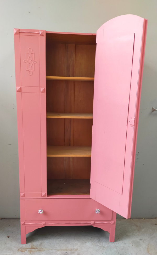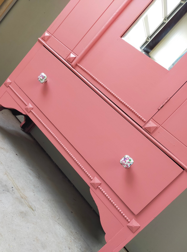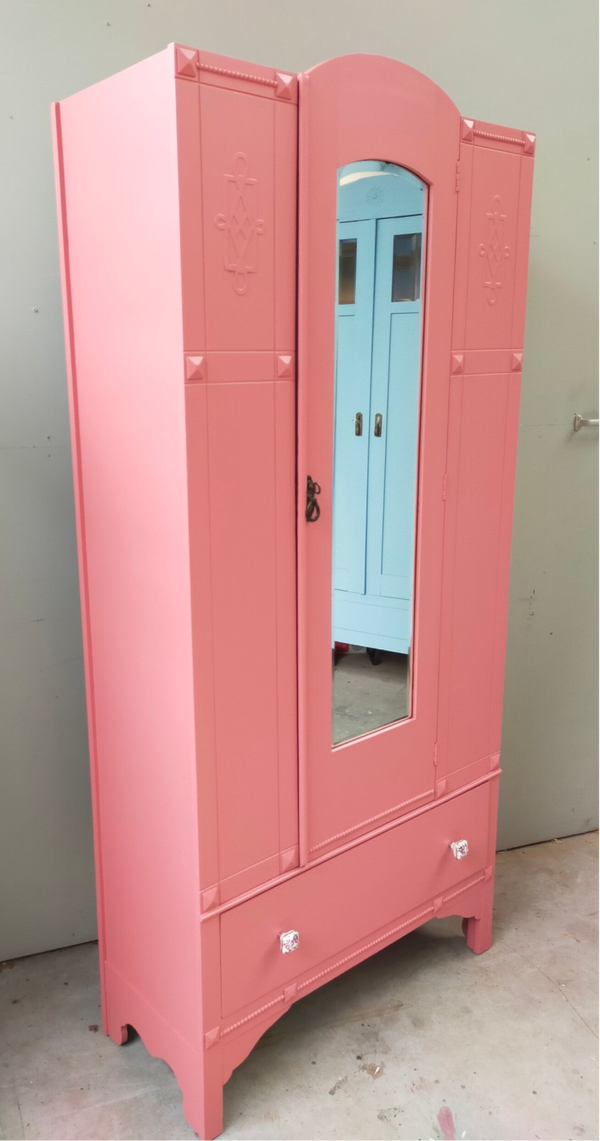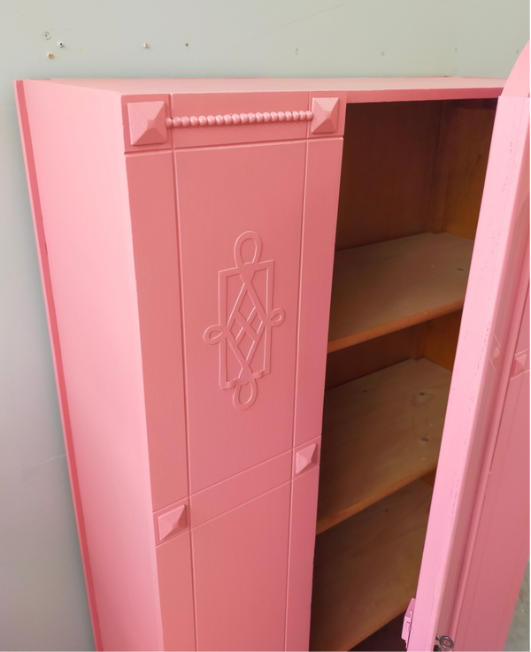 Een garderobekast of ook wel linnenkast genoemd en wat voor eentje ! Zeer mooi vormgeven, prachtige details en gezien de leeftijd van deze dame nog in top conditie. Uiteraard kan het niet anders dan dat de tijd zijn sporen heeft achter gelaten, maar dit is zeker niet storend. Functioneel is deze mooie dame zeker nog. De kleur is een combinatie van 2 tinten in de mix van Fusion Mineral Paint. Heerlijk wat planken lades in de kast dus genoeg opberg ruimte wat ons betreft.
