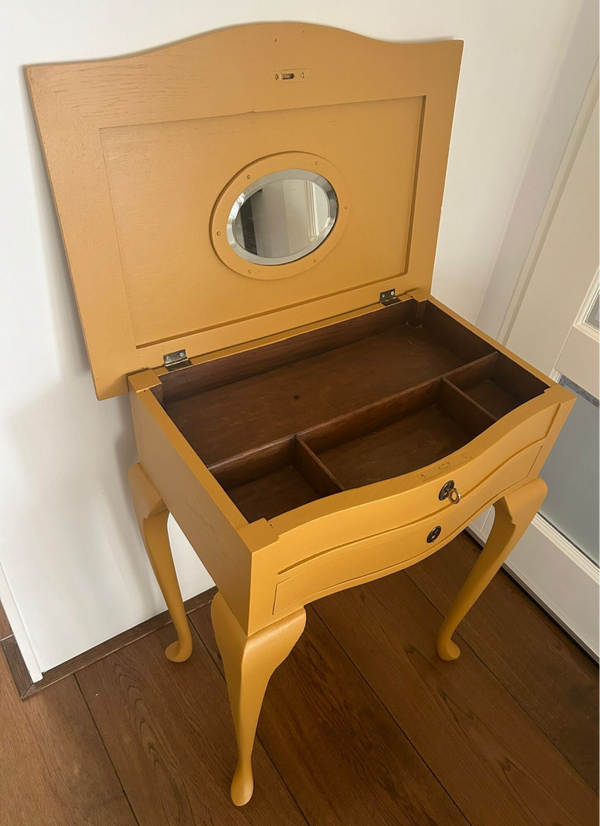 Is ze niet enig?! Erg mooi vormgegeven en een waanzinnig kleurtje al zeggen we het zelf. Dit tafelkastje heeft een laadje en een klep. Onder de klep een mooie vakverdeling en als klap op de vuurpijl een spiegeltje in de klep. Een ideaal kaptafeltje en/of make up tafeltje toch?