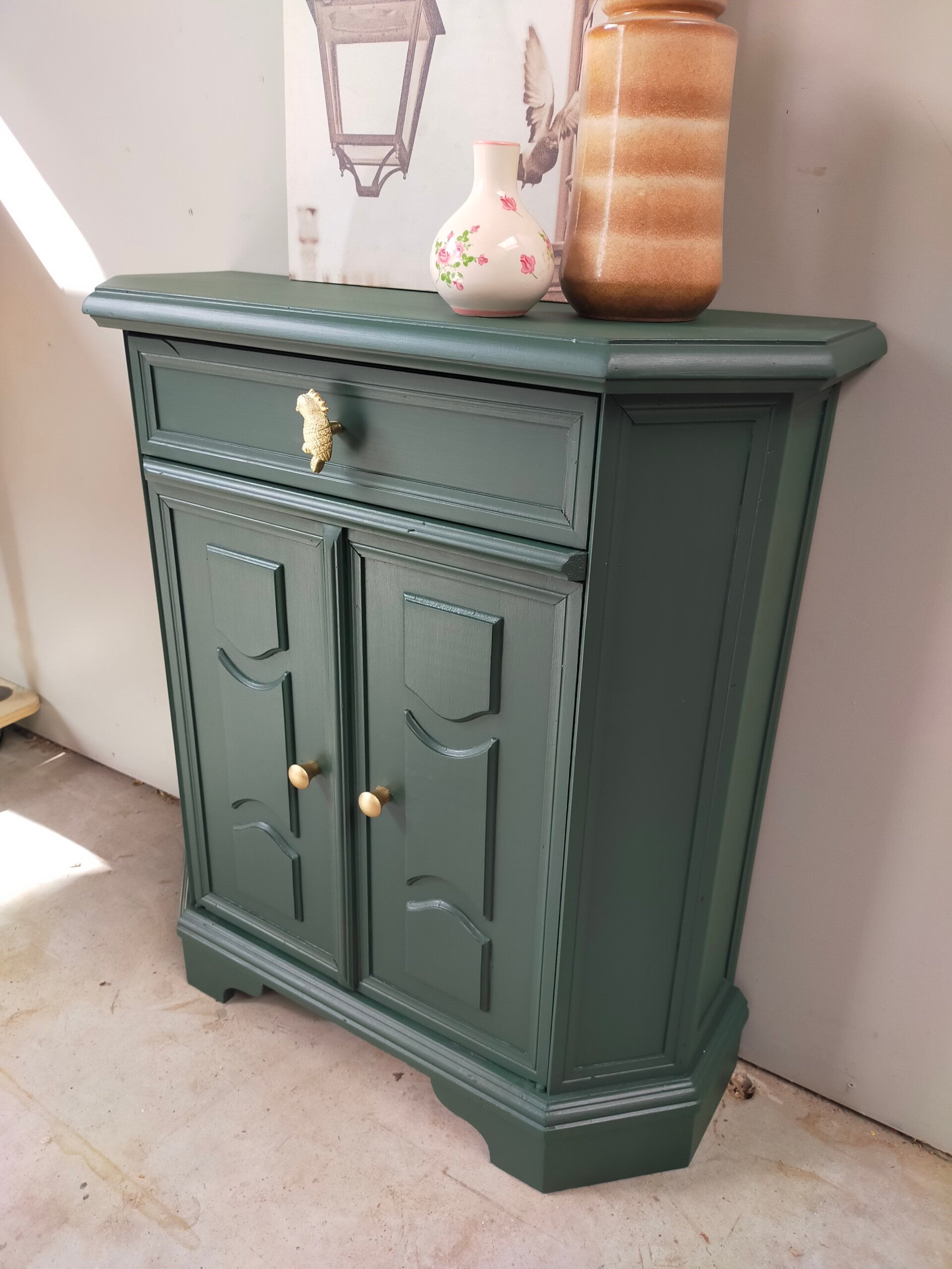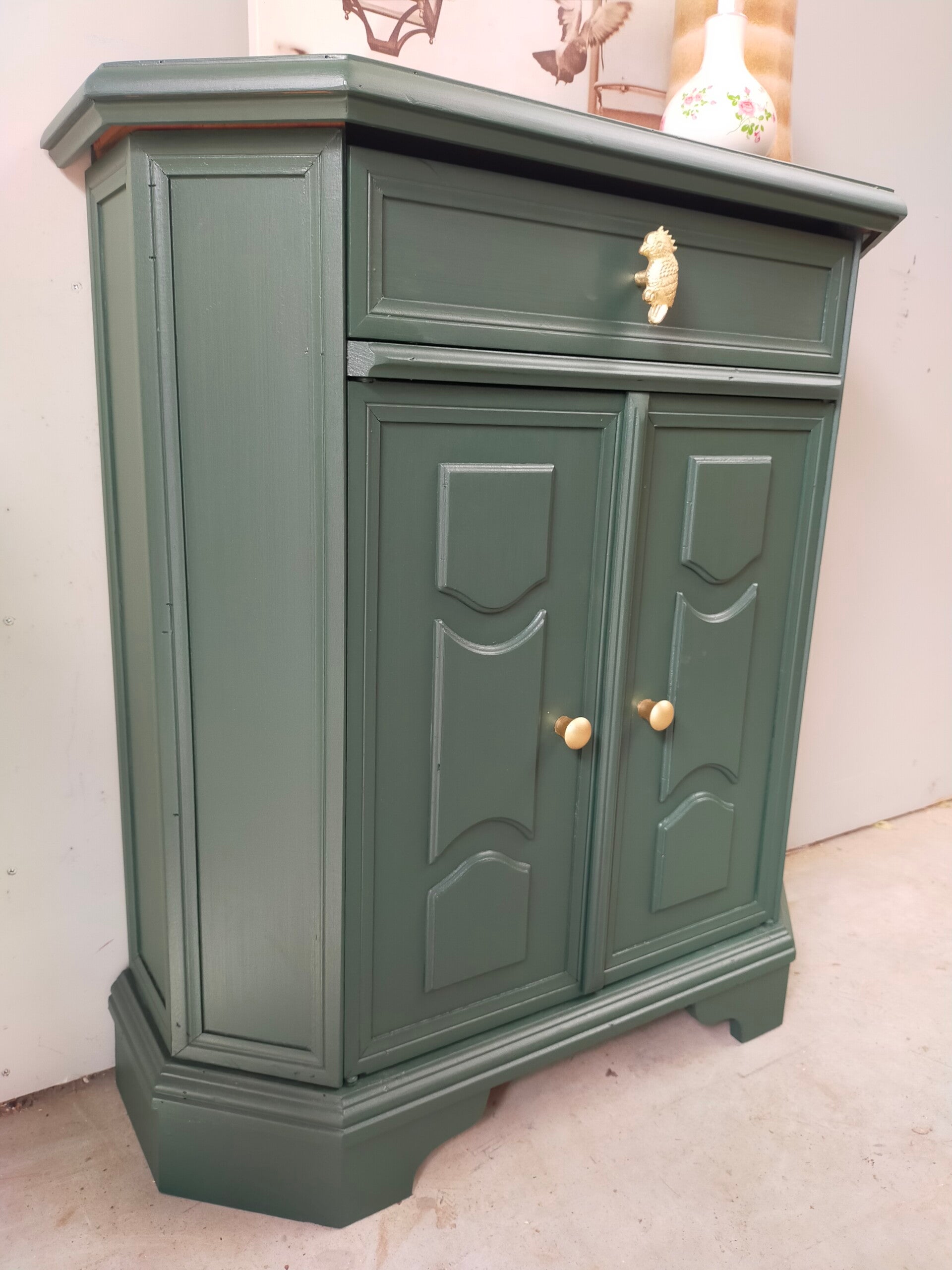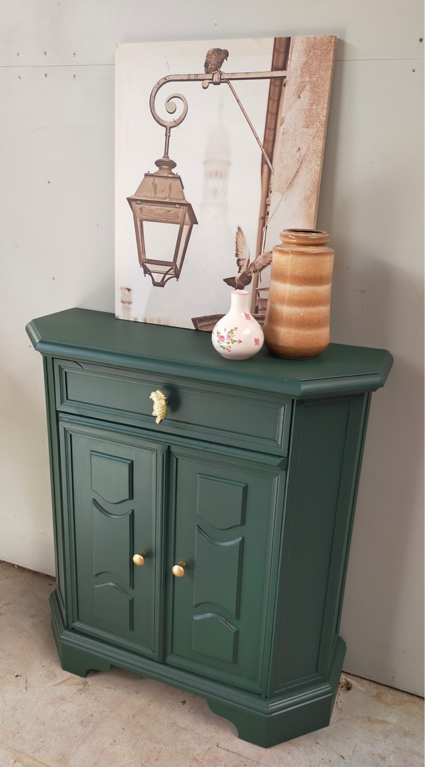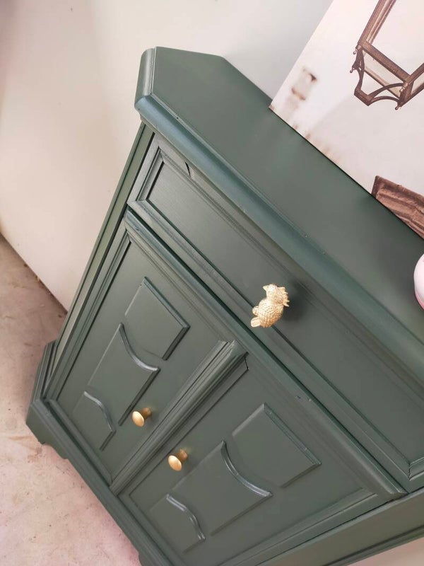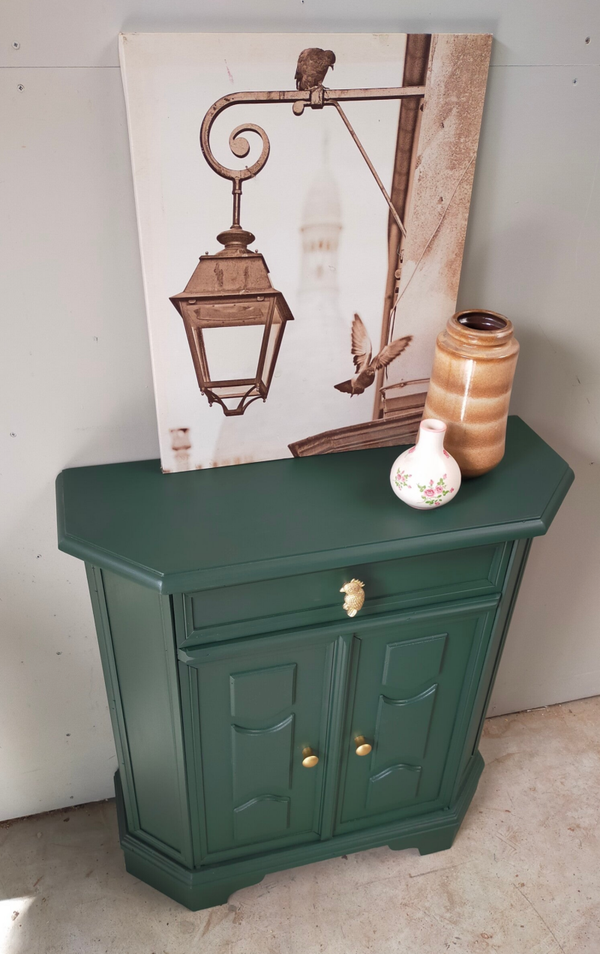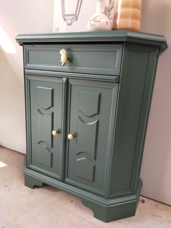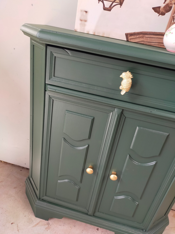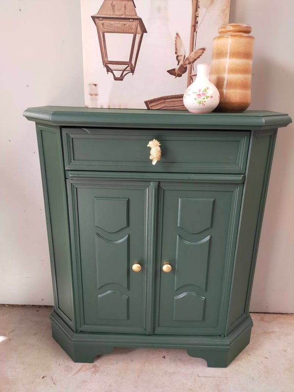 Het ideale model voor in de hal, maar ook voor in een wat kleinere slaapkamer of woonkamer of.....nou genoeg plekjes waar dit leuke "zogenaamde" halkastje kan shinen. De kleur is een intens groene tint, te weten Manor Green van Fusion Mineral Paint. Ooh en wauw, heb je die waanzinnige knop op de lade gezien, die past er wat ons betreft helemaal bij. Ook de deurtjes zijn voorzien van mooie bijpassende knopjes. Al met al een mooi en praktisch kastje met veel potentie / mogelijkheden.