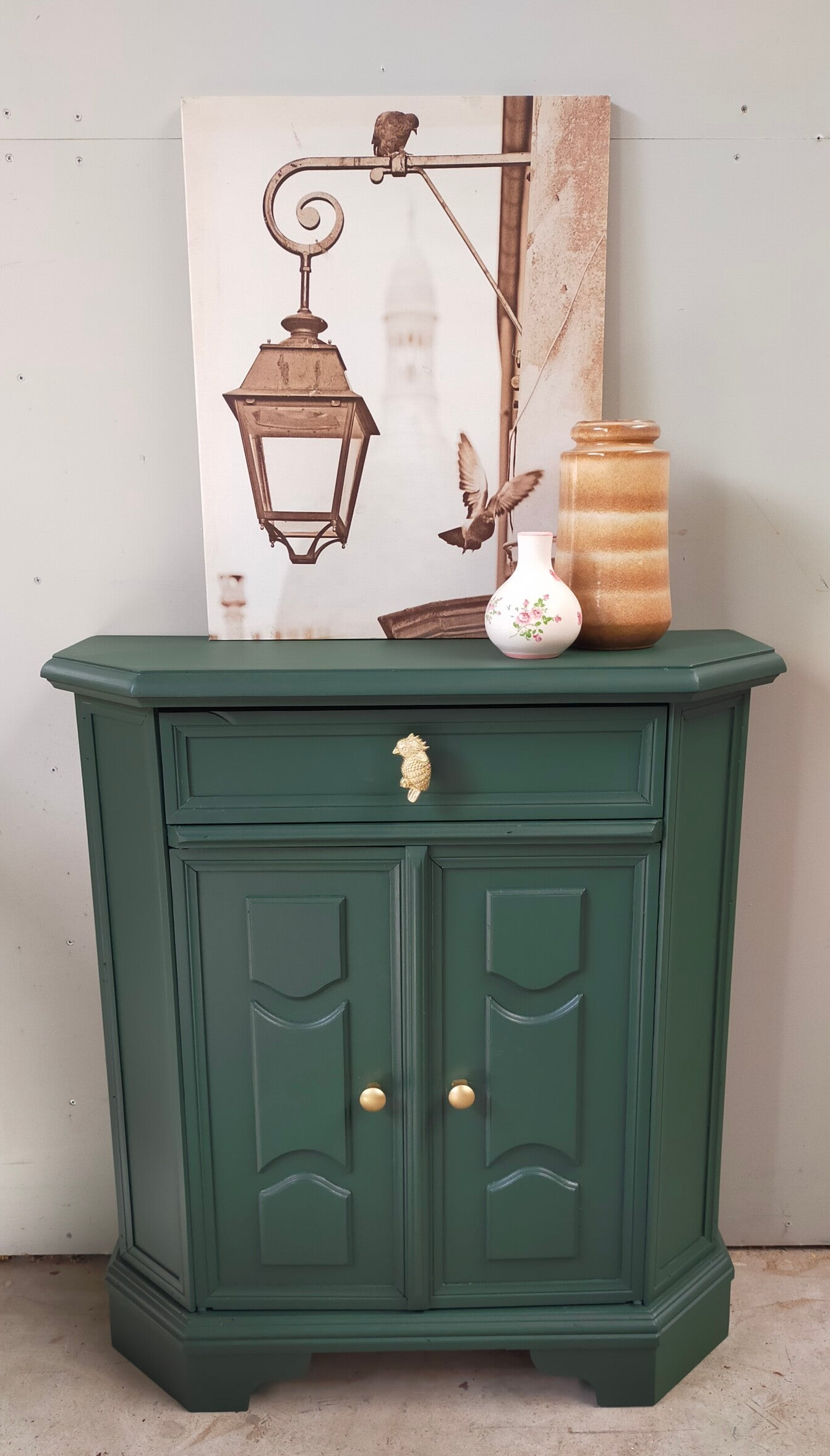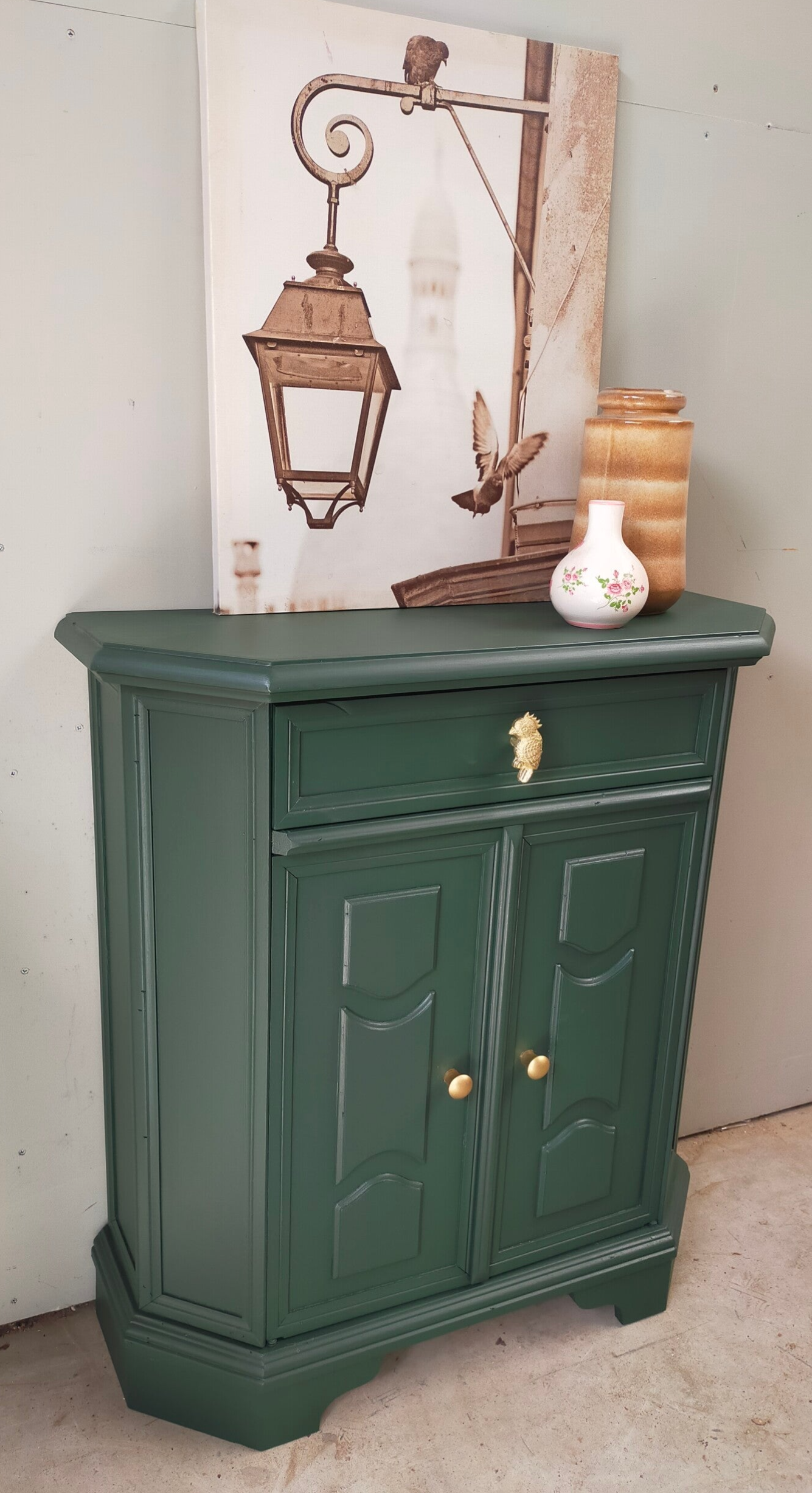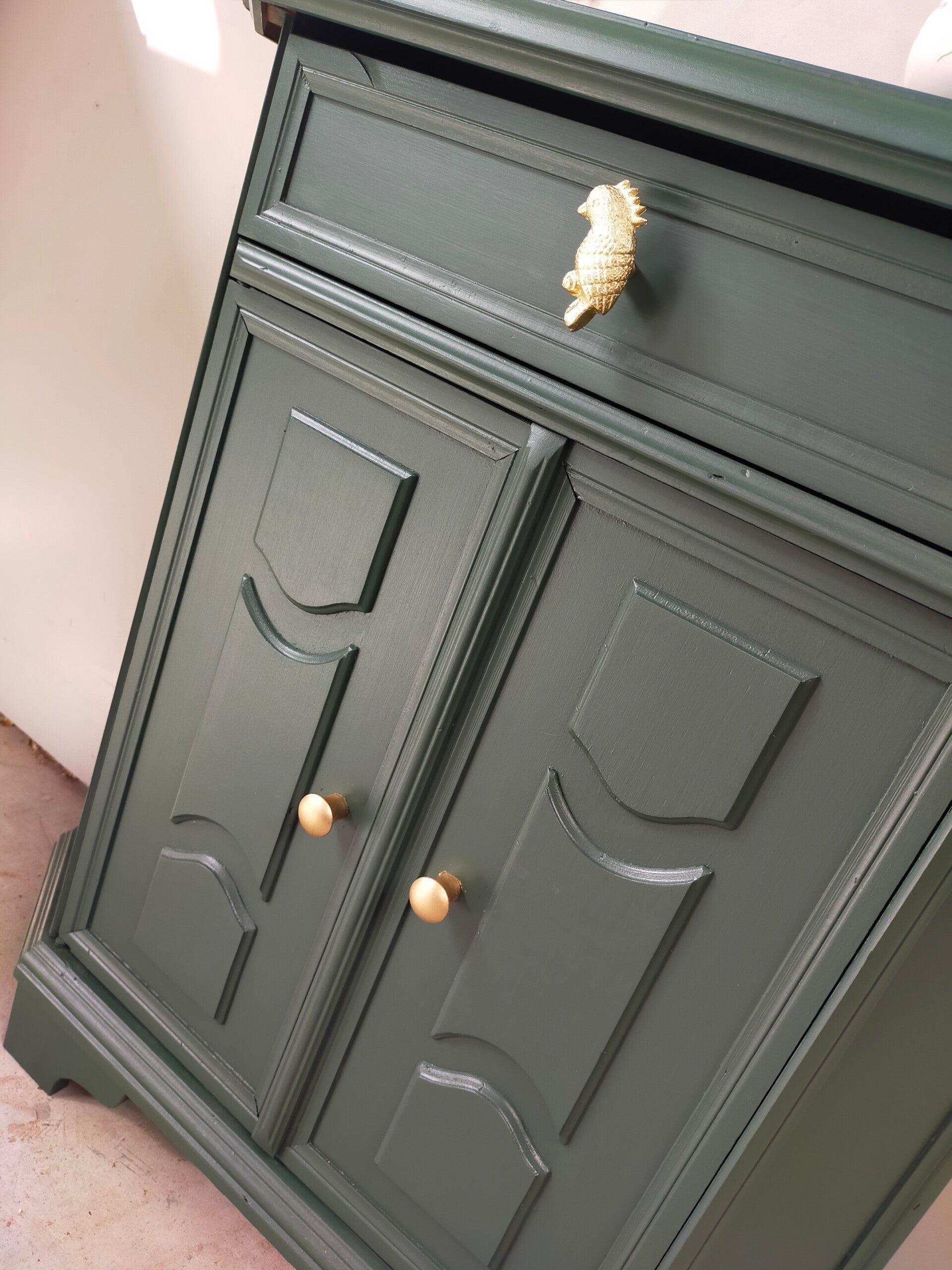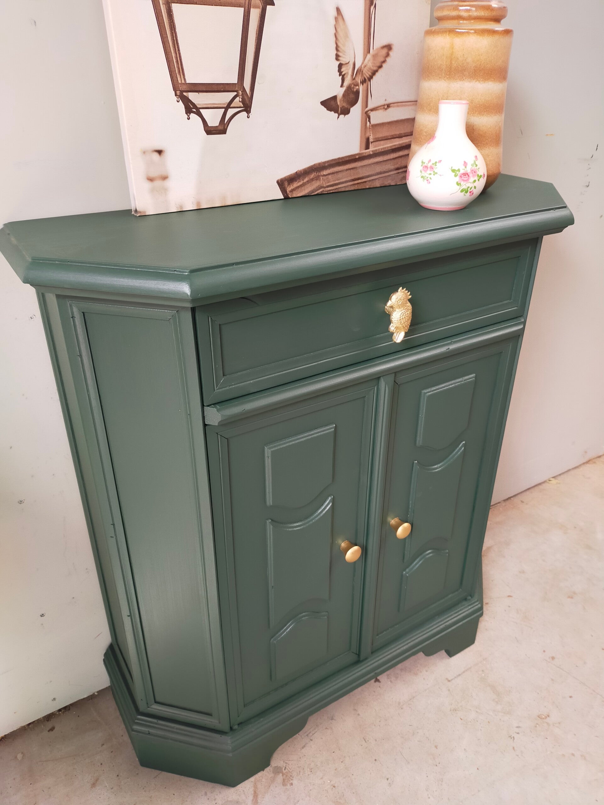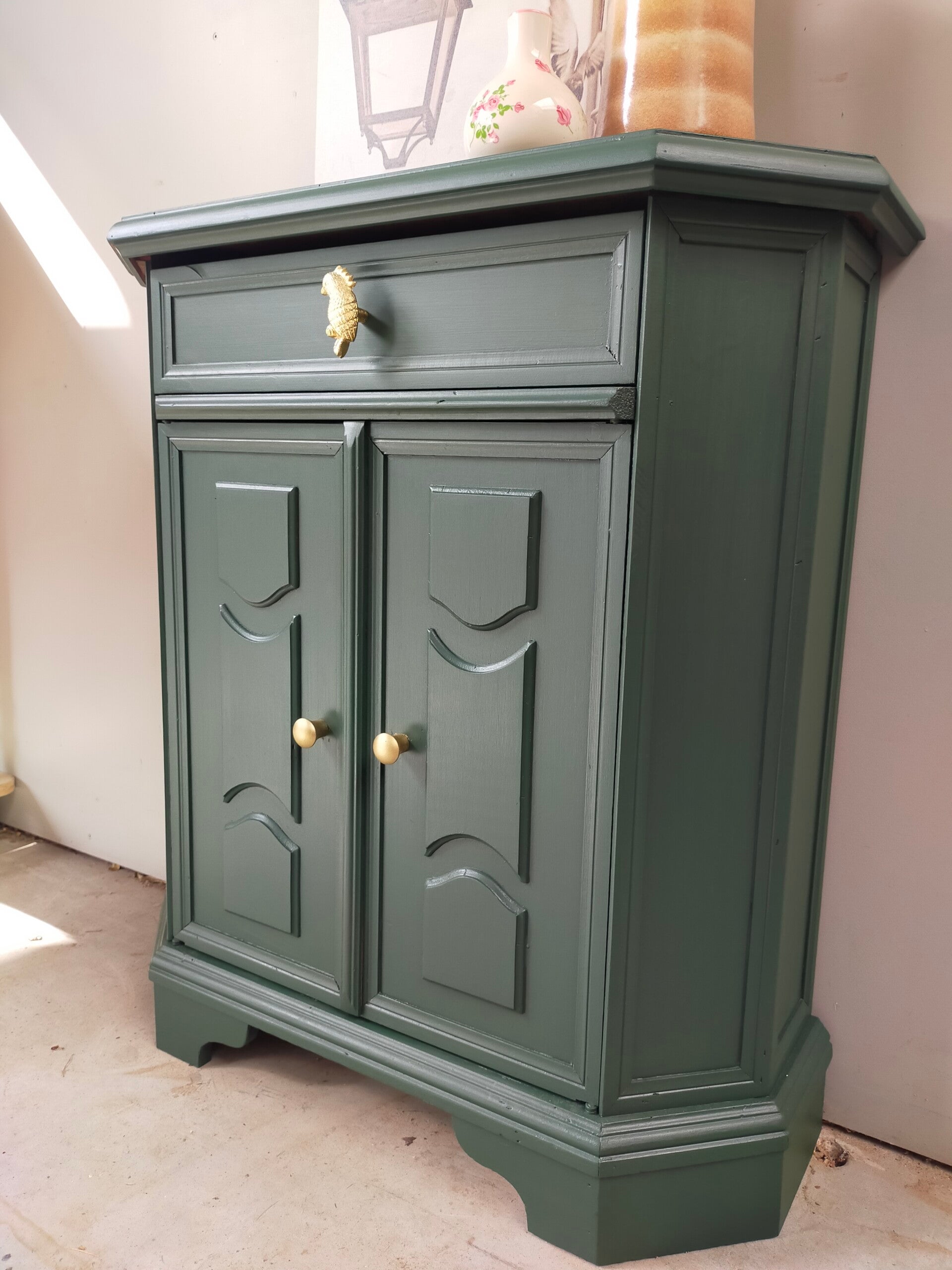 Het ideale model voor in de hal, maar ook voor in een wat kleinere slaapkamer of woonkamer of.....nou genoeg plekjes waar dit leuke "zogenaamde" halkastje kan shinen. De kleur is een intens groene tint, te weten Manor Green van Fusion Mineral Paint. Ooh en wauw, heb je die waanzinnige knop op de lade gezien, die past er wat ons betreft helemaal bij. Ook de deurtjes zijn voorzien van mooie bijpassende knopjes. Al met al een mooi en praktisch kastje met veel potentie / mogelijkheden.