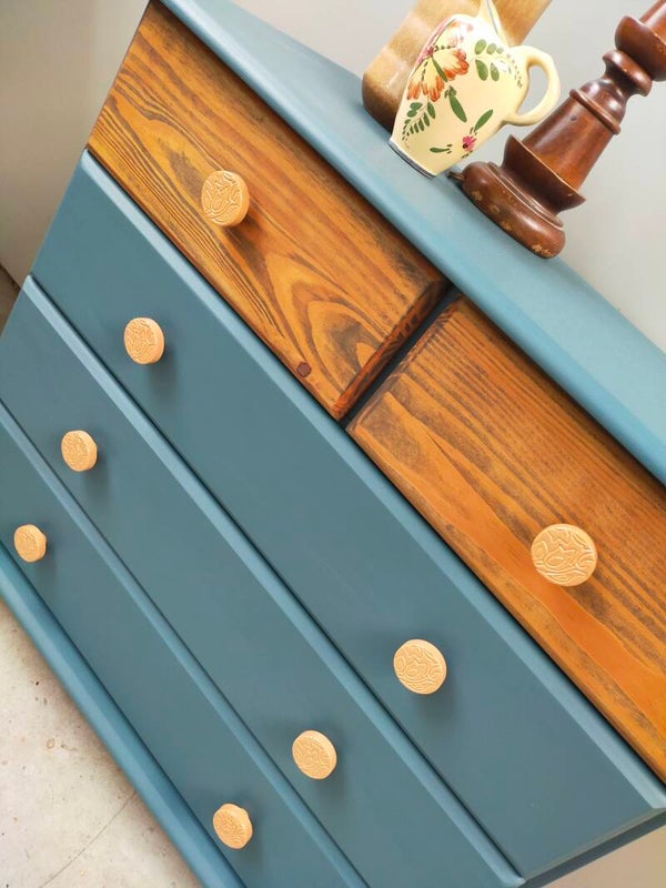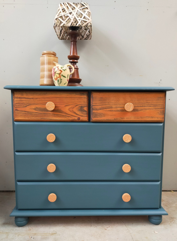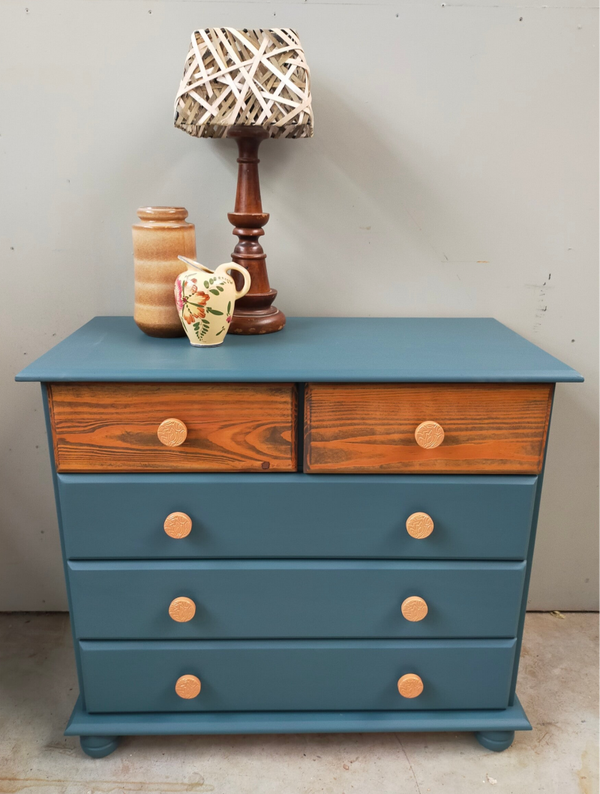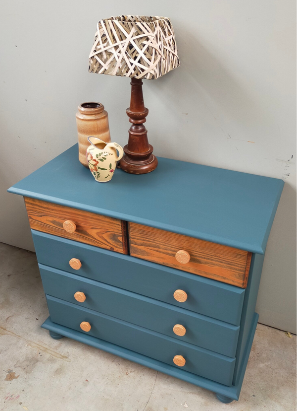 Een fijne ladenkast, strakke lijnen en bescheiden afmetingen. De kleur Homestead Blue van Fusion Mineral Paint in combinatie met de 2 lades in cappunccino maakt deze kast een lust voor het oog. Uiteraard hebben we hier ook weer gezocht naar bijpassende knoppen, zodat het allemaal een geheel is en klopt bij elkaar.