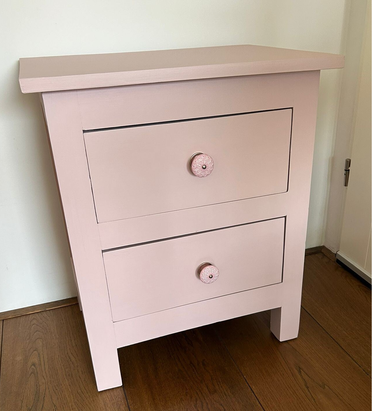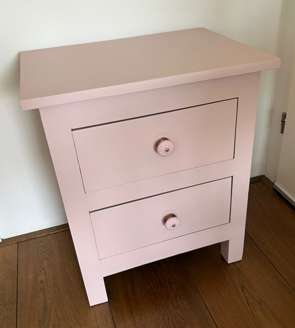 Wat een dot van een kastje is dit geworden. In een zeer subtiele roze tint Rosewater van Fusion Mineralpaint. De knopjes geven net dat beetje extra's. Uiteraard lopen de laadjes uitstekend. Gezien de afmetingen heb je hier al snel een plekje voor toch?!