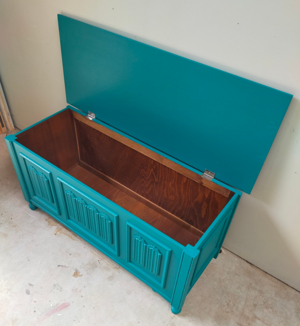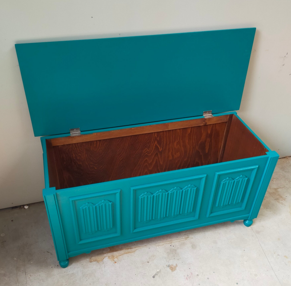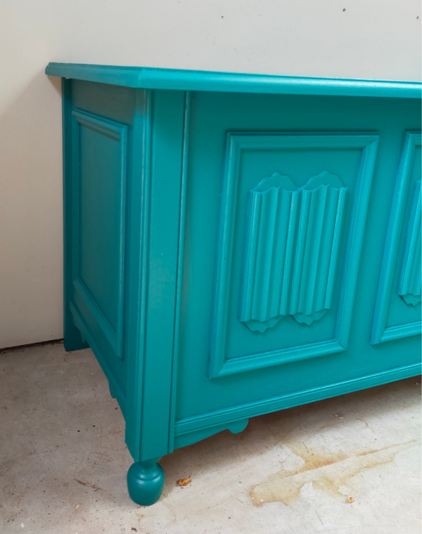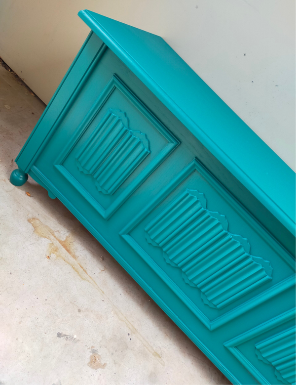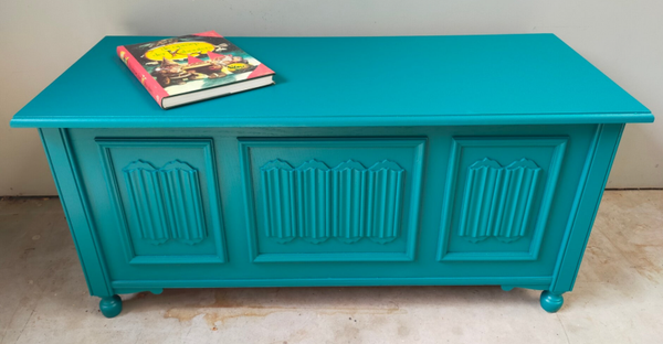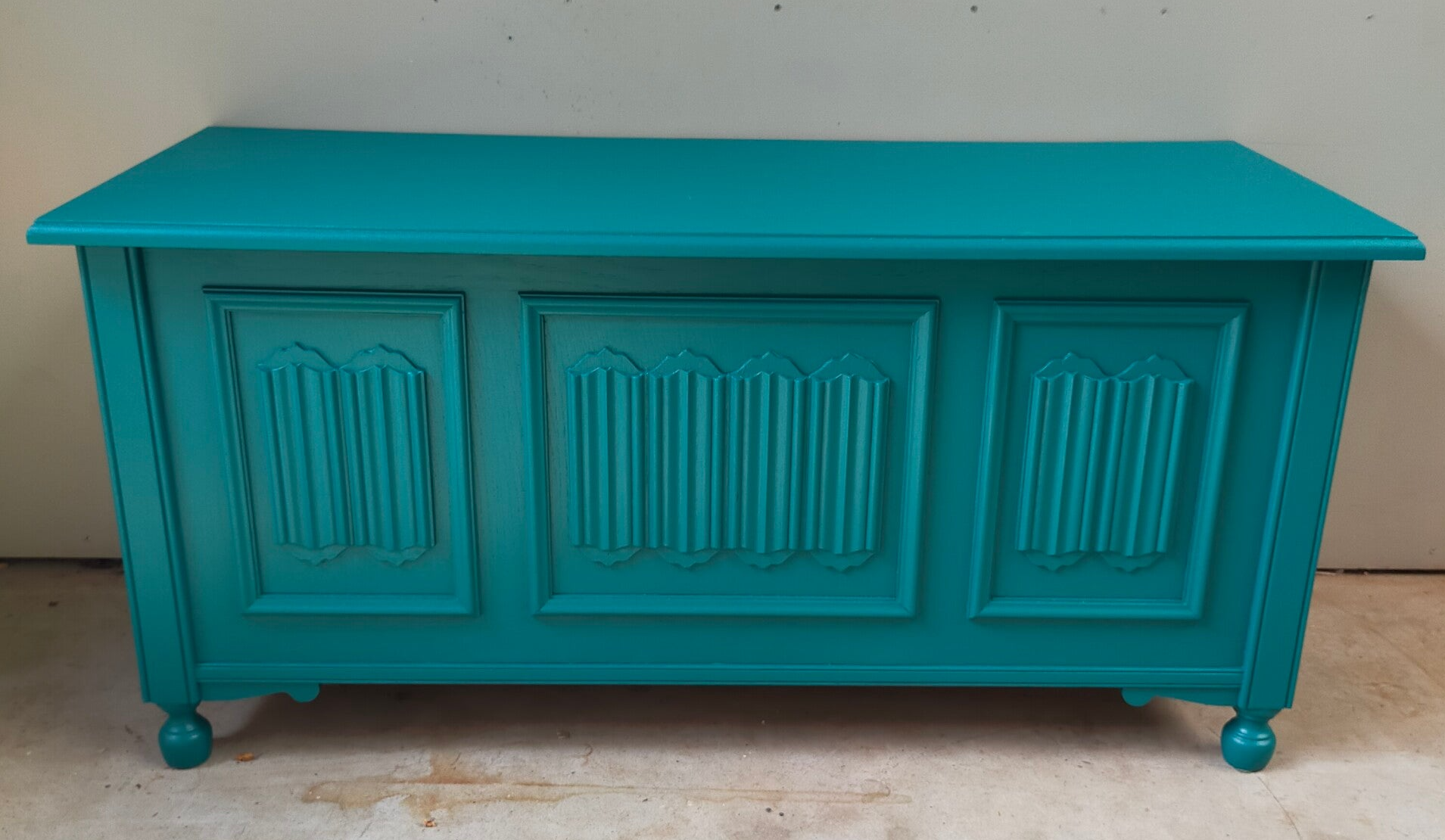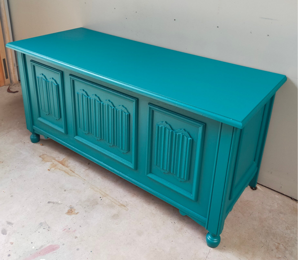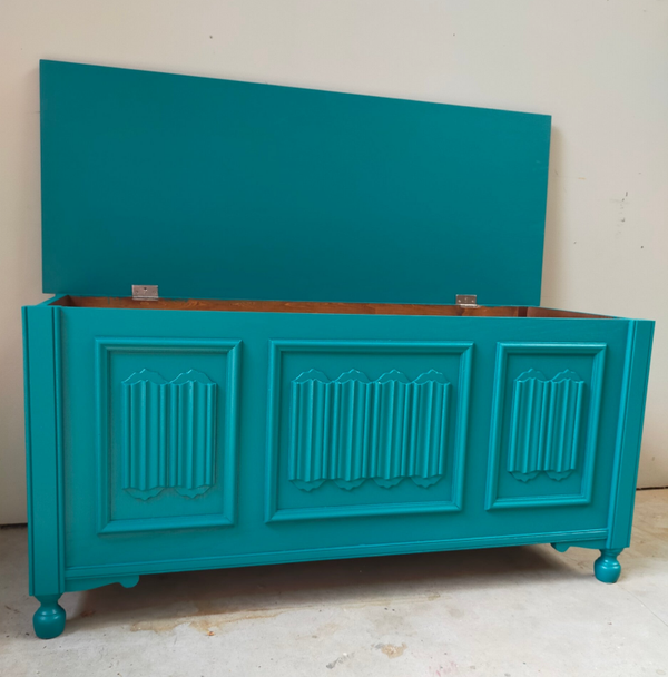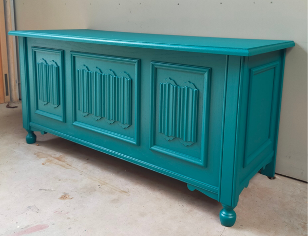 Een mooie, stevige en mooi vormgegeven dekenkist. Ook uitstekend te gebruiken als bankje, maar als tv meubel zou deze kanjer ook niet misstaan. De waanzinnige mooie kleur Renfrew Blue van Fusion Mineral Paint, past wat ons betreft echt goed bij deze klep kist. Het mooie houtsnij werk komt zo goed tot zijn recht. Tuurlijk is het een heerlijke eyecather, maar bovenal een praktisch meubel waar je tevens een hele hoop in kan opbergen.