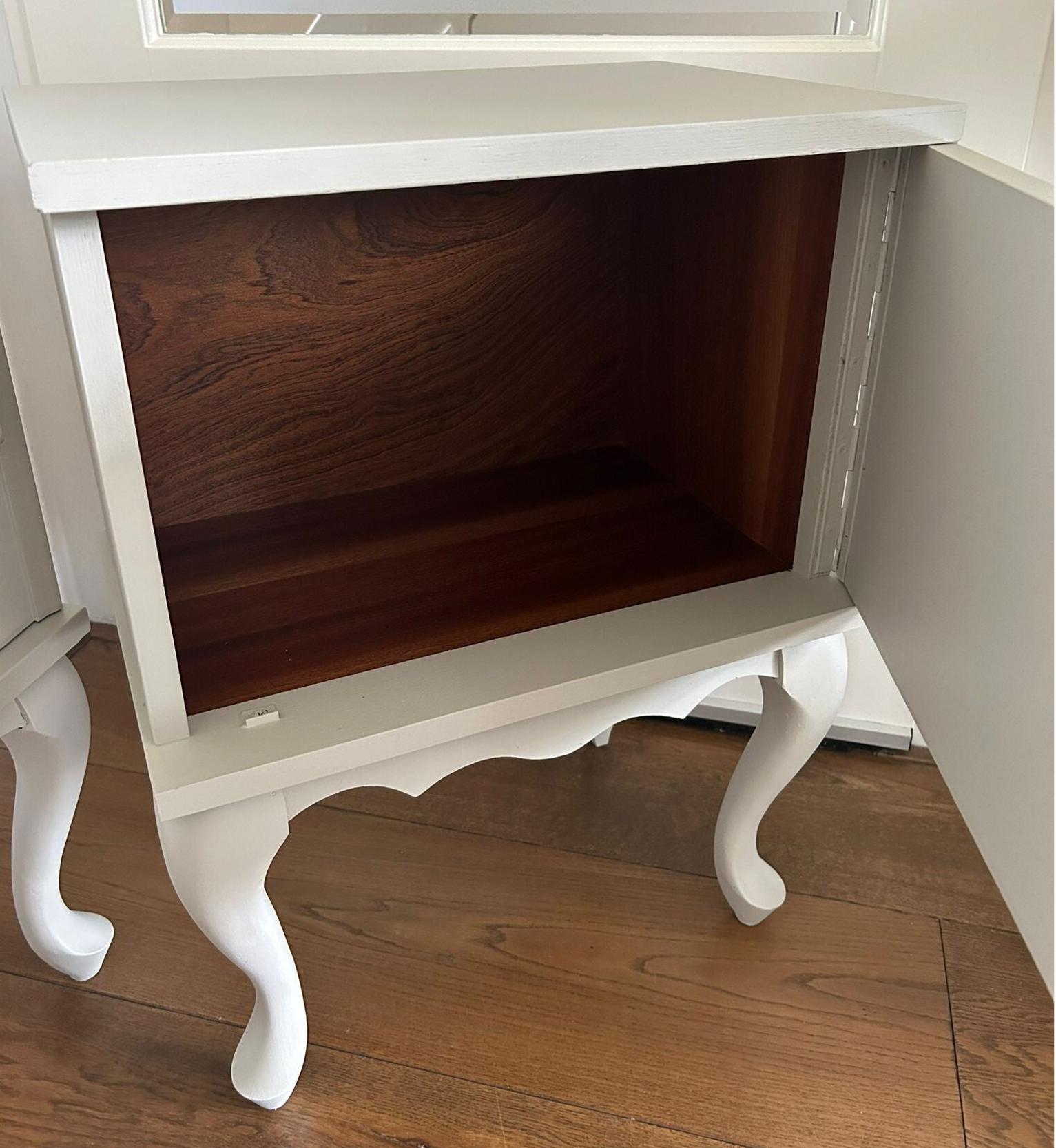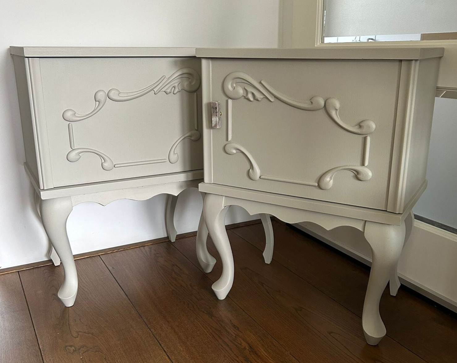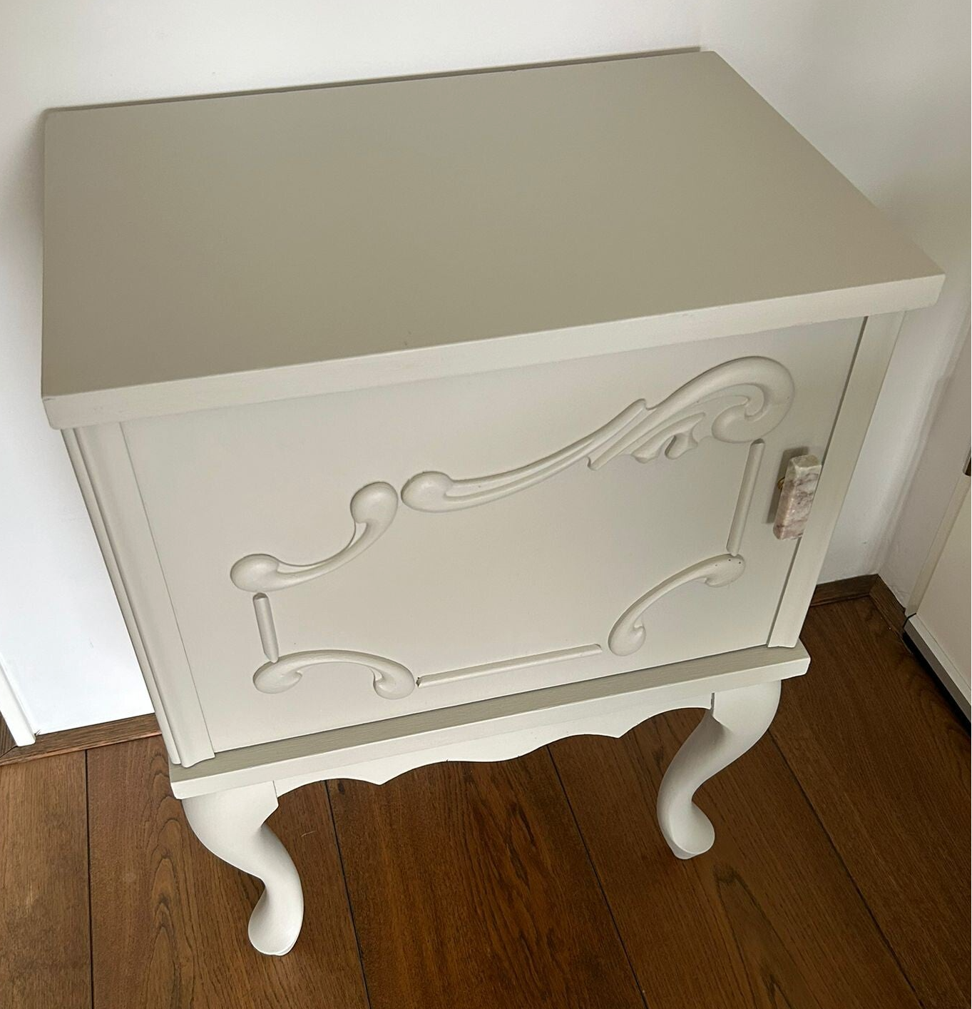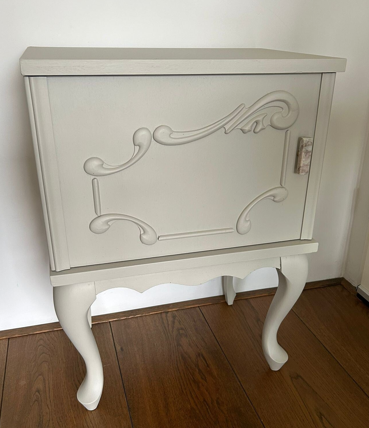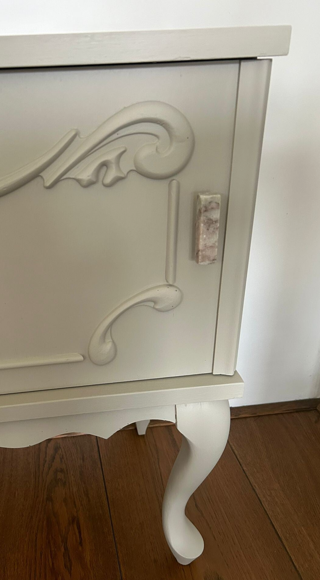 Een prachtige set in de mooie kleur Putty van Fusion Mineral Paint. Deze kenmerkt zich als een warme beige/creme tint. Mooie vormgeving, sierlijke pootjes en de details qua houtsnijwerk mogen we ook niet vergeten te benoemen. De deurtjes zijn voorzien van een mooie bijpassende marmer / natuursteen knop.