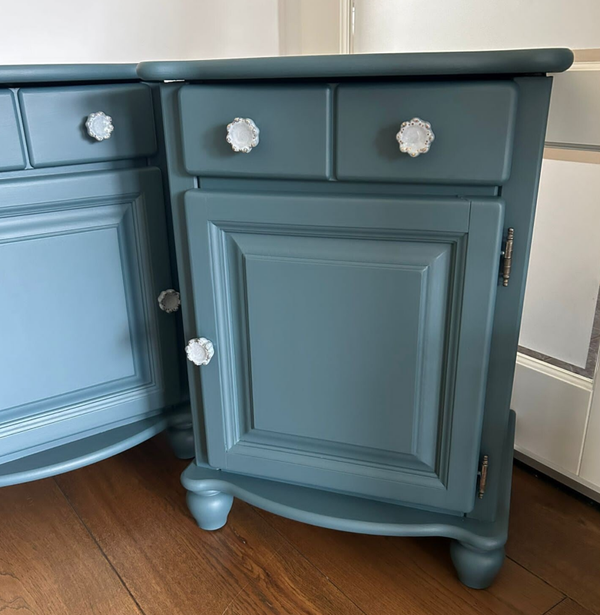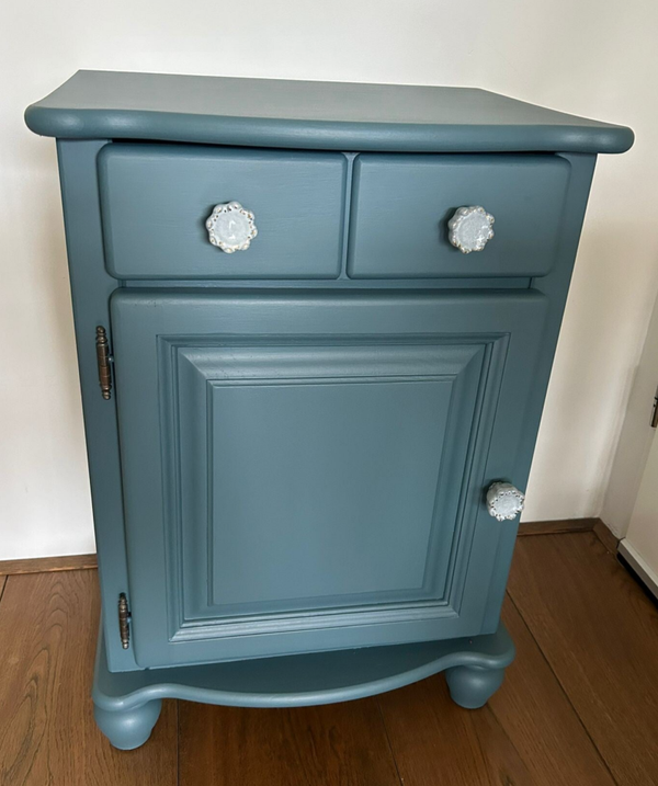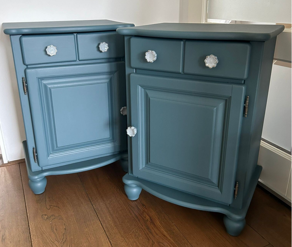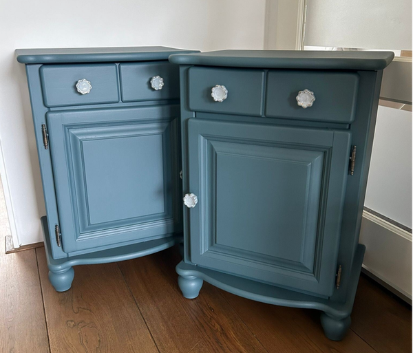 Een prachtige set nachtkastjes in de mooie kleur Homestead Blue van Fusion Mineral Paint. Mooie vormgeving als mede mooie bijpassende porseleinen knoppen op de lade en deurtje. Een heerlijk stel zo samen !