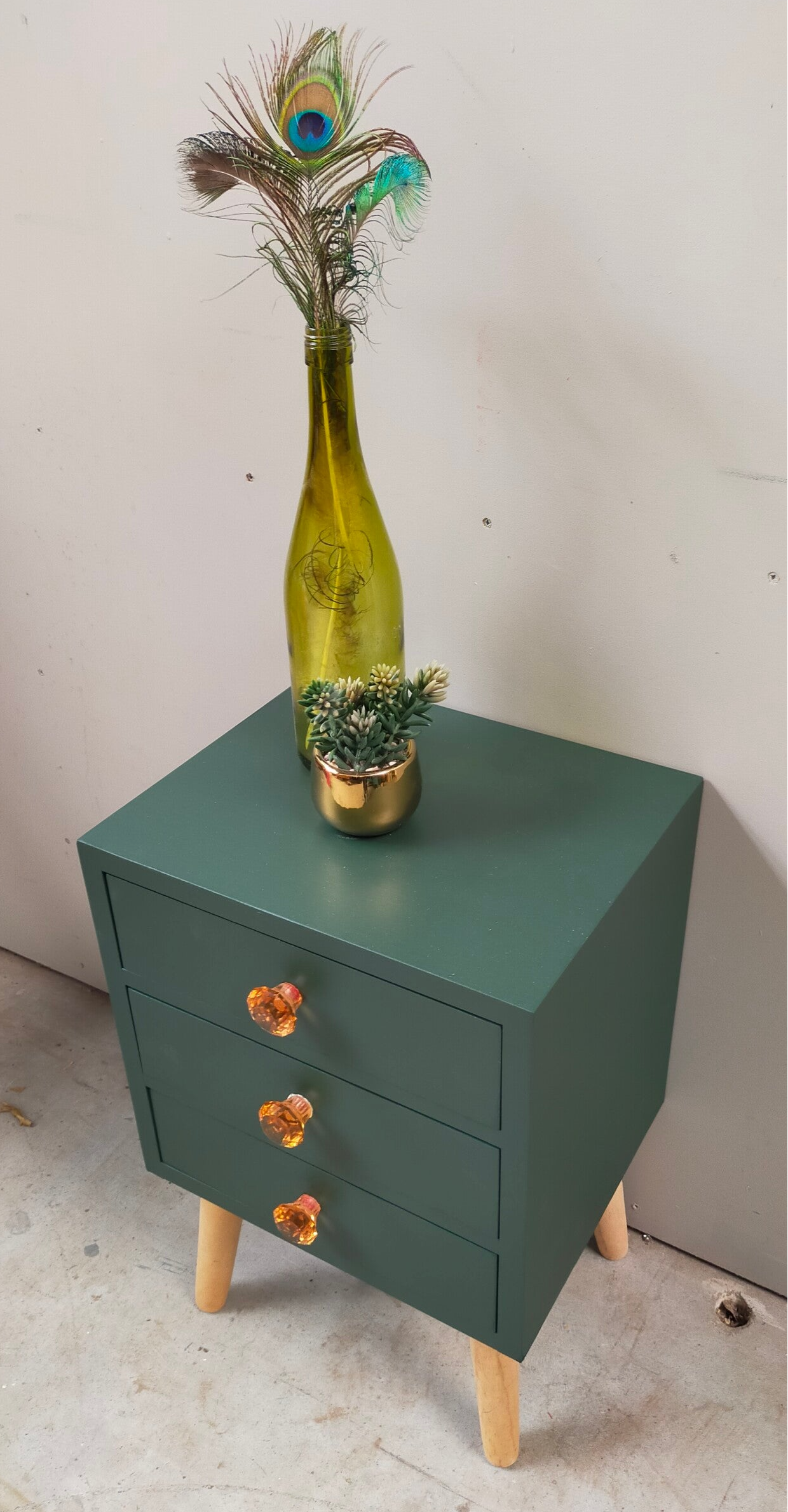 Een licht gewicht dit vintage vormgegeven kastje, maar dat maakt hem of haar niet minder leuk en mooi. Een echte blikvanger zo in de diep donker groene tint, Manor Green, van Fusion Mineral Paint. Op de laatjes hebben we subtiele, maar bijpassende, knopjes gezet, wat het helemaal van nu maakt en ook de binnenzijde van de laadjes combineert fijn met het geheel.