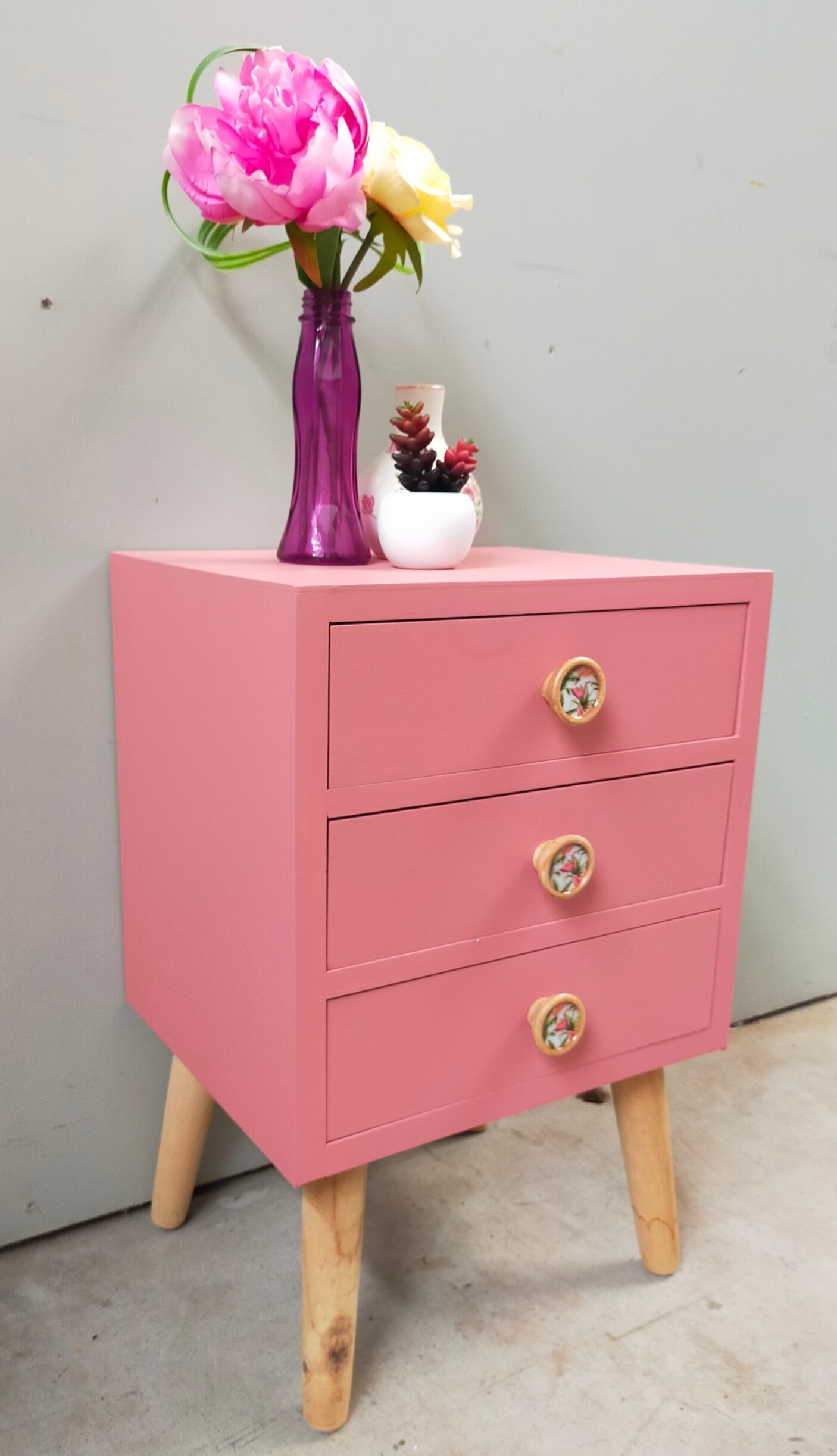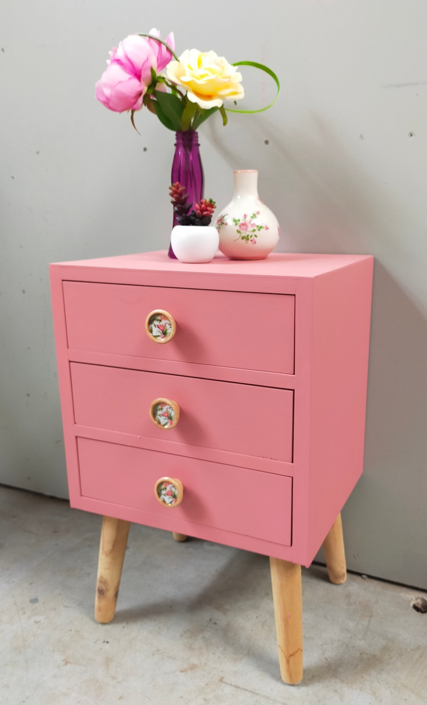 Een licht gewicht dit vintage vormgegeven kastje, maar dat maakt hem of haar niet minder leuk en mooi. Een echte blikvanger zo in de mooie zacht roze kleur, wat een mix is 2 kleuren van Fusion Mineral Paint. Op de laatjes hebben we subtiele, maar bijpassende, knopjes gezet, wat het helemaal van nu maakt en ook de binnenzijde van de laadjes combineert fijn met het geheel.