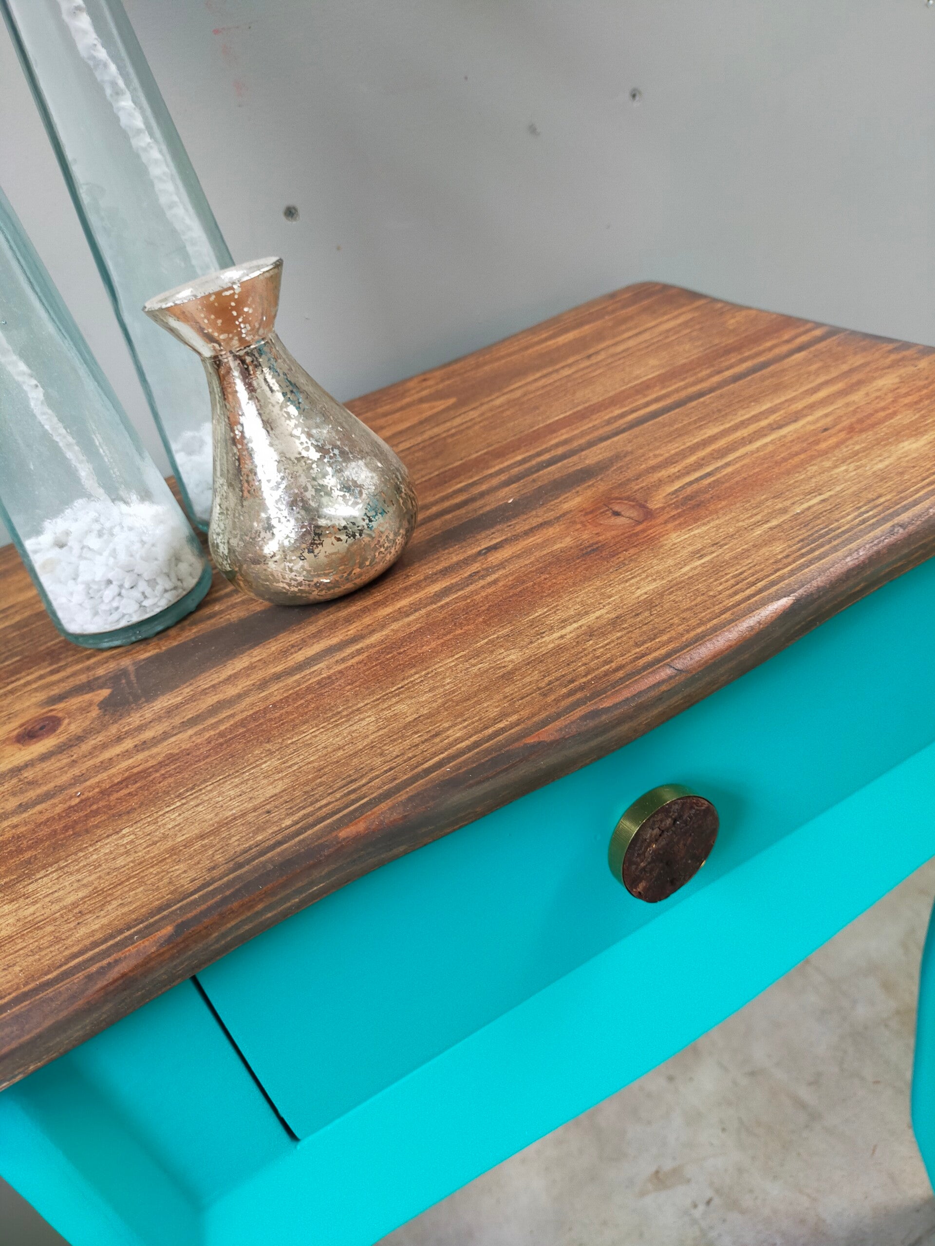 Een heerlijk fris en vrolijk tafelkastje in de kleur Azure van Fusion Mineral Paint. Het blad heeft een mooie cappuccino afwerking gekregen en het laatje een bijpassende knop.