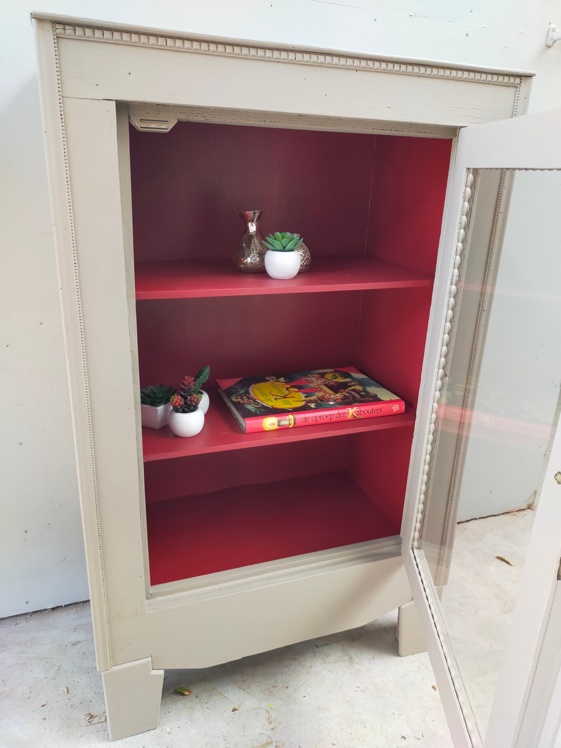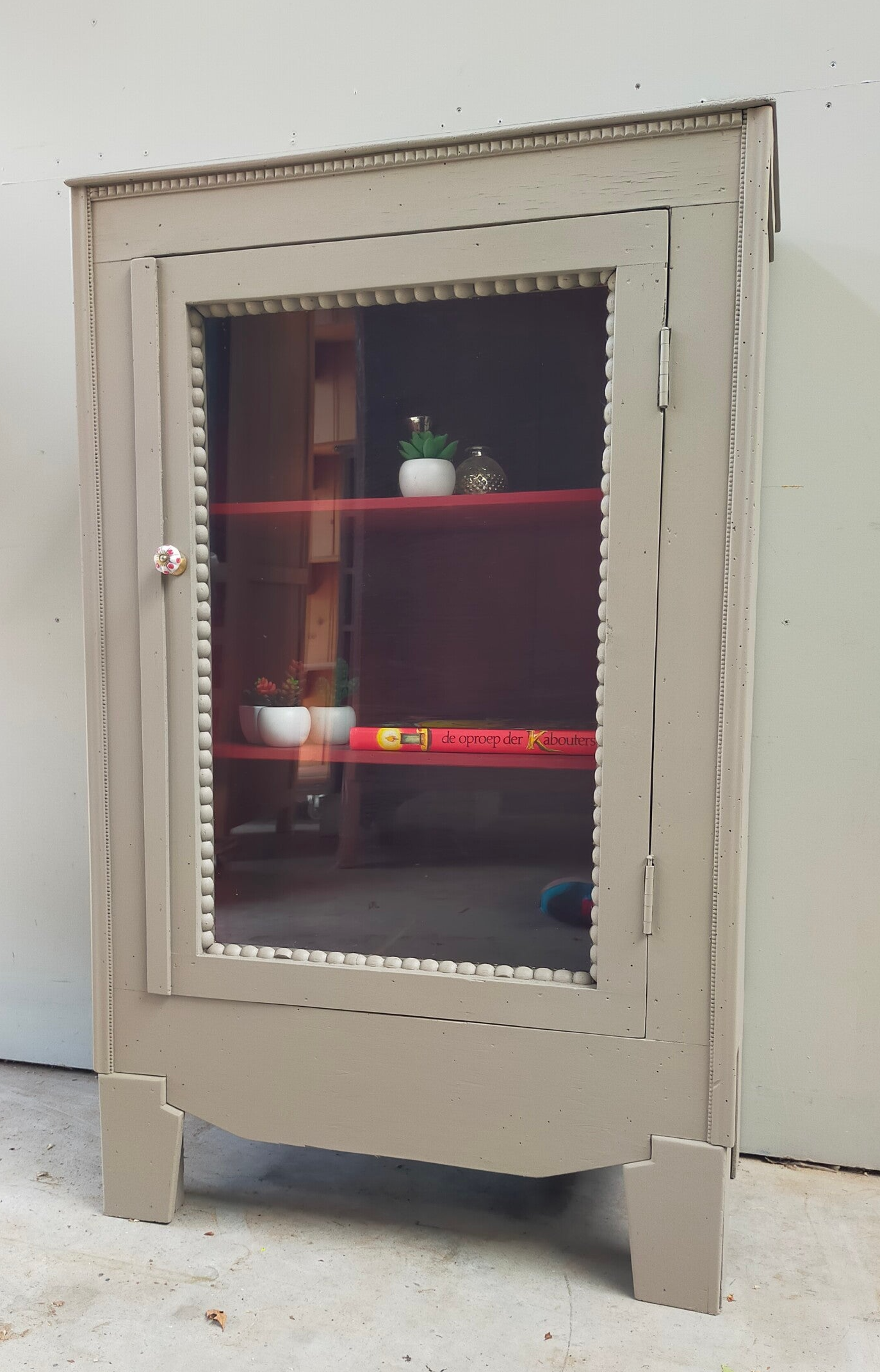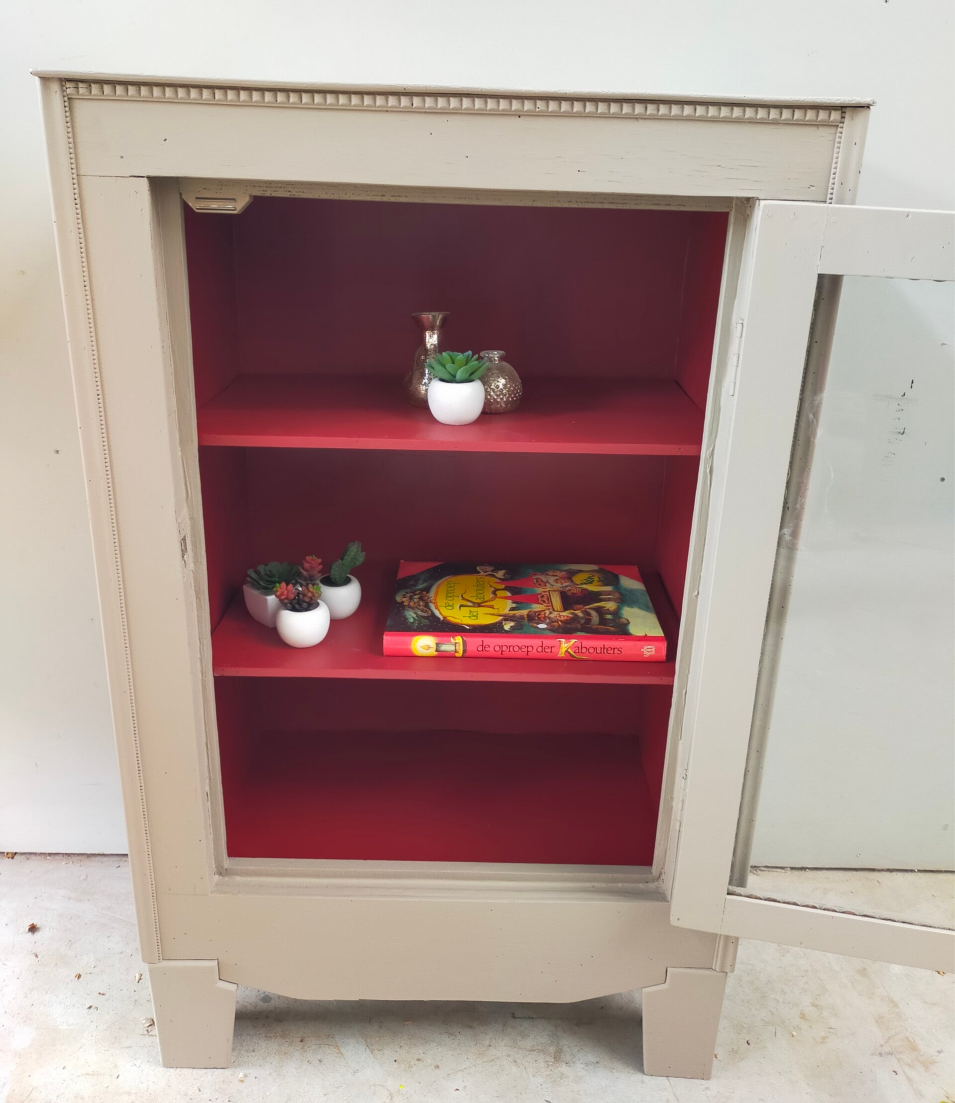 Een vitrinekastje en wat voor eentje ! Zeer mooi en bijzonder vormgeven, prachtige details en gezien de leeftijd van deze dame nog in goede conditie. Uiteraard kan het niet anders dan dat de tijd zijn sporen heeft achter gelaten, maar dit is zeker niet storend. Functioneel is deze mooie dame zeker nog. De kleur aan de buitenzijde is een warme taupe tint van Fusion Mineral Paint, en de binnenzijde staat in eendiep rode tint.