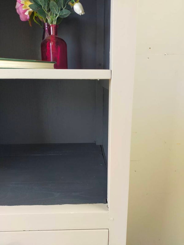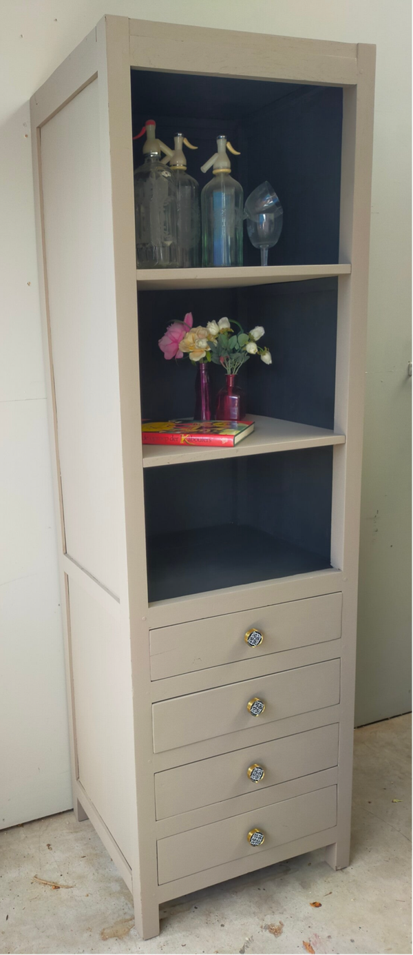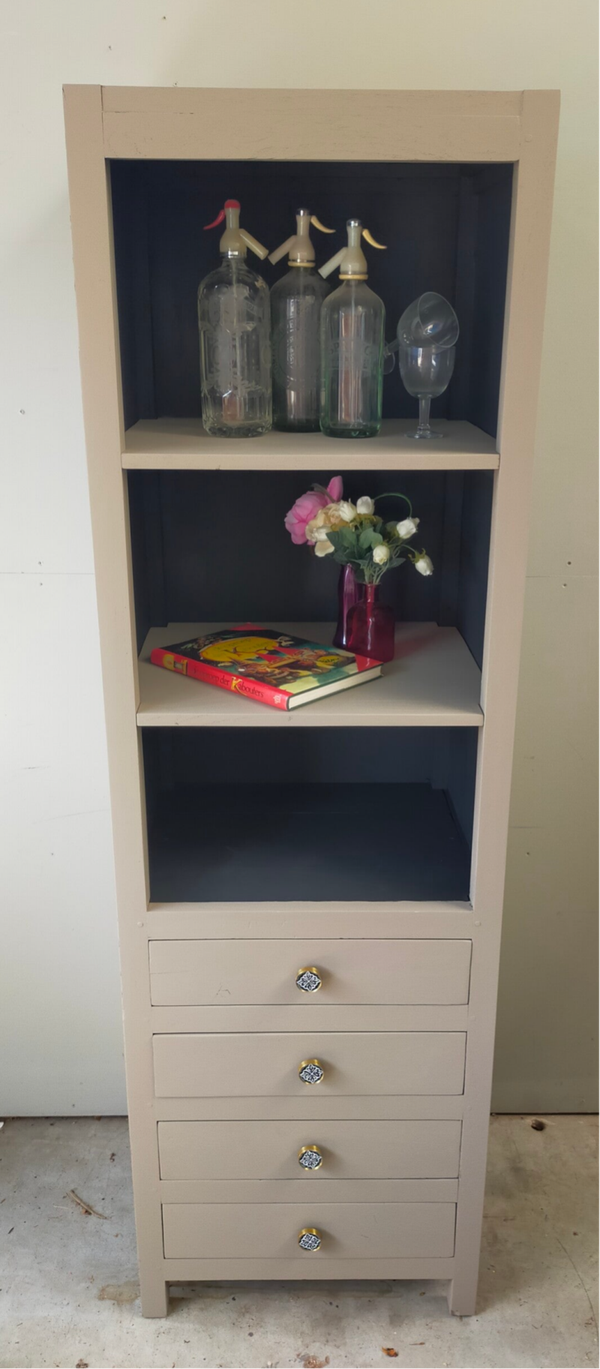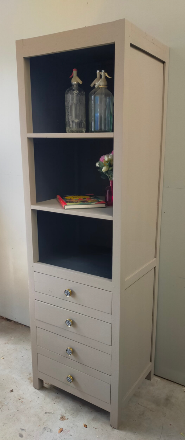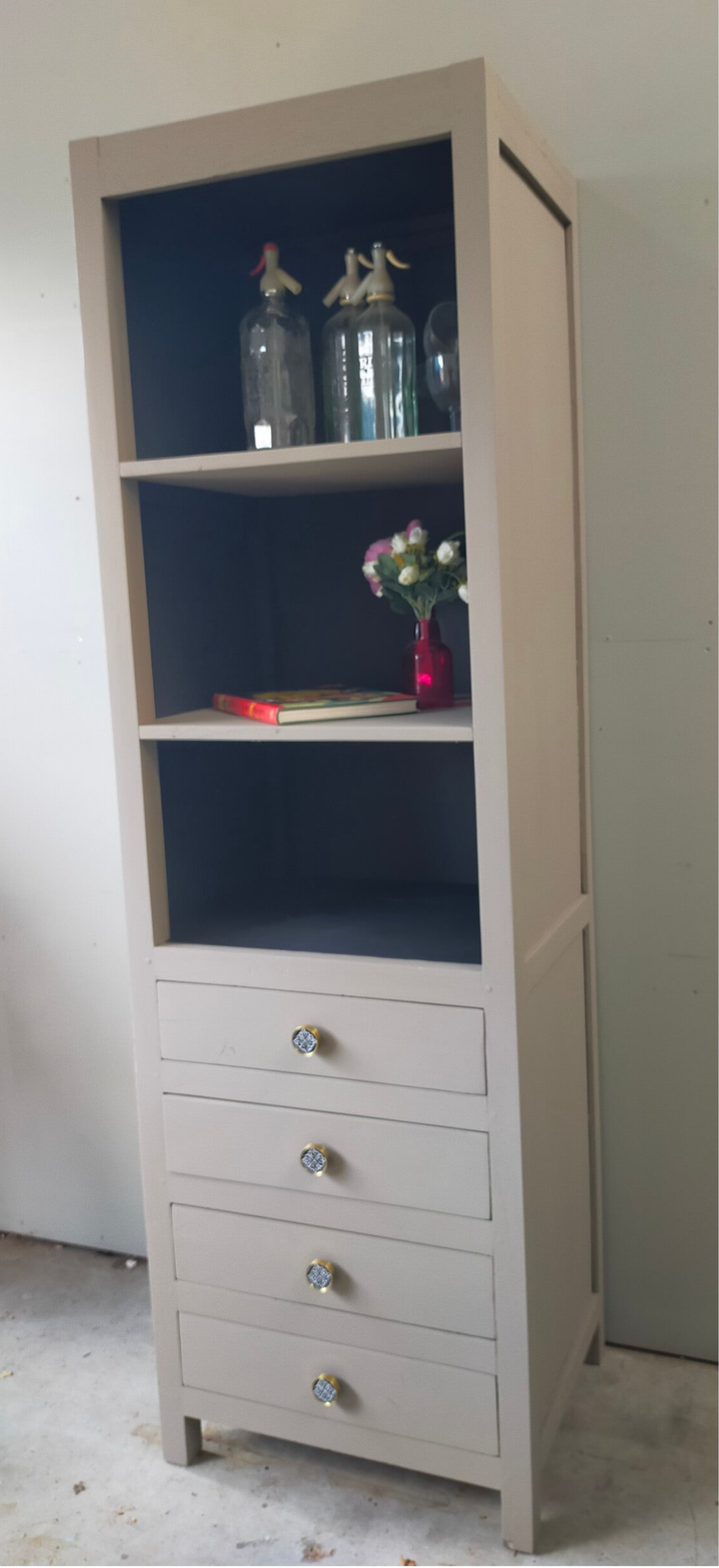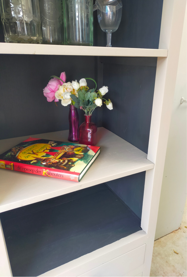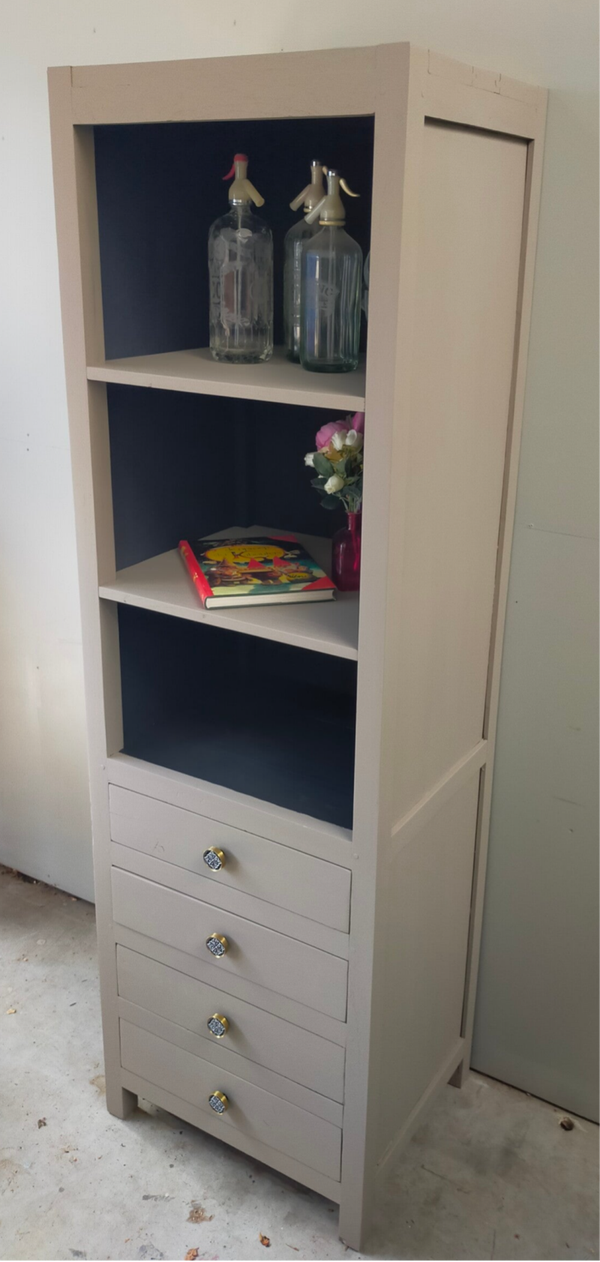 Een, in goede en degelijke staat, boekenkast, kantoorkast, administratie kast enz enz..... genoeg kansen voor deze kanjer toch?! De kleur die gebruikt is een warm taupe van Fusion Mineral Paint alsmede een warm zwart. Het contrast wat deze tinten maken werkt voor dit model wat ons betreft echt prima. Uiteraard hebben we bijpassende knoppen op de lades gezet, zodat het geheel helemaal af is.
