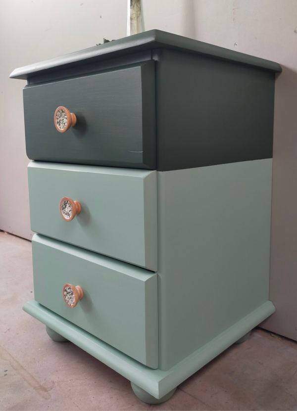 Net even anders als standaard! Twee hele mooie tinten groen van Fusion Mineral Paint, te weten Brook (lekker fris) en Manor Green (diep groen). Ze combineren zeer goed met elkaar en uiteraard zijn er bijpassende knoppen op de lades gezet. Ook hier komen de verschillende groen tinten terug. De laadjes zijn solide, zoals het gehele kastje, en lopen prima.