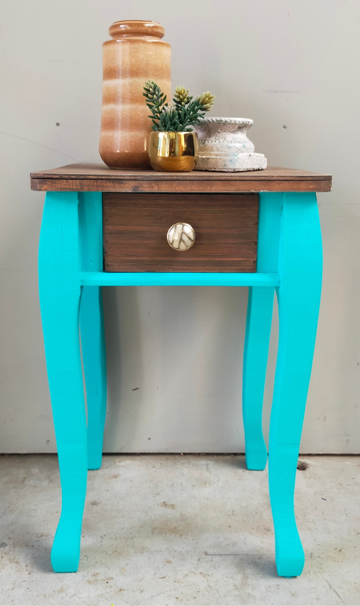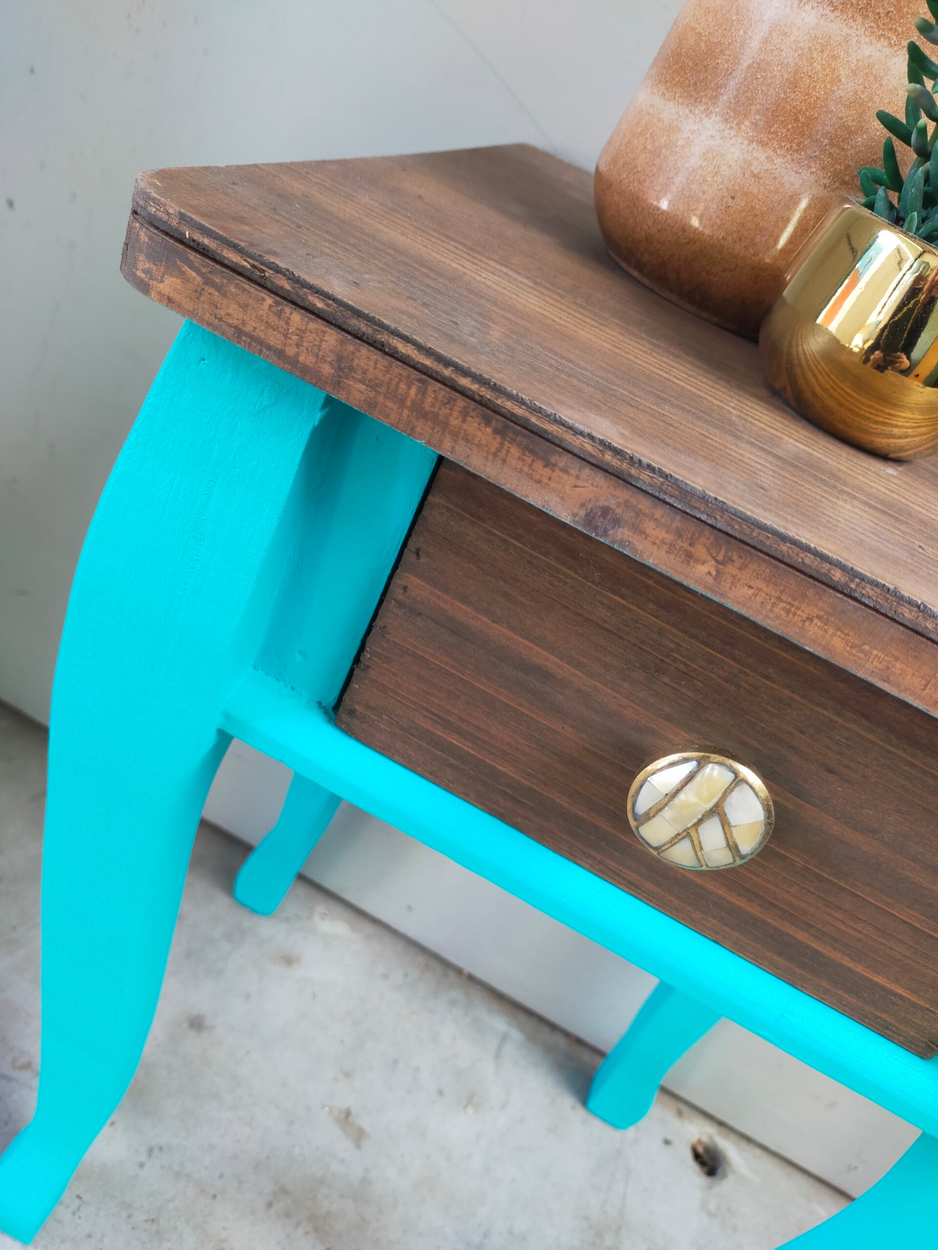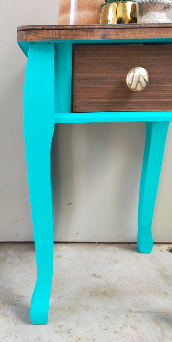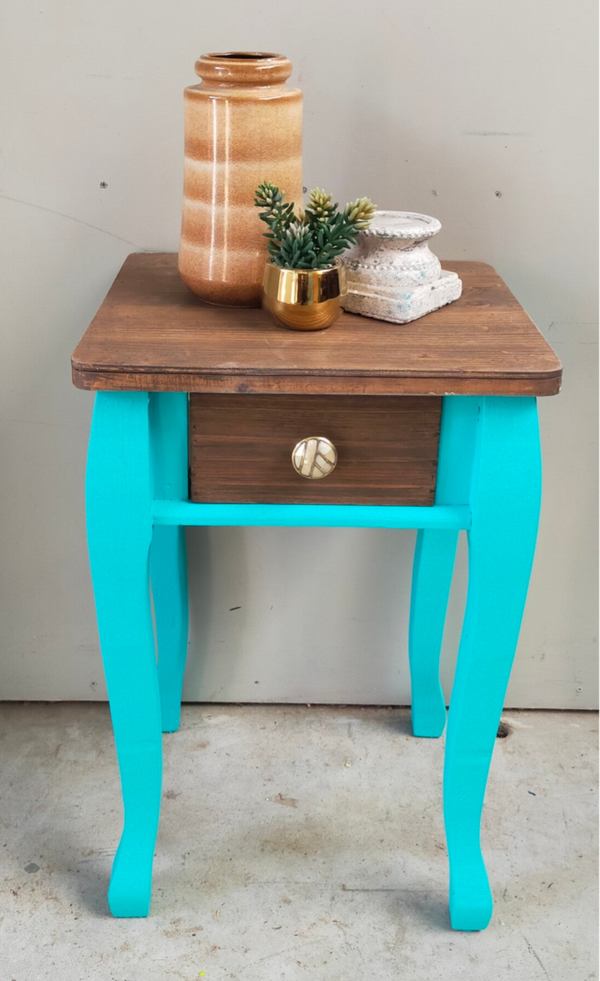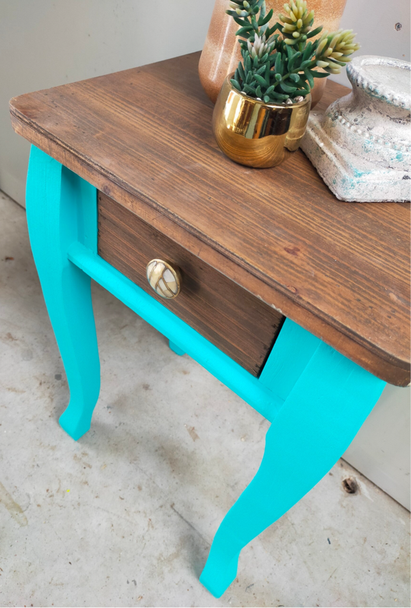 Een heerlijk fris en vrolijk tafelkastje in de kleur Azure van Fusion Mineral Paint. Het blad en laatje heeft een mooie matte cappuccino afwerking gekregen en het laatje een bijpassende knop.