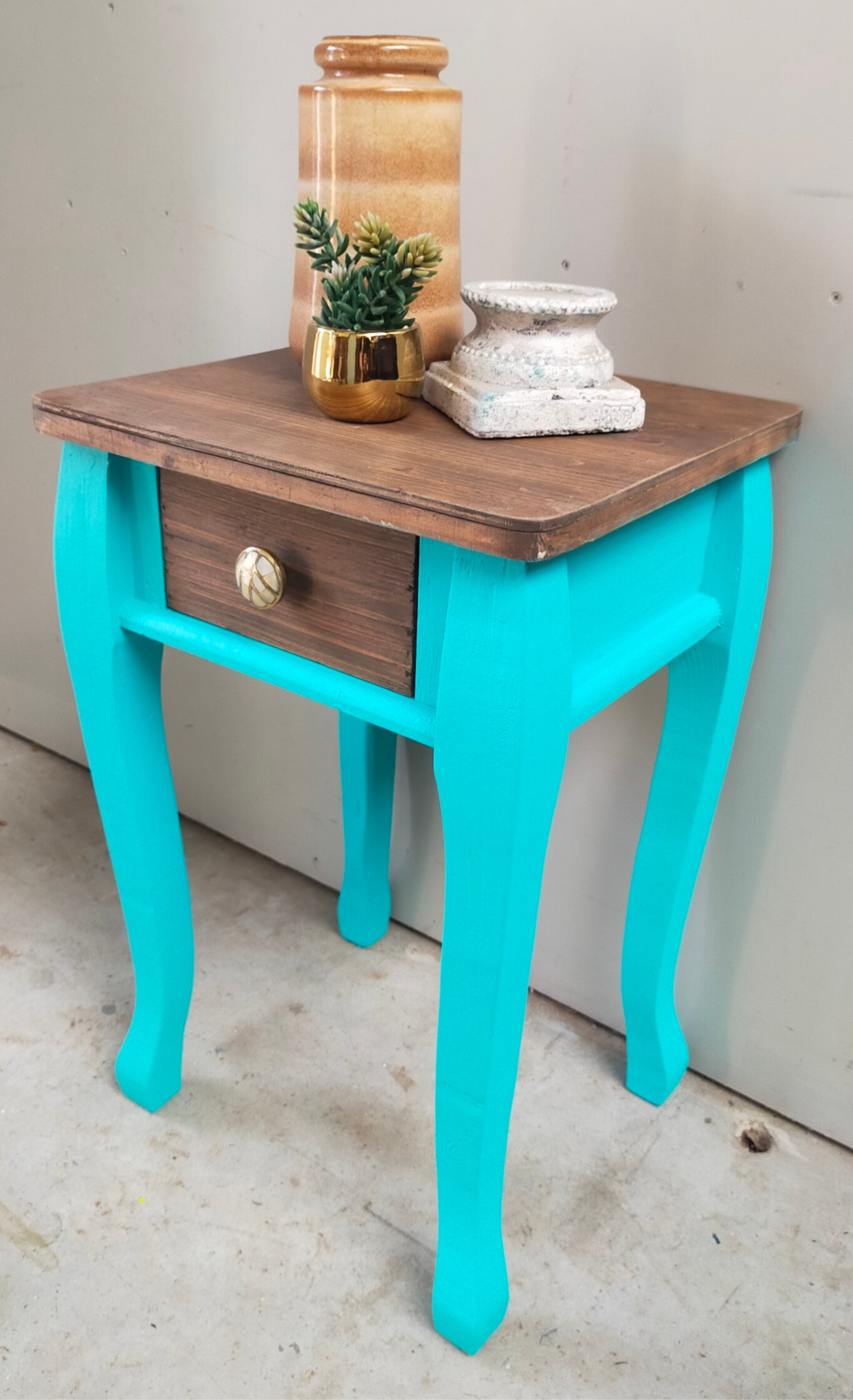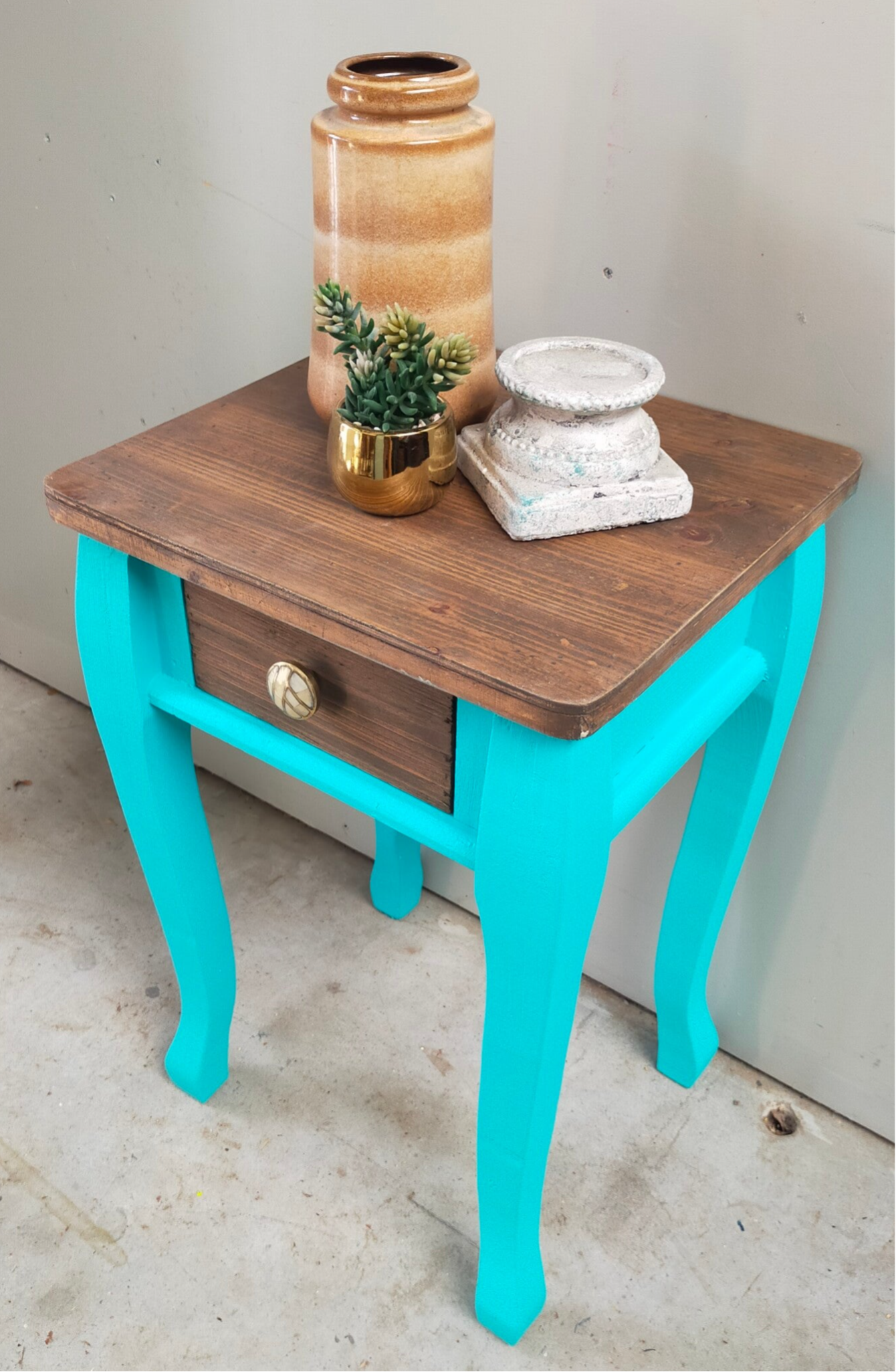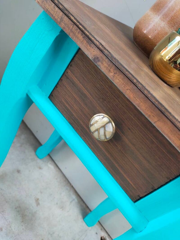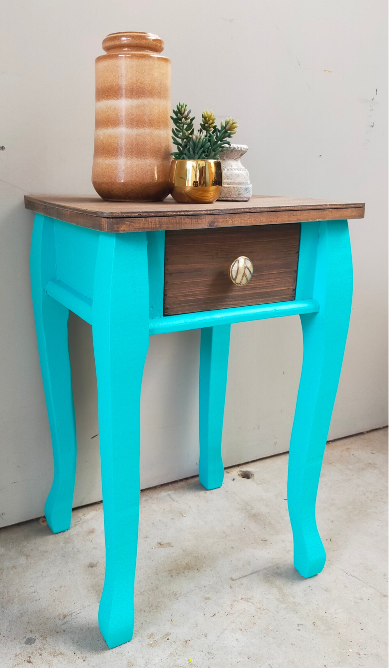 Een heerlijk fris en vrolijk tafelkastje in de kleur Azure van Fusion Mineral Paint. Het blad en laatje heeft een mooie matte cappuccino afwerking gekregen en het laatje een bijpassende knop.