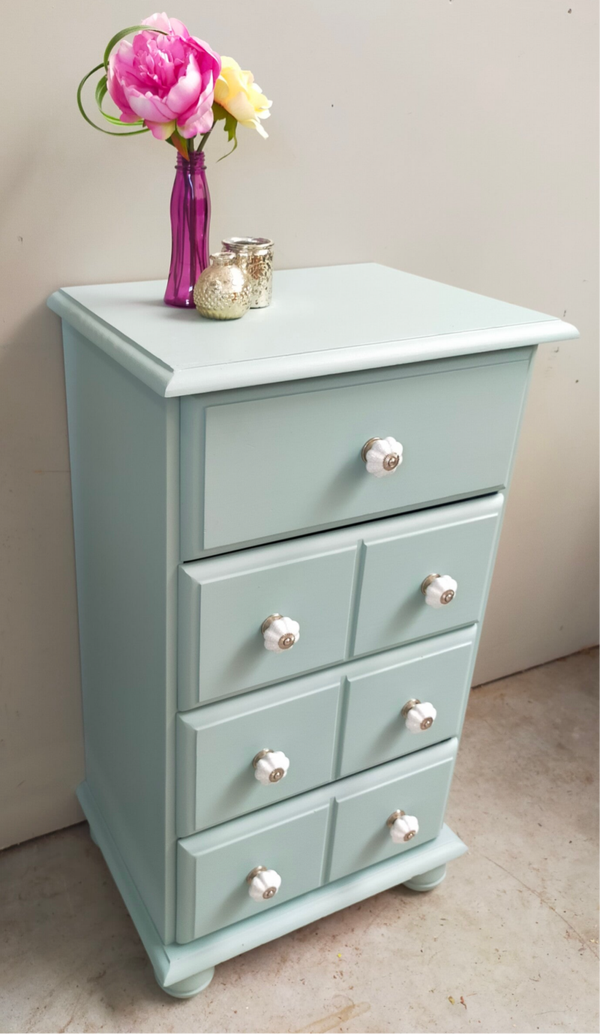 Een zeer solide en mooi model ladenkast. De kleur French Eggshell van Fusion Mineral Paint is hier gebruikt. Deze kleur laat zich het beste omschrijven als een fris blauwe kleur. Dit gecombineerd met frisse en leuke porseleinen knoppen maakt dit een prettig geheel. De lades geven een hoop opbergruimte en lopen allen prima.