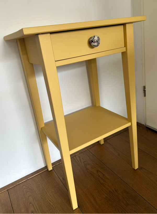 Deze sidetable is qau afmetingen bescheiden waardoor je al snel een plekje voor hem hebt. De afwerking is gedaan met de kleur Prairie Sunset van Fusion Mineral Paint. Een frisse geel tint en op de lade is een mooie en bijpassende knop gemonteerd, wat het geheel helemaal afmaakt.