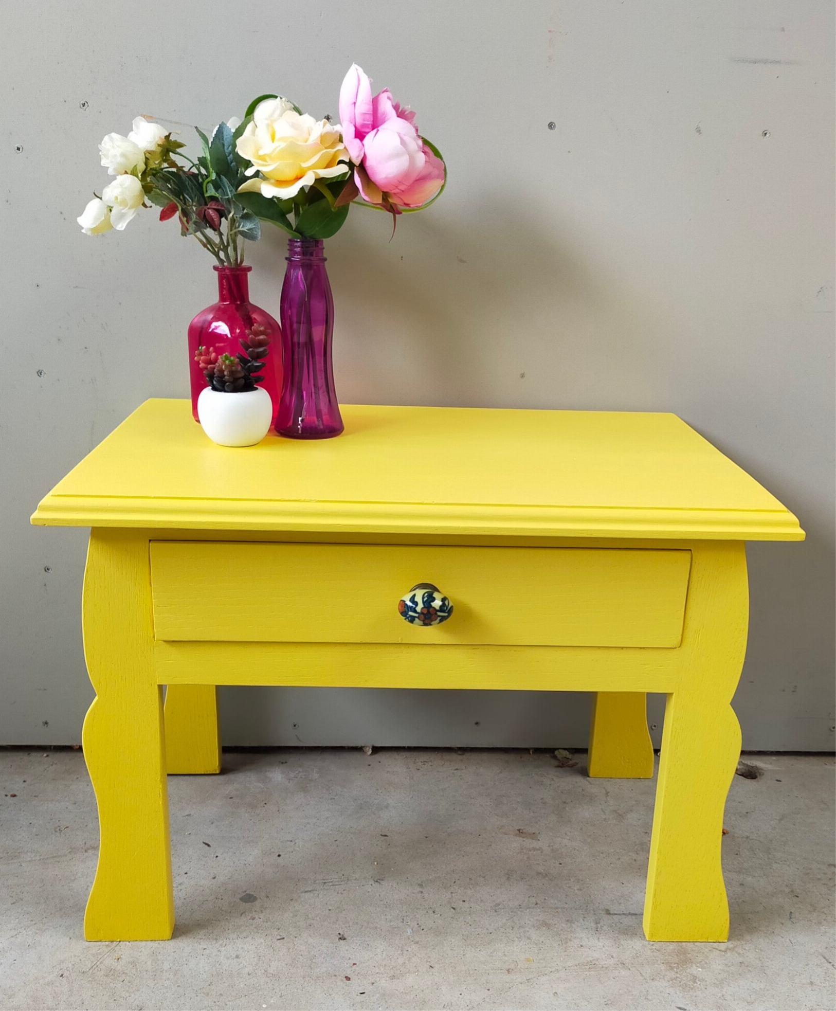 Hier raak je toch gelijk vrolijk van? De kleur Little Star van Fusion Mineral Paint is echt een heerlijk fris en gezellige kleur geel. De knop op het laatje hebben we hier op afgestemd en ook de binnenzijde is een vrolijke boel. Super leuk als nachtkastje op de kinderkamer, maar ook heerlijk met een mooie plant er op in de woonkamer. Nou.....genoeg opties wat ons betreft!