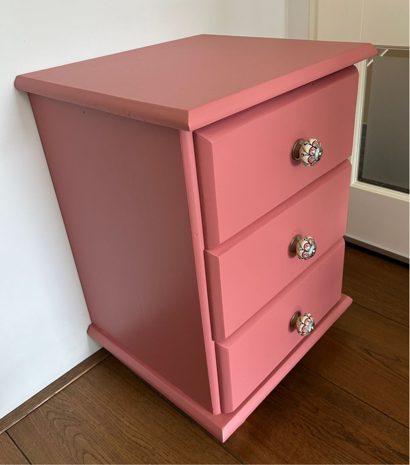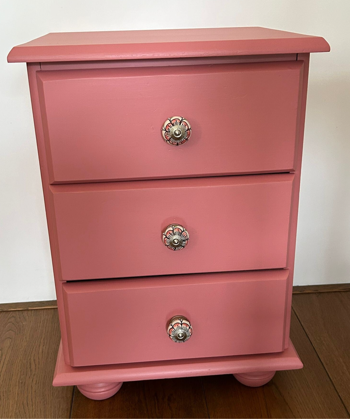 Een snoet van een kastje, zeker in deze kleur. Helemaal vrolijk, er is hier gekozen om 2 kleuren van Fusion in de mix te doen, met dit als super fijn resultaat. De laatjes zijn voorzien van mooie bijpassende knopjes. Een solide kastje met fijn wat laatjes.