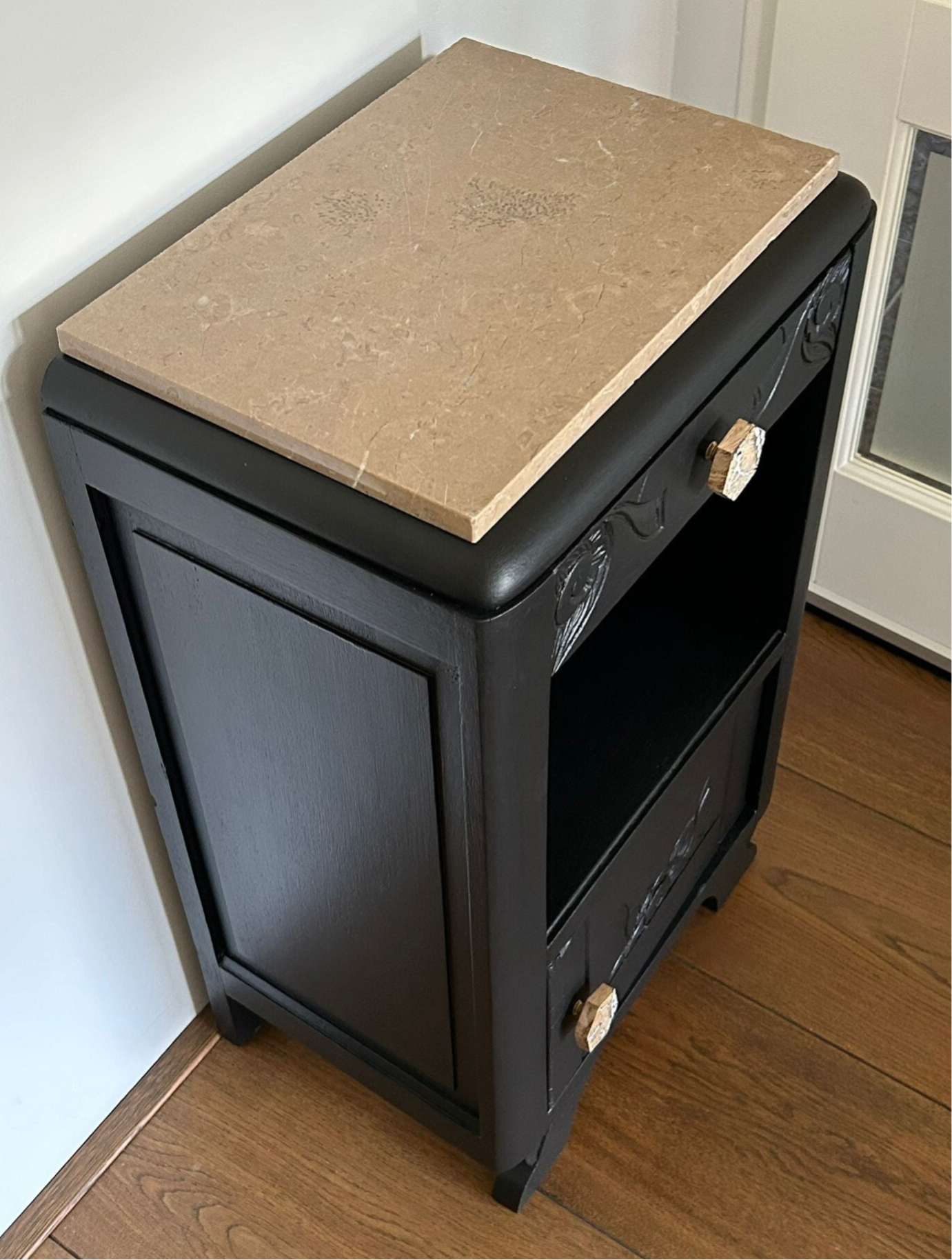 Wat een knappe dame is dit kastje! Prachtig houtsnijwerk, mooie vormgeving en wat ons betreft een lust voor het oog. De kleur is Coal Black en is intens zwart. De combinatie met het mooie natuurstenen blad en de bijpassende knoppen, maken het een prachtig geheel. Ondanks haar leeftijd is ze echt nog in topvorm.