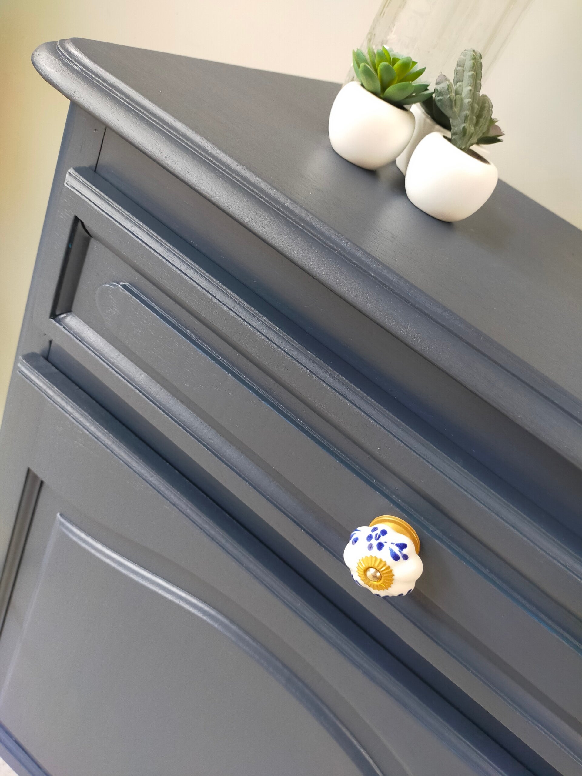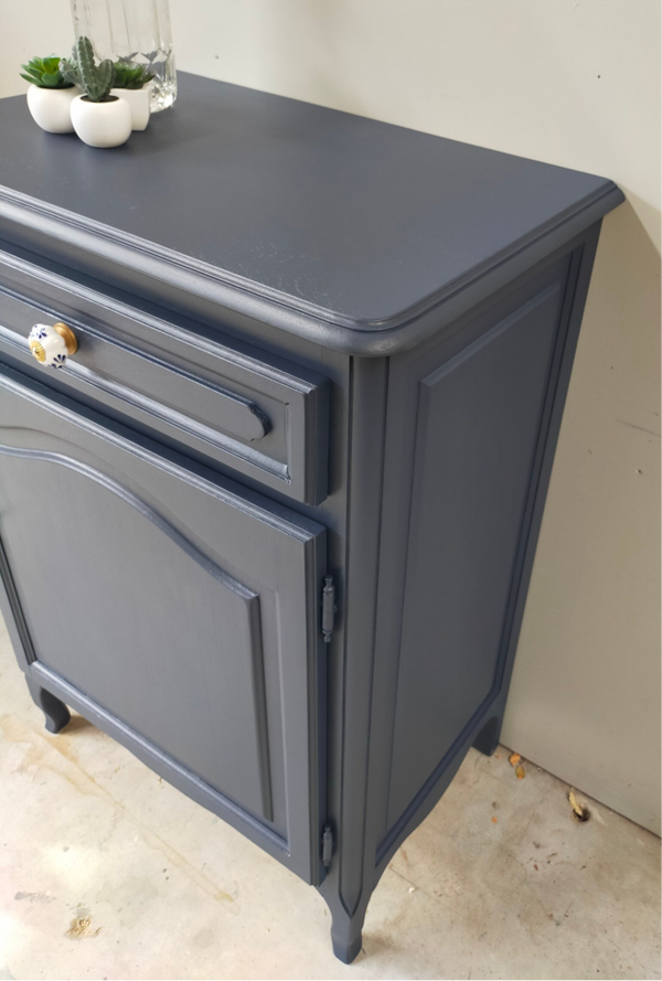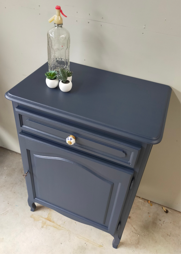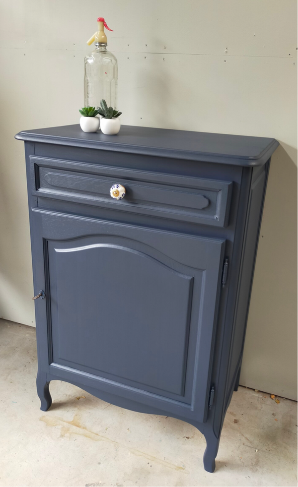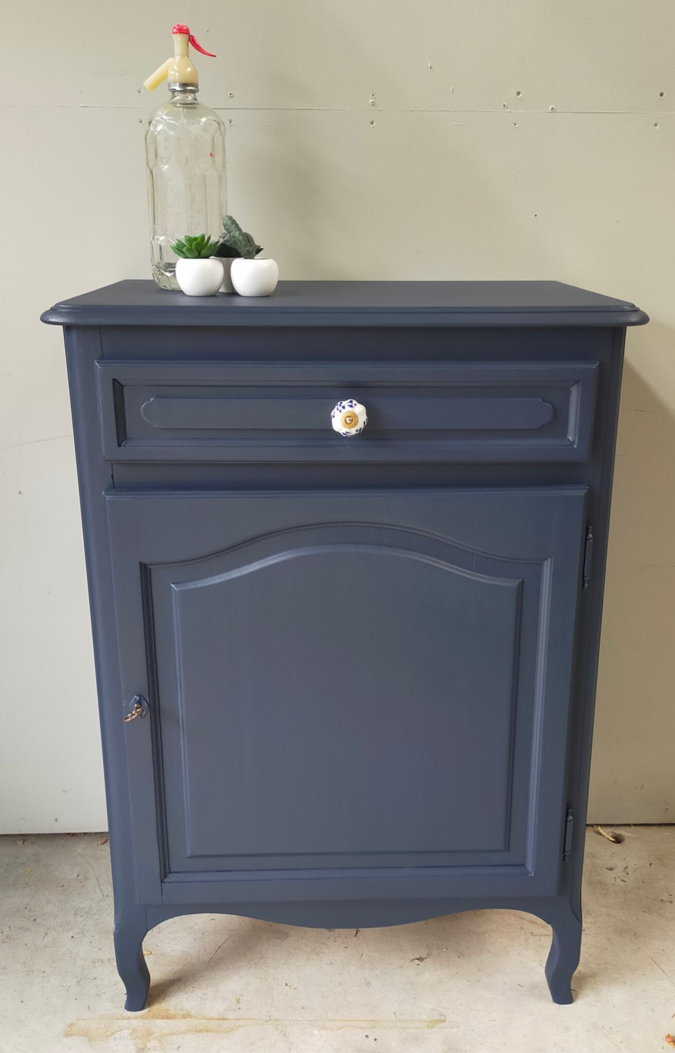 Wat een kanjer dit 1 deurs kastje met haar mooie vormgeving. Een diep donker blauw past hier goed bij. De kleur Midnight Blue van Fusion Mineral Paint is hier gebruikt. Dit in combinatie met de fris blauwe binnenkant is dit wat ons betredt een prettig samenkomen. Achter deur een plank en op de lade een toffe knop. Het deurtje sluit met een sleuten en werkend slot.